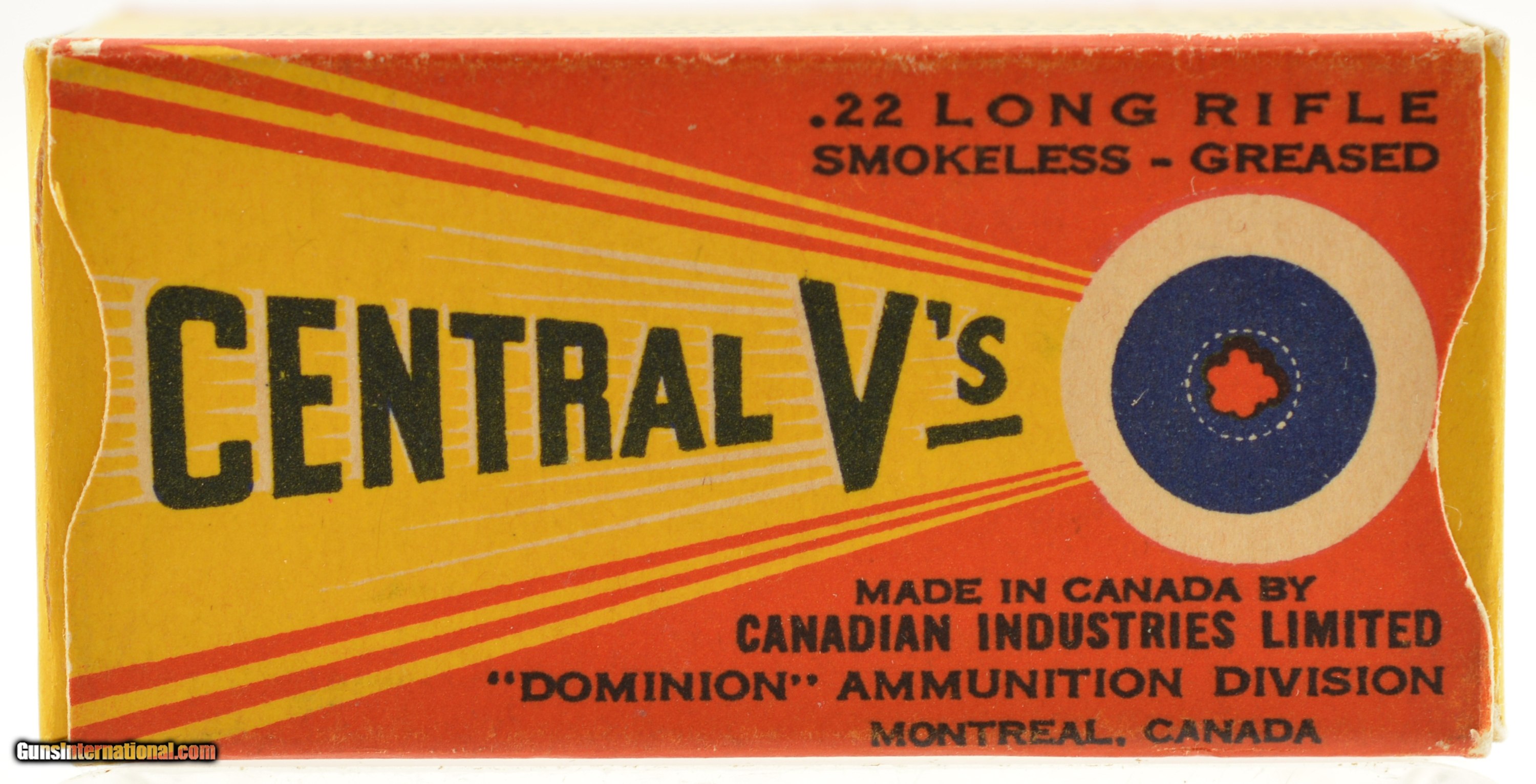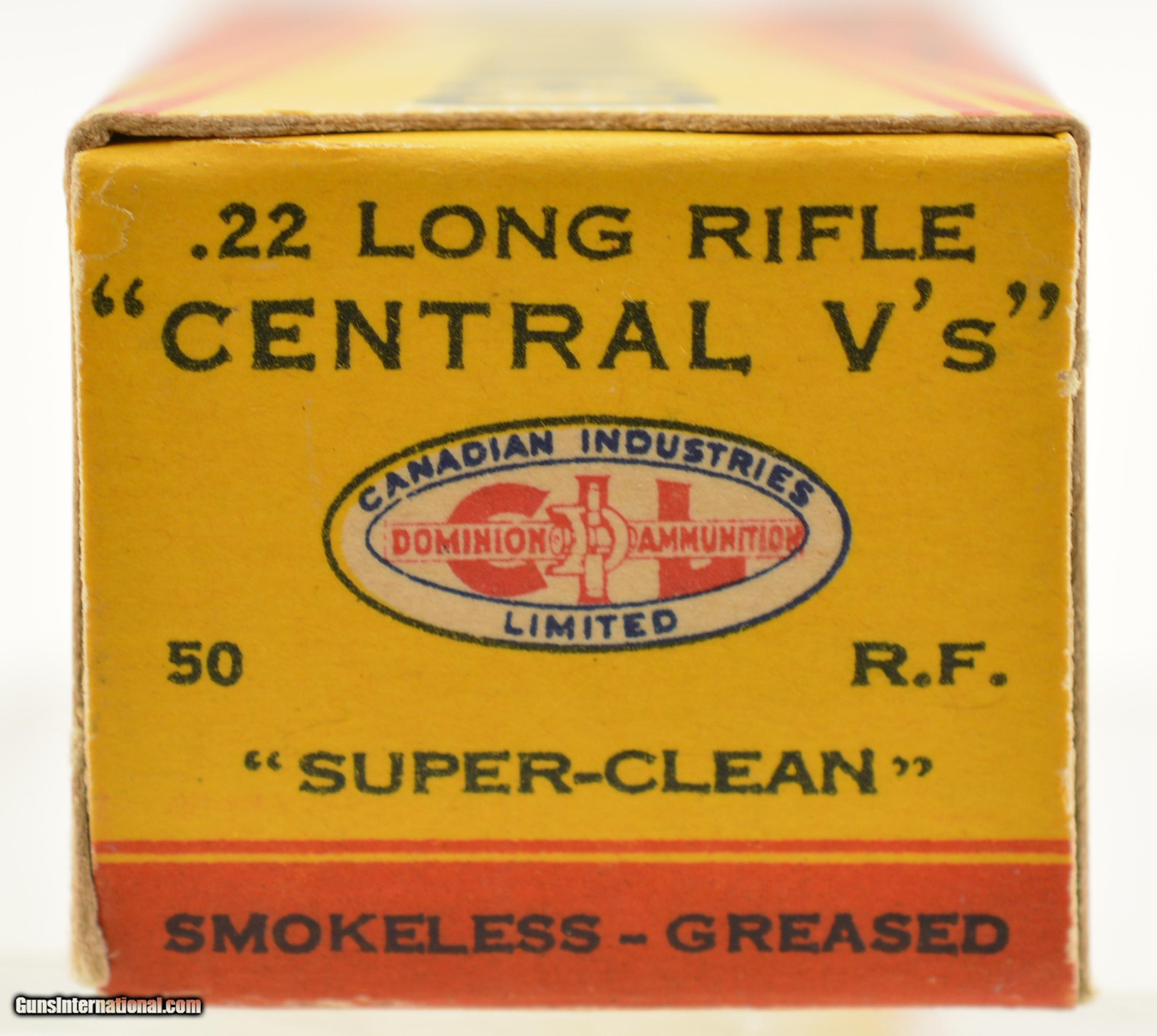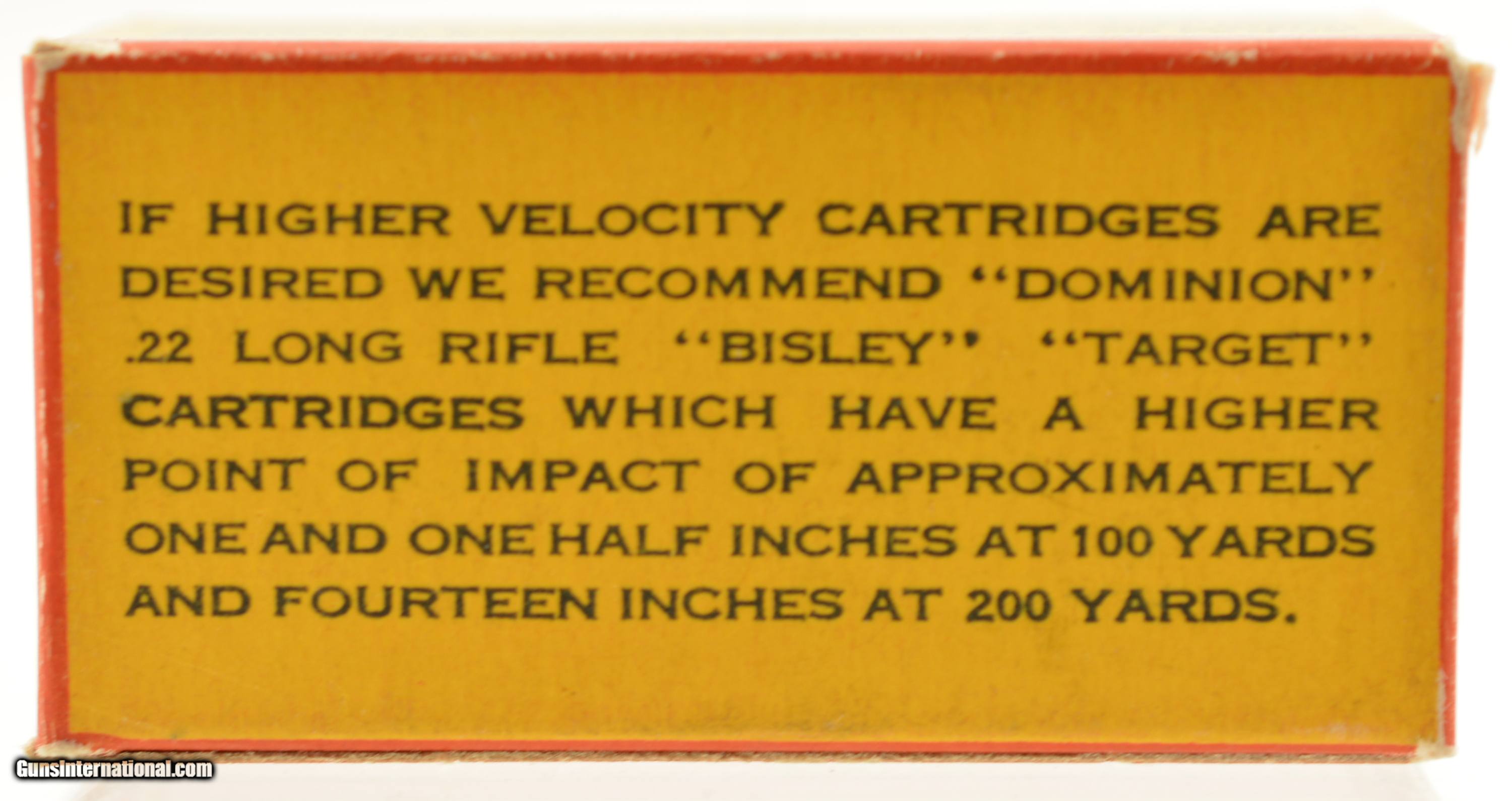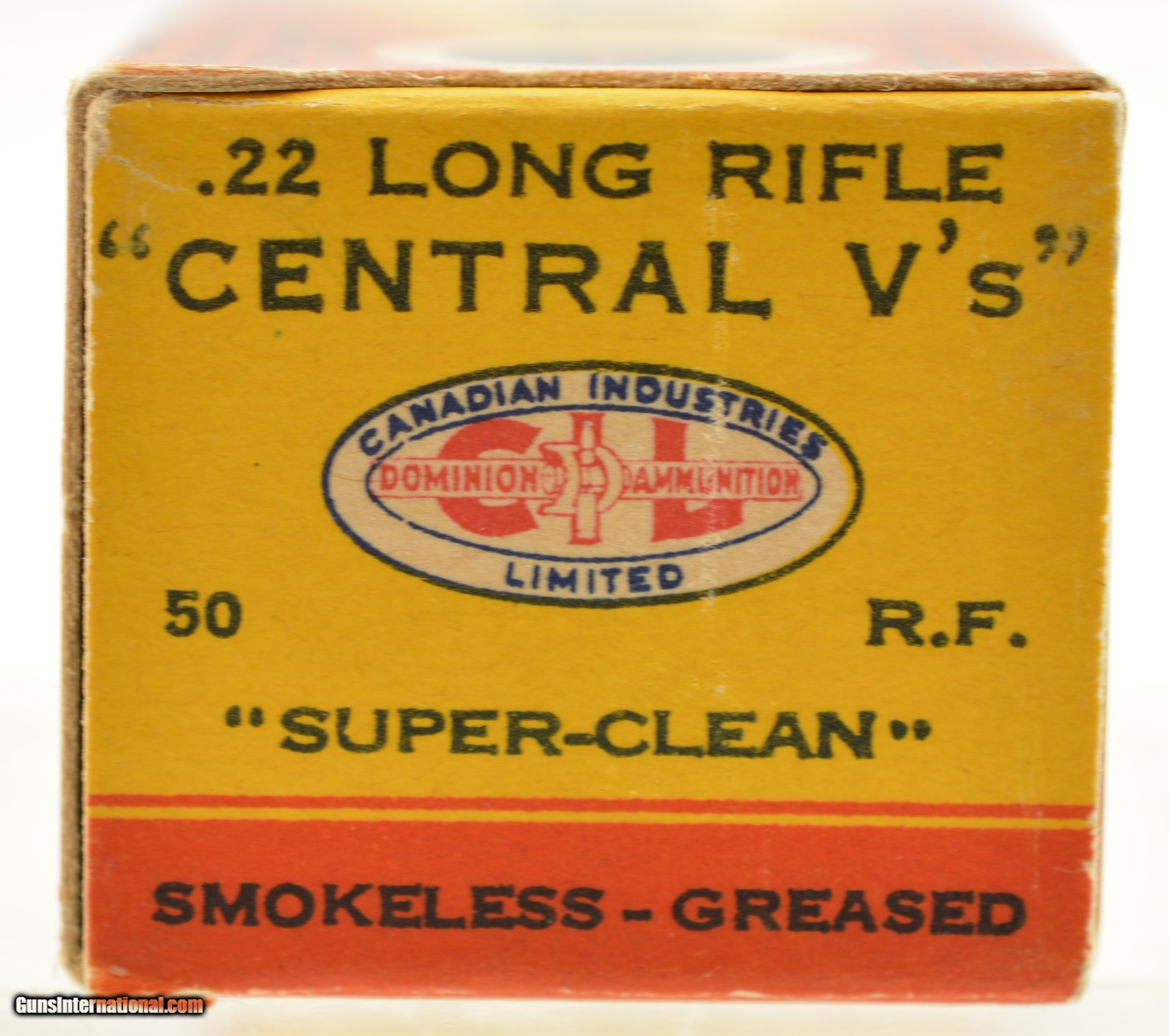 Description: This full 50 round one piece end flap box was introduced in 1937. Box shows very light wear. Contains copper cased ammo with "D" head stamp. Listed in Blyth + Dunn as C1L-4-LR-4. SOLD Manufacturer: CIL Model: Ammo Caliber Info: .22 Gauge Info: .22 |
