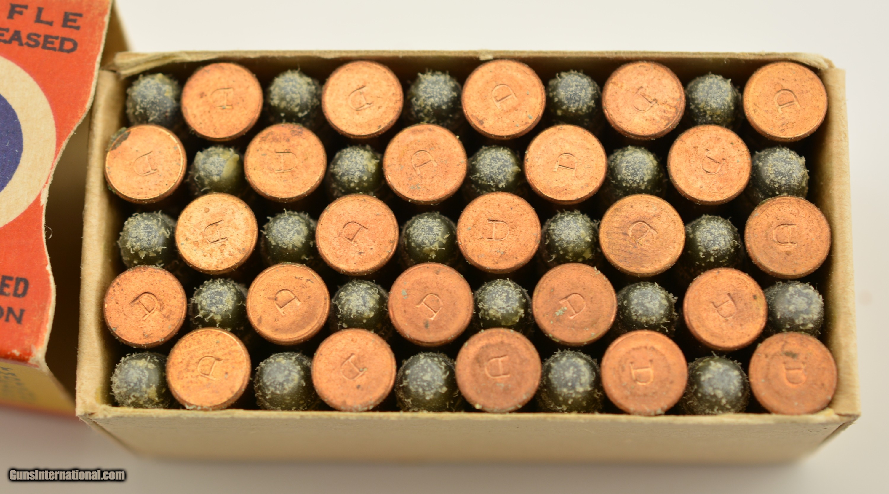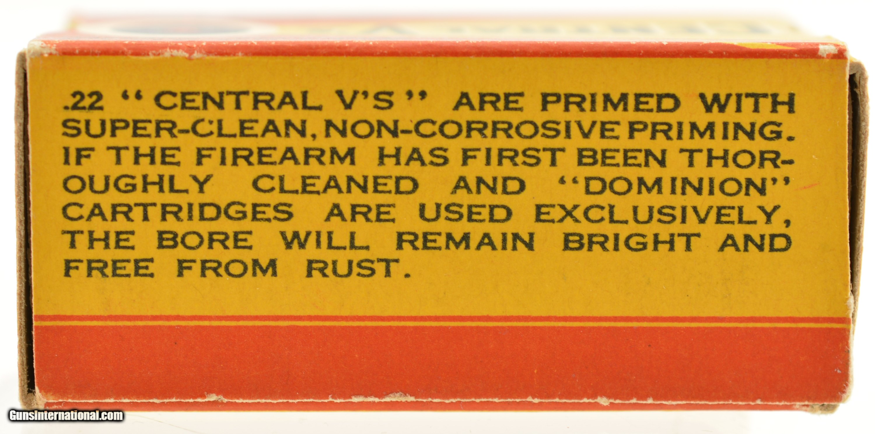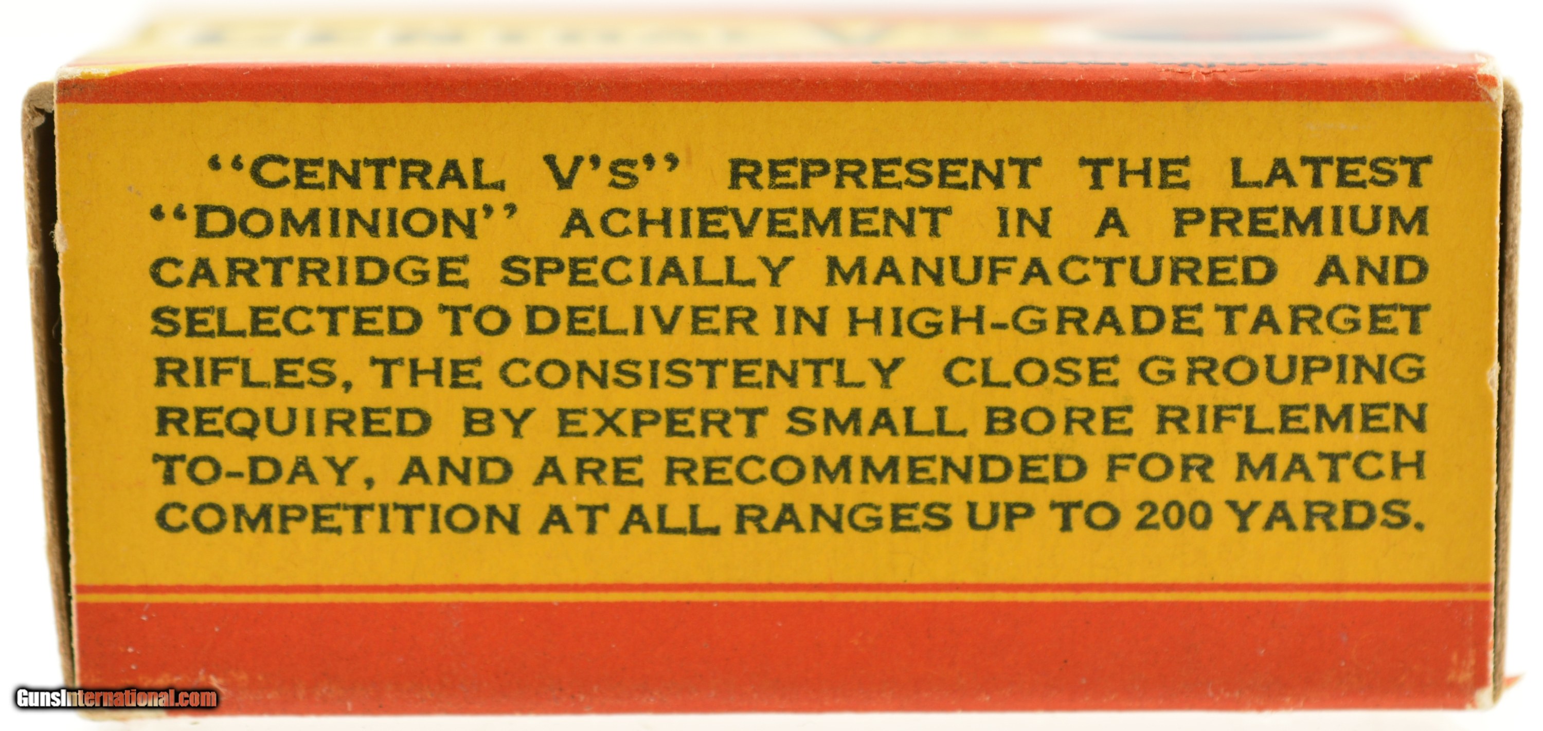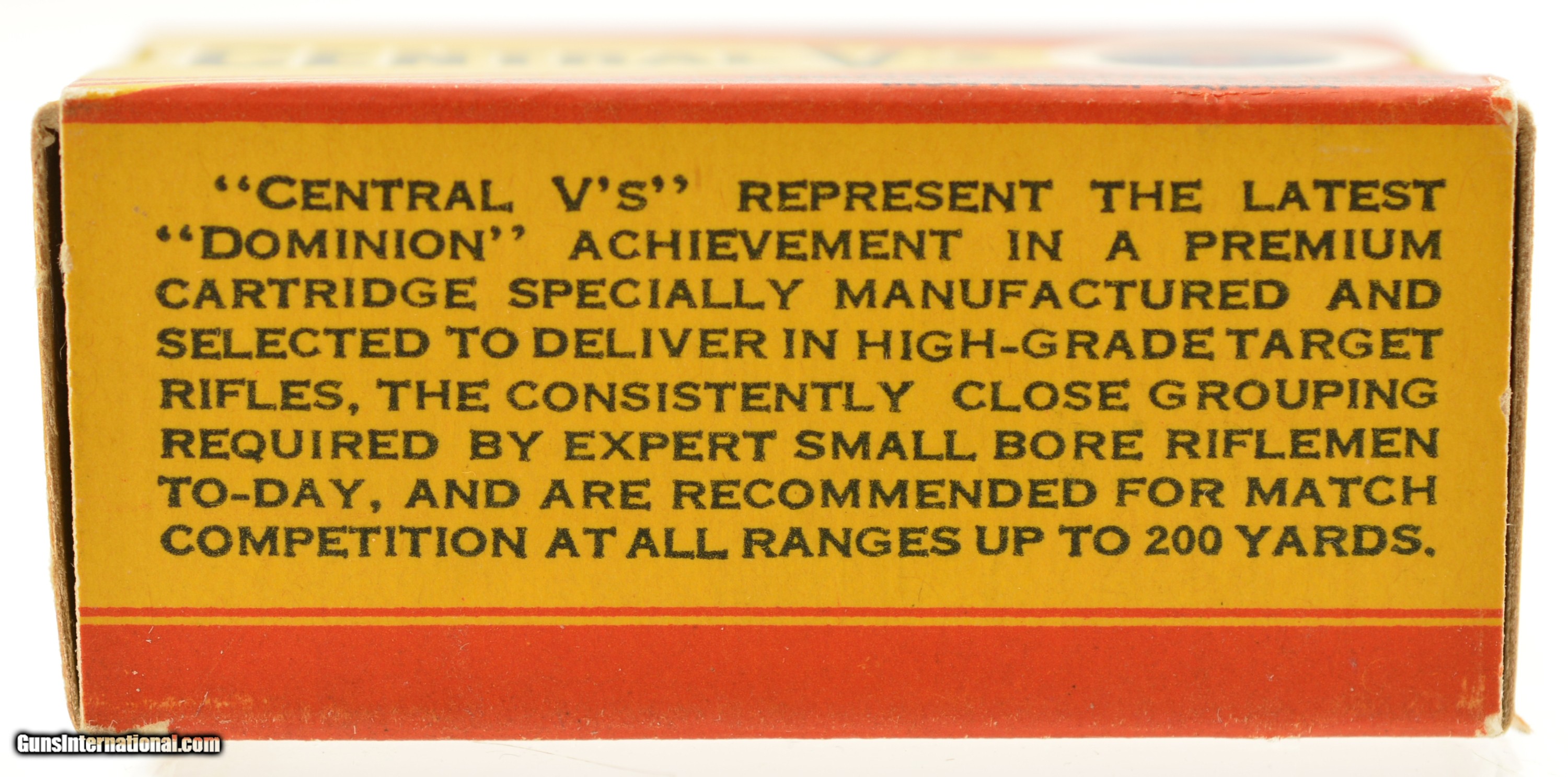 Description: This full 50 round one piece end flap box was introduced in 1937. Box shows very light wear. Contains copper cased ammo with "D" head stamp. Listed in Blyth + Dunn as C1L-4-LR-4. SOLD Manufacturer: CIL Model: Ammo Caliber Info: .22 Gauge Info: .22 |
