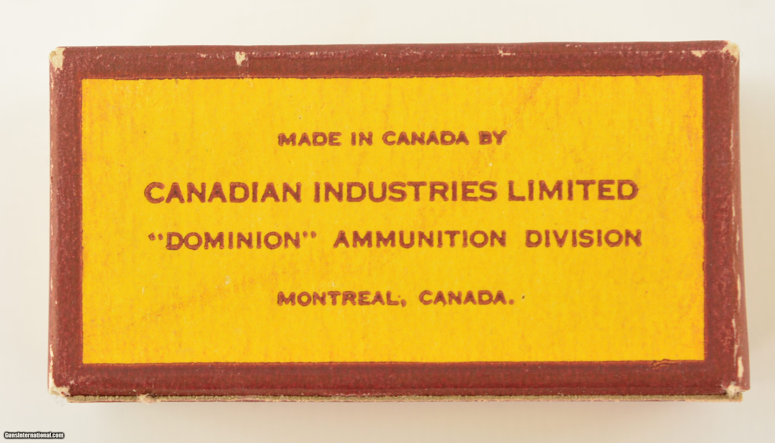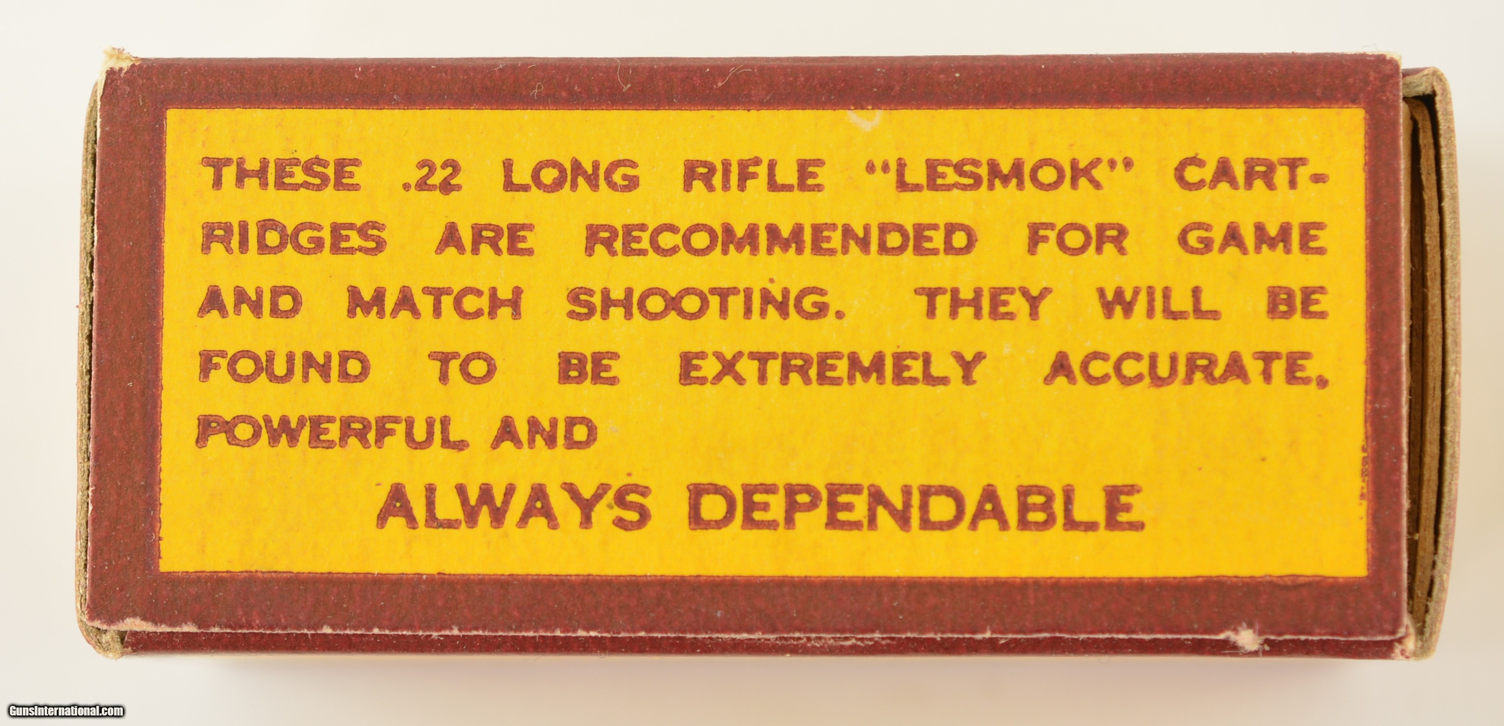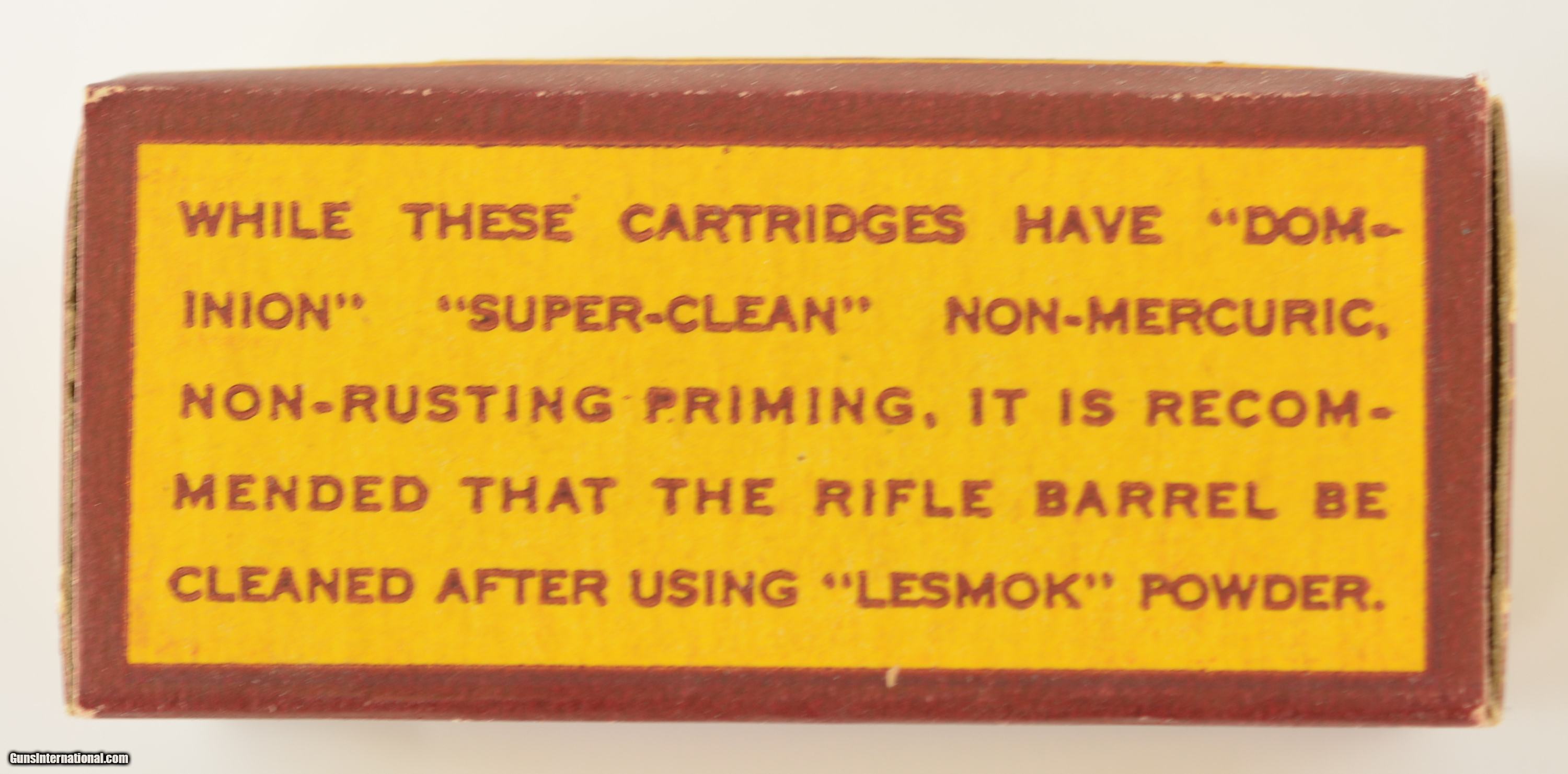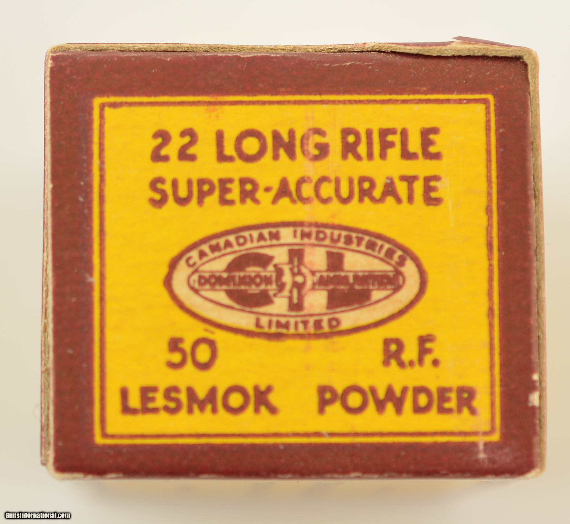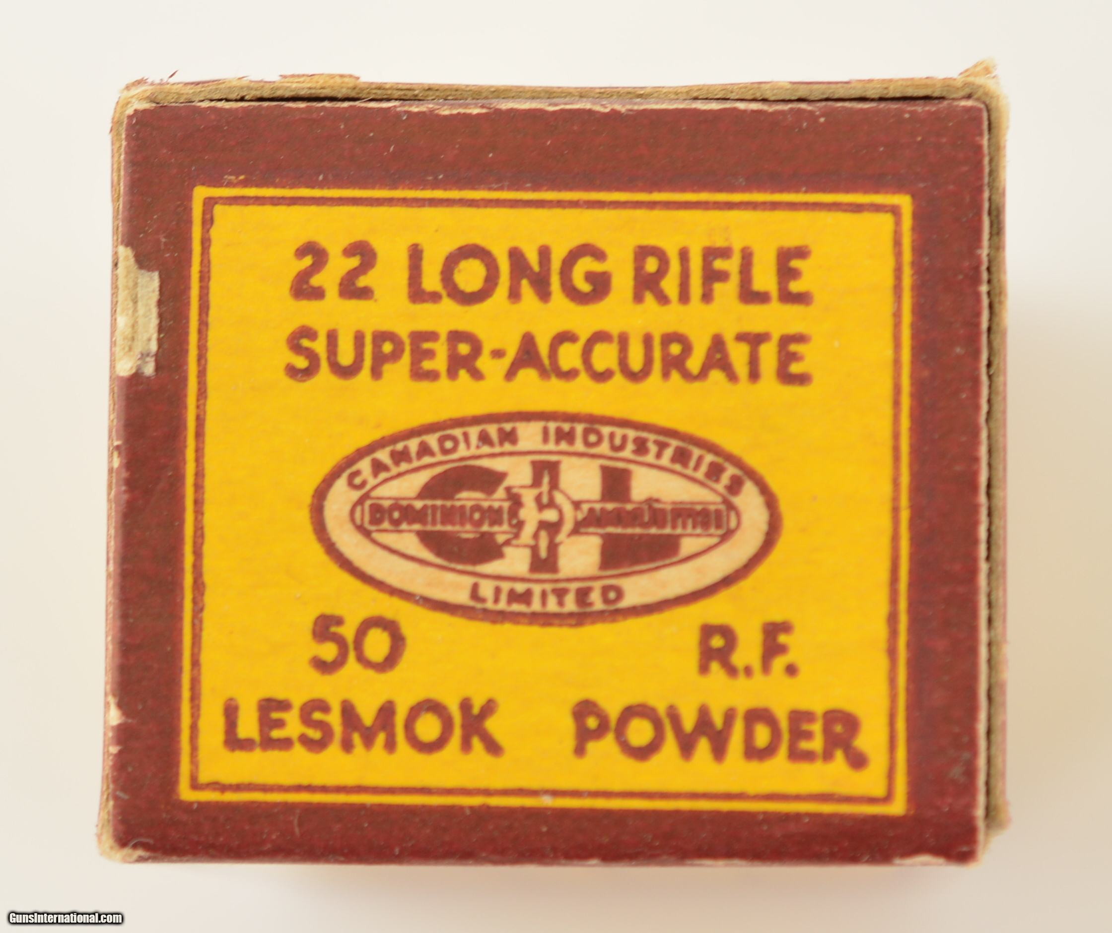 Description: This full 50 round one piece box is the third in the Super-Accurate series issued from 1932 to 1939. Box remains in excellent condition with light wear and bright colors. Box contains lead round nose bullets loaded in copper cases with "D" headstamp. This is one of the last "Lesmok" boxes offered by this maker. Listed in Blyth +Dunn as CIL-4-LR-7. SOLD Manufacturer: CIL Model: Ammo Caliber Info: .22LR Gauge Info: .22LR |