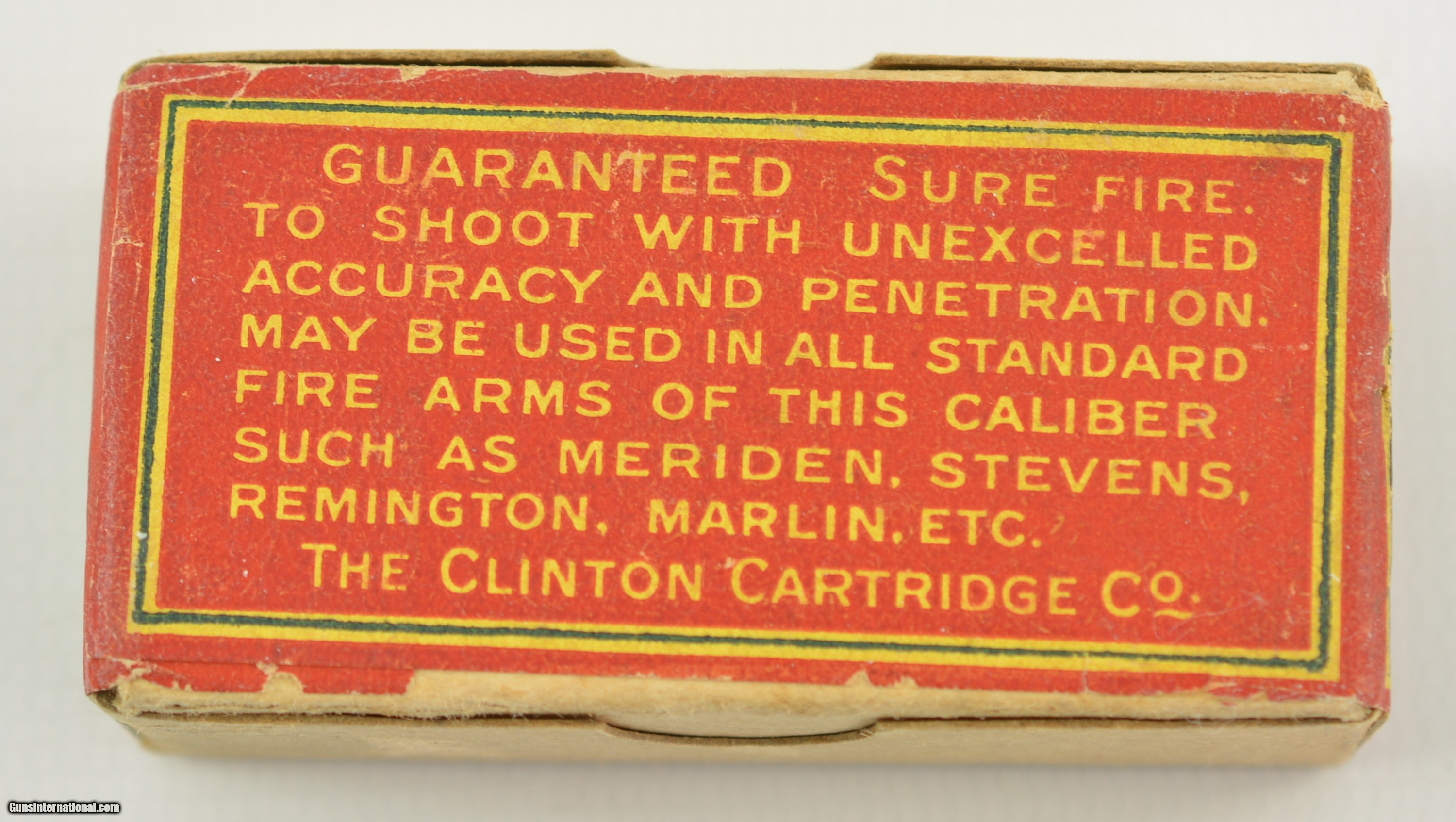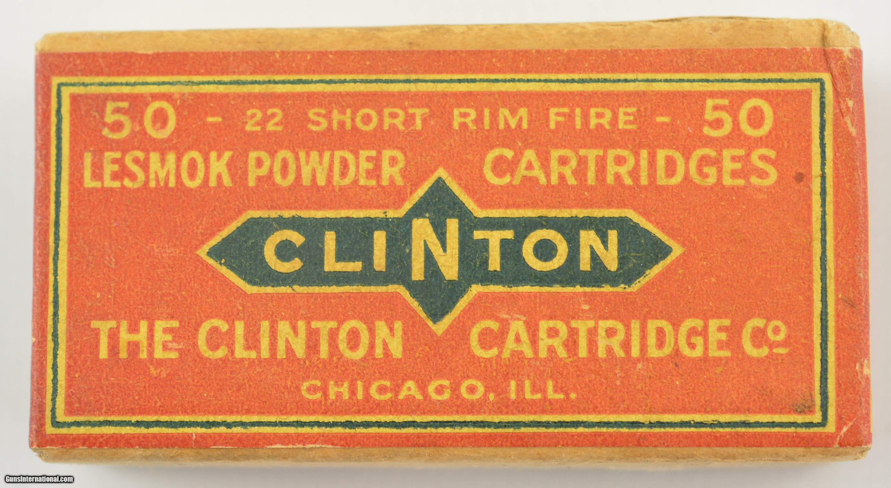 Description: This full sealed 50 round two piece full top box is in excellent condition with bright colors and very little shelf wear. These were produced by Western and sold by Sears Roebuck in the early 1920's. One corner shows a small wrinkle. SOLD Manufacturer: Clinton Model: Ammo Caliber Info: .22 Short Gauge Info: .22 Short |