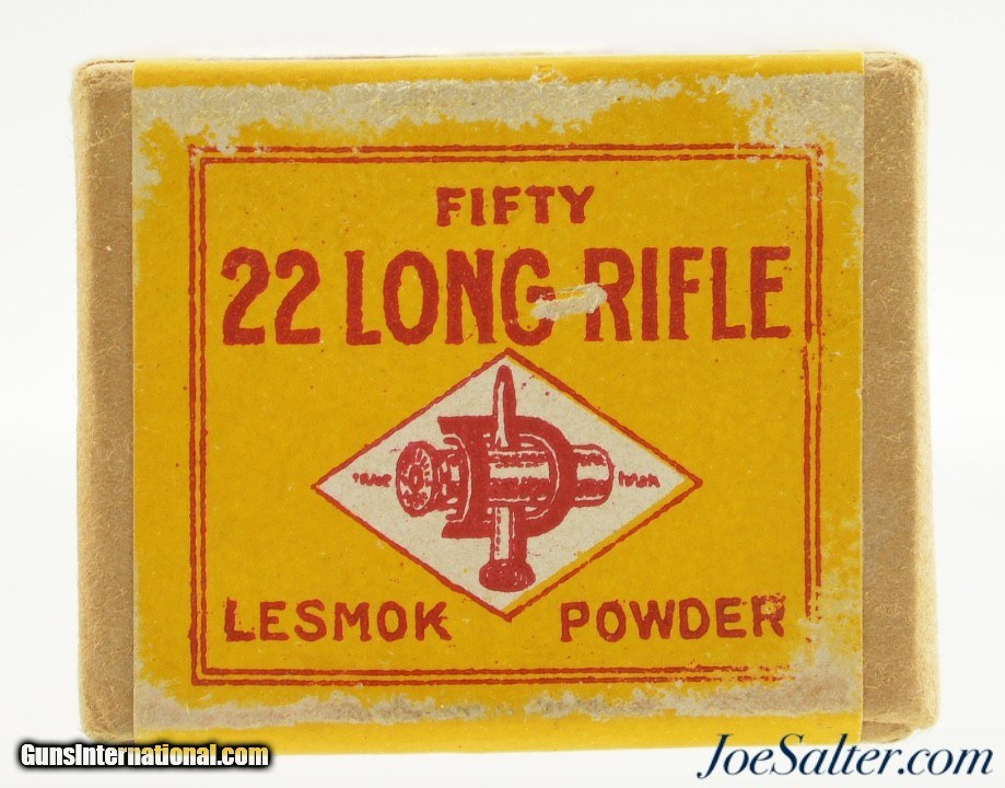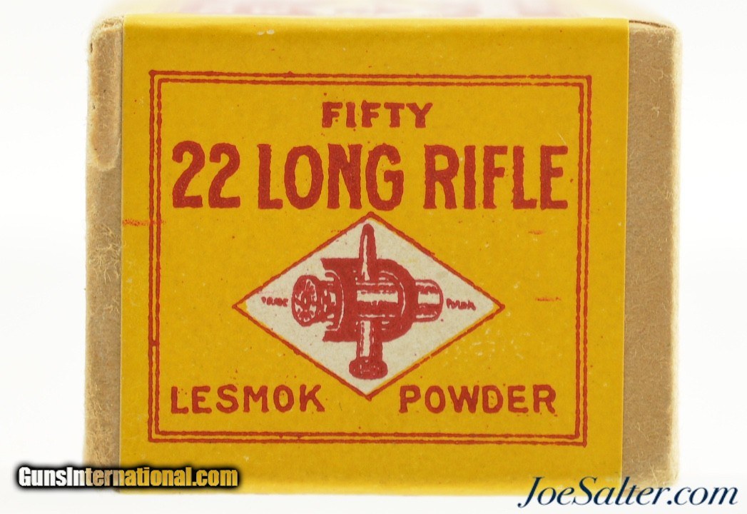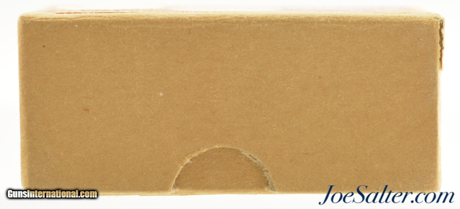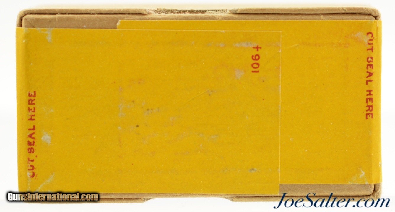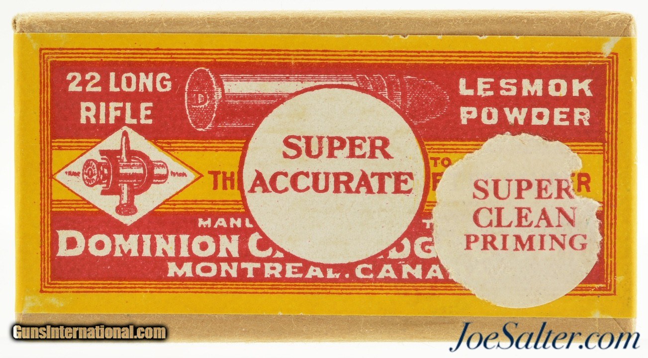 Description: This is a full box, 50 original rounds, of .22 LR ammunition with Lesmok Powder manufactured by Dominion Cartridge Company in Montreal, Canada as part of the "Bent D Red and Yellow Lesmok Issues" circa 1906-28. The yellow, red and white labeled box has a "SUPER CLEAN PRIMING" overprint label. The two piece box and label are in crisp, excellent condition. Identified as D-3 LR-11(b) in Roger Huegel's online .22 Rim Fire Box ID reference. Price: $125.00 Contact Seller |