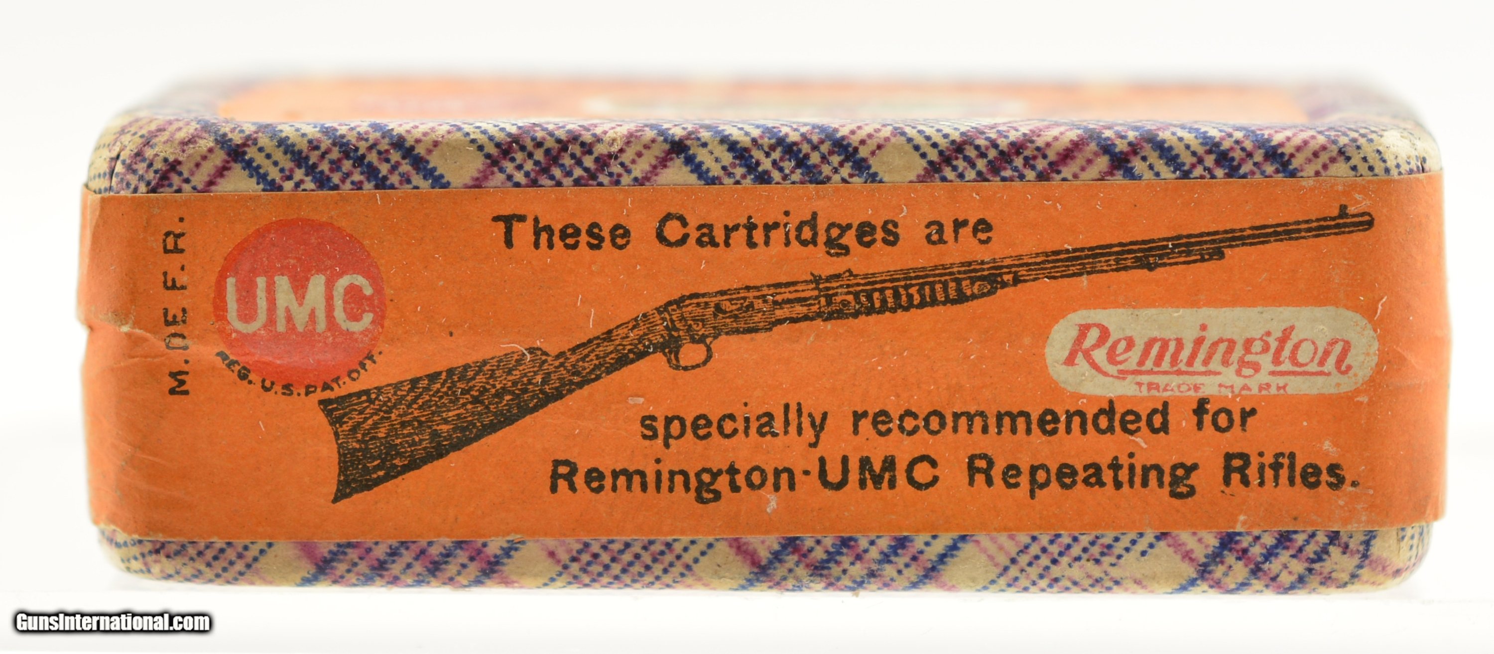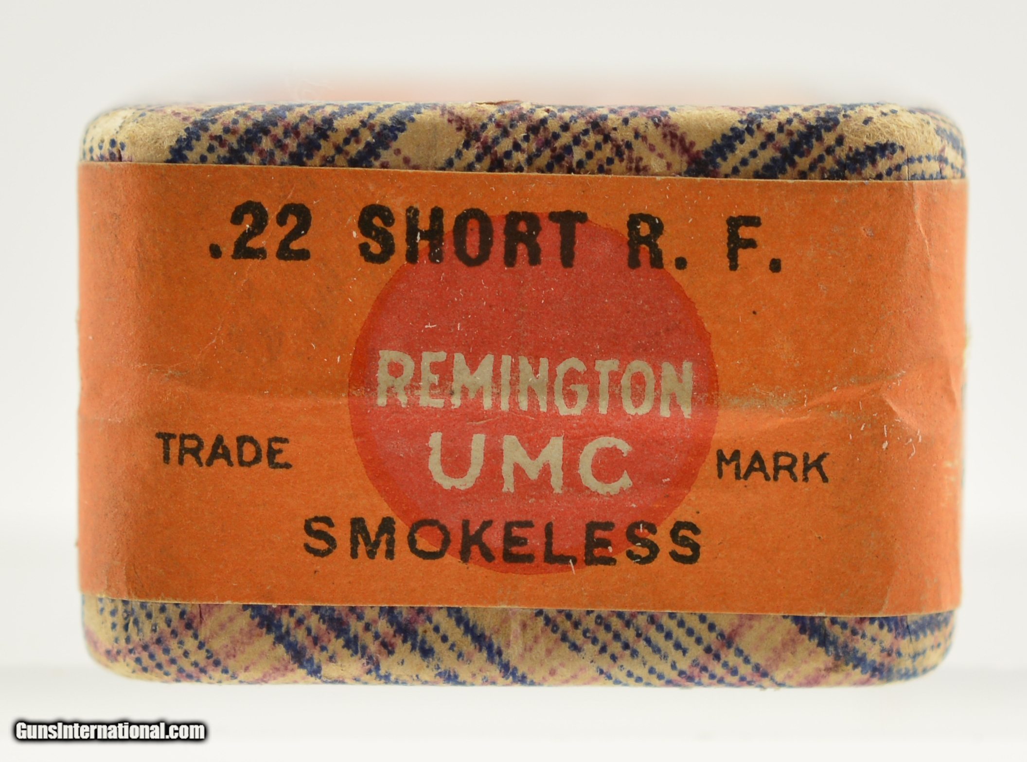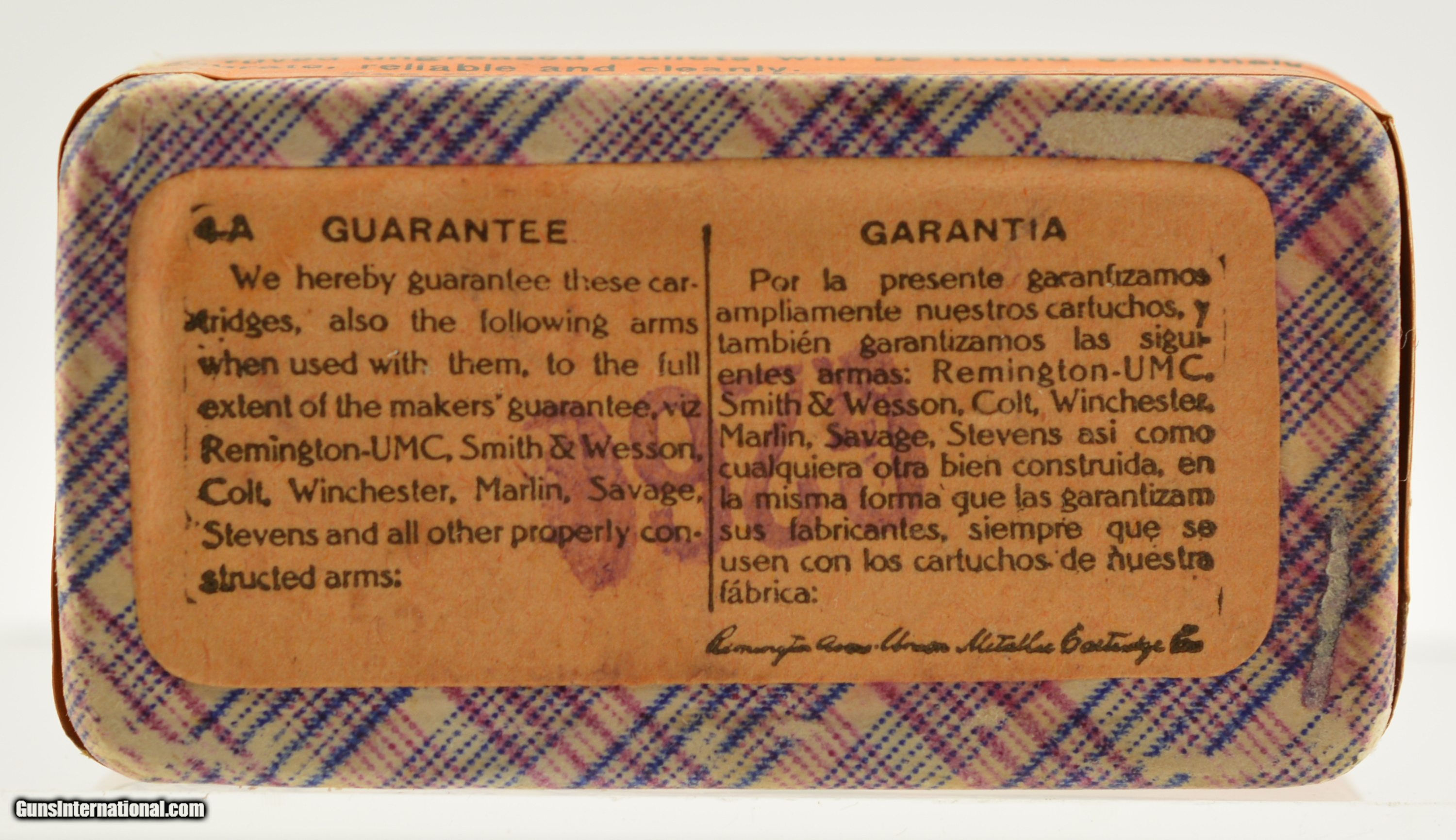 Description: This is a full box, 50 original rounds, of .22 short smokeless ammunition manufactured by Remington UMC with 29 grain ungreased bullets and is an early box in the first “combined logo" series. The two piece, half-split “Smokeless Ungreased" purple fabric box is in excellent condition. The graphics on this “14" product code, orange-yellow label with black printing and red and white logo are crisp with bright color and excellent detail. It has a batch number overprint on the top and bottom labels. Identified as Rem-2 S-5F in Roger Huegel's online .22 Rim Fire Box ID Reference. A scarce box in seldom seen excellent sealed condition. SOLD Manufacturer: Remington Caliber Info: .22 Short Gauge Info: .22 Short |