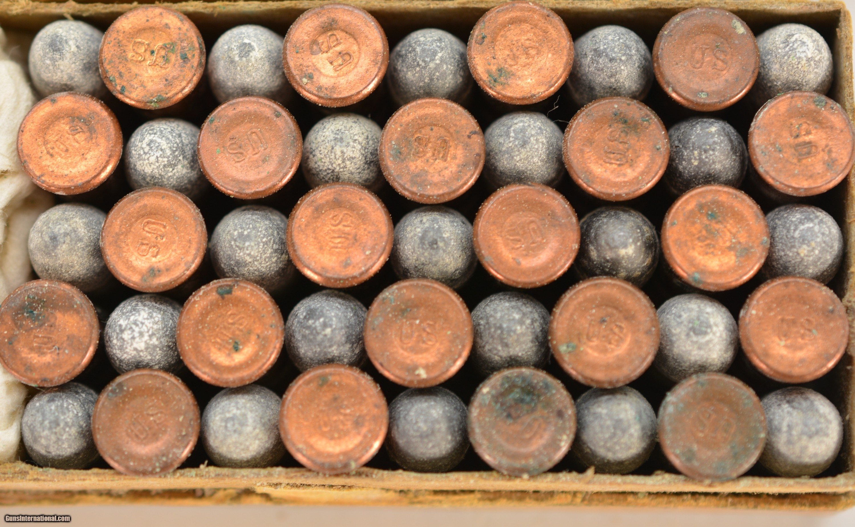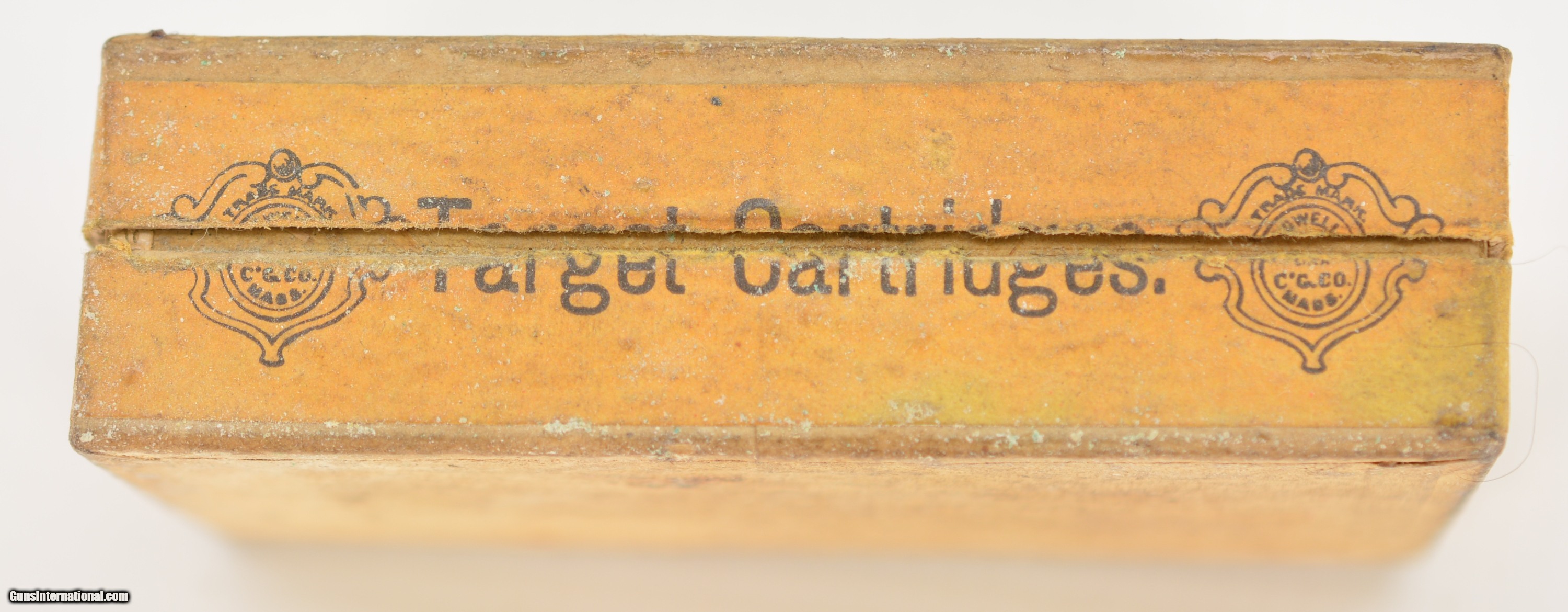 Description: This is an extremely desirable box of .32 Short rim fire ammunition by U.S. Cartridge Co., Lowell, Mass.. Perhaps one of the most decorative box cover designs the top label features 6 different guns, two game scenes and the patriotic company shield logo with red type indicating “.32/100 Short Calibre". The box is in very good to excellent condition with all labels intact. The box is sound with strong seams and edges showing an old shellac coating over the top label which has preserved it. There are 45 original “US" headstamped rounds in the box which are in very good to excellent condition. A great box to display. SOLD Manufacturer: US Cartridge Co. Caliber Info: .32 Short RF Gauge Info: .32 Short RF |