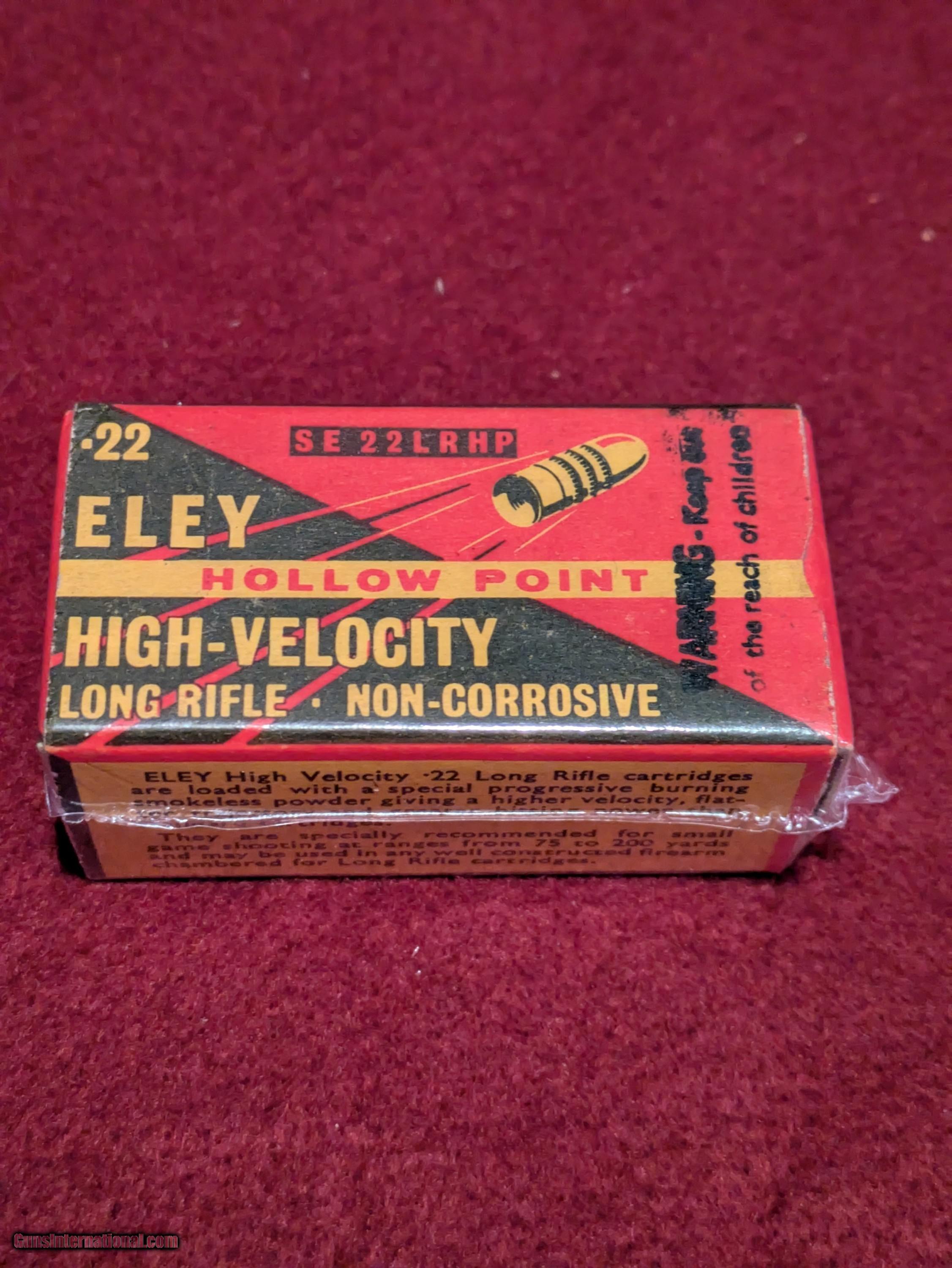 Description: Nice 50 round box of Eley hollow point ammo. Nice rabbit box getting harder to find. Box is nice same as ammo. Box is already wrapped for display. I combine shipping and also accept visa and MasterCard for payment but it adds 4 percent to total. 18.00 plus shipping SOLD |