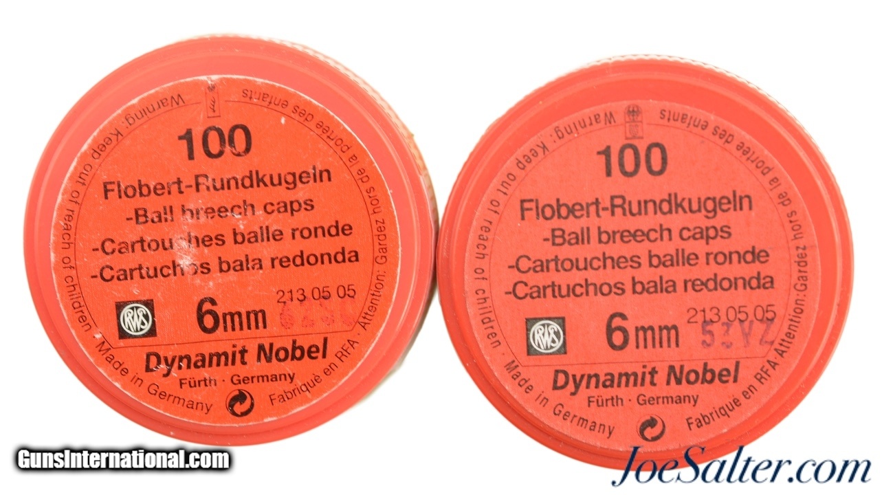 Description: This is a lot of two full containers, 200 total rounds, of 6mm Flobert ammunition manufactured by RWS in Germany. The plastic containers show light storage wear with excellent cartridges. SOLD |