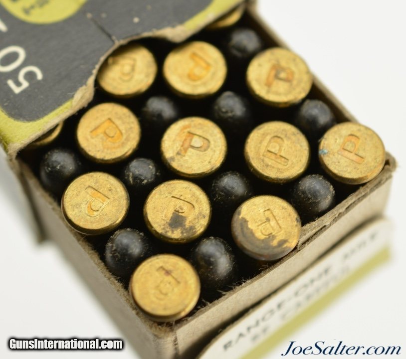 Description: This is a full box, 50 original rounds, of .22 LR ammunition manufactured by Peters as part of the Dewar Match issues that began in 1934 and lasted into the early 1950's. The Green color box is in excellent condition with sharp corners and edges and crisp graphics and a very slight indent along the middle of the top. The cartridges are in excellent condition. Identified as PCC-53B LR-2.1 in Roger Huegel's online .22 Rim Fire Box ID Reference based on the original Dunn classification system. SOLD |