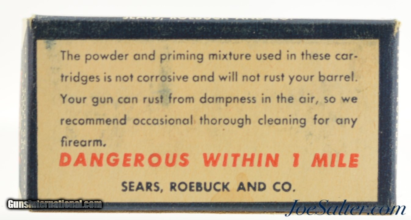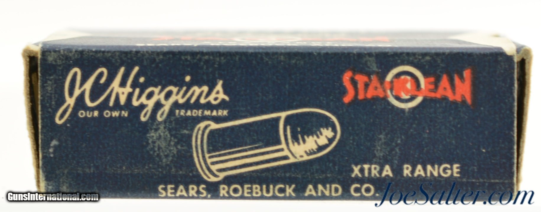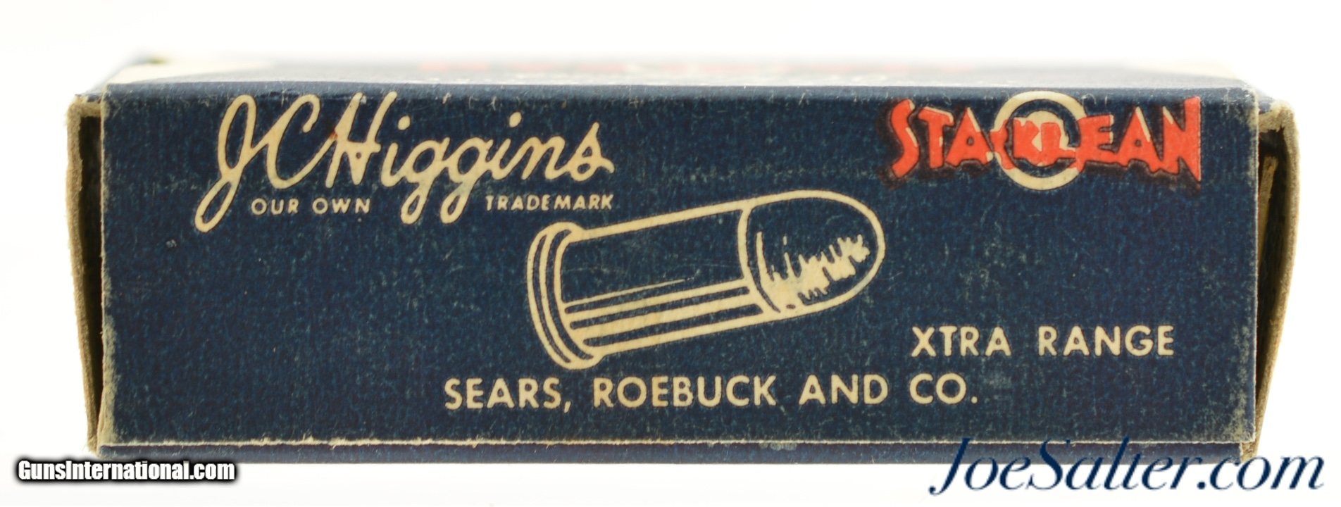 Description: This is a full box, 50 original rounds, of .22 short ammunition private label manufactured by Federal and sold by Sears under the J.C. Higgins brand name as part of the Blue J.C. Higgins issues. The one piece box is in excellent condition with bright colors showing slight rub wear. The cartridges are in excellent condition. These 70+ year old boxes are getting harder to find in high condition. Identified as Sears-7 S-1(b) in Roger Huegel's online .22 Rim Fire Box ID Reference. SOLD |