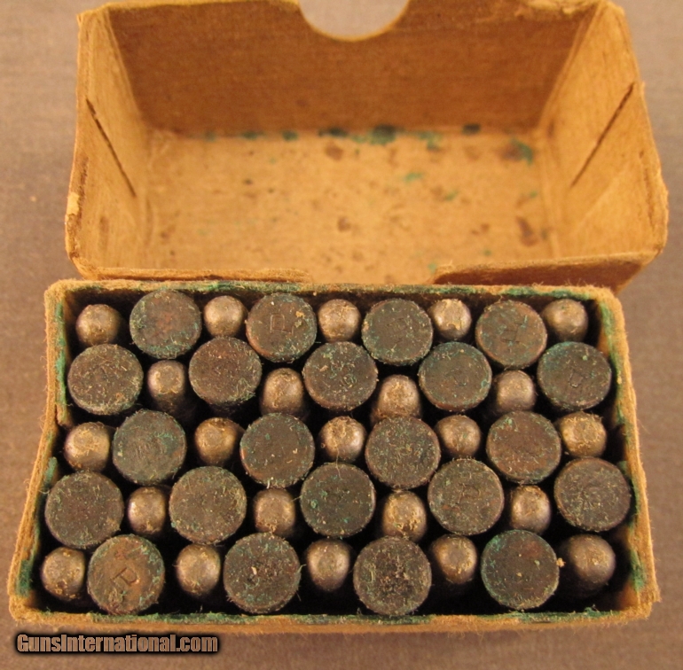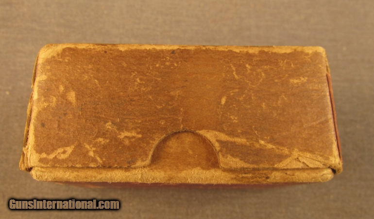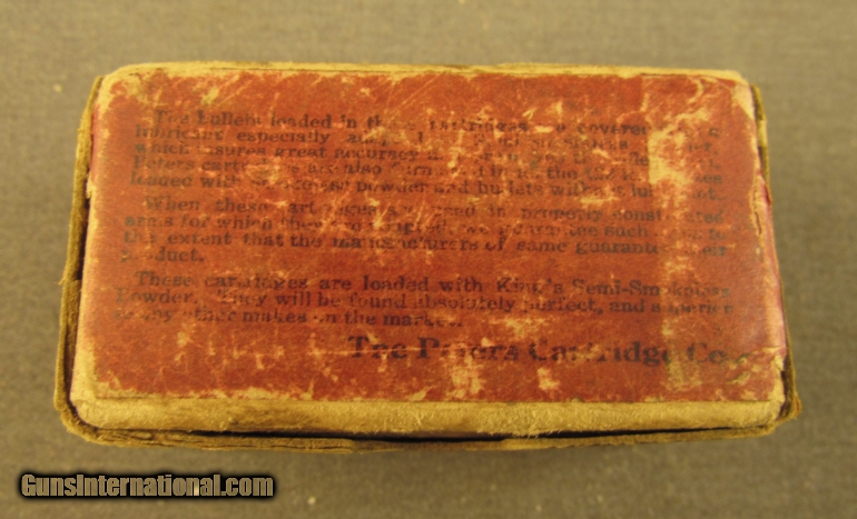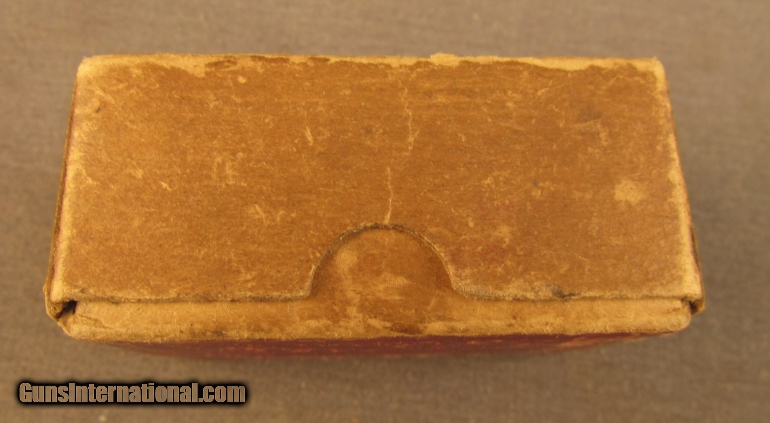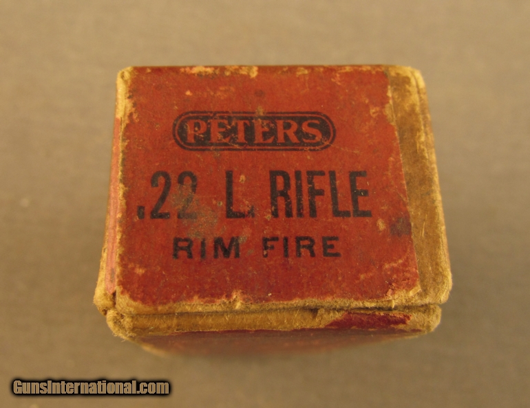 Description: This full 50 round two piece full top box was used from around 1913 to 1915. Label features straight line company name and is printer coded "926". Box shows scuffing and light soiling with bottom label only partly legible. This box is listed in Dunn upgrades as PCC-4-LR-2-B. All Peters semi-smokeless boxes are very desirable. SOLD Manufacturer: Peters Model: Ammo Caliber Info: .22LR Gauge Info: .22LR |