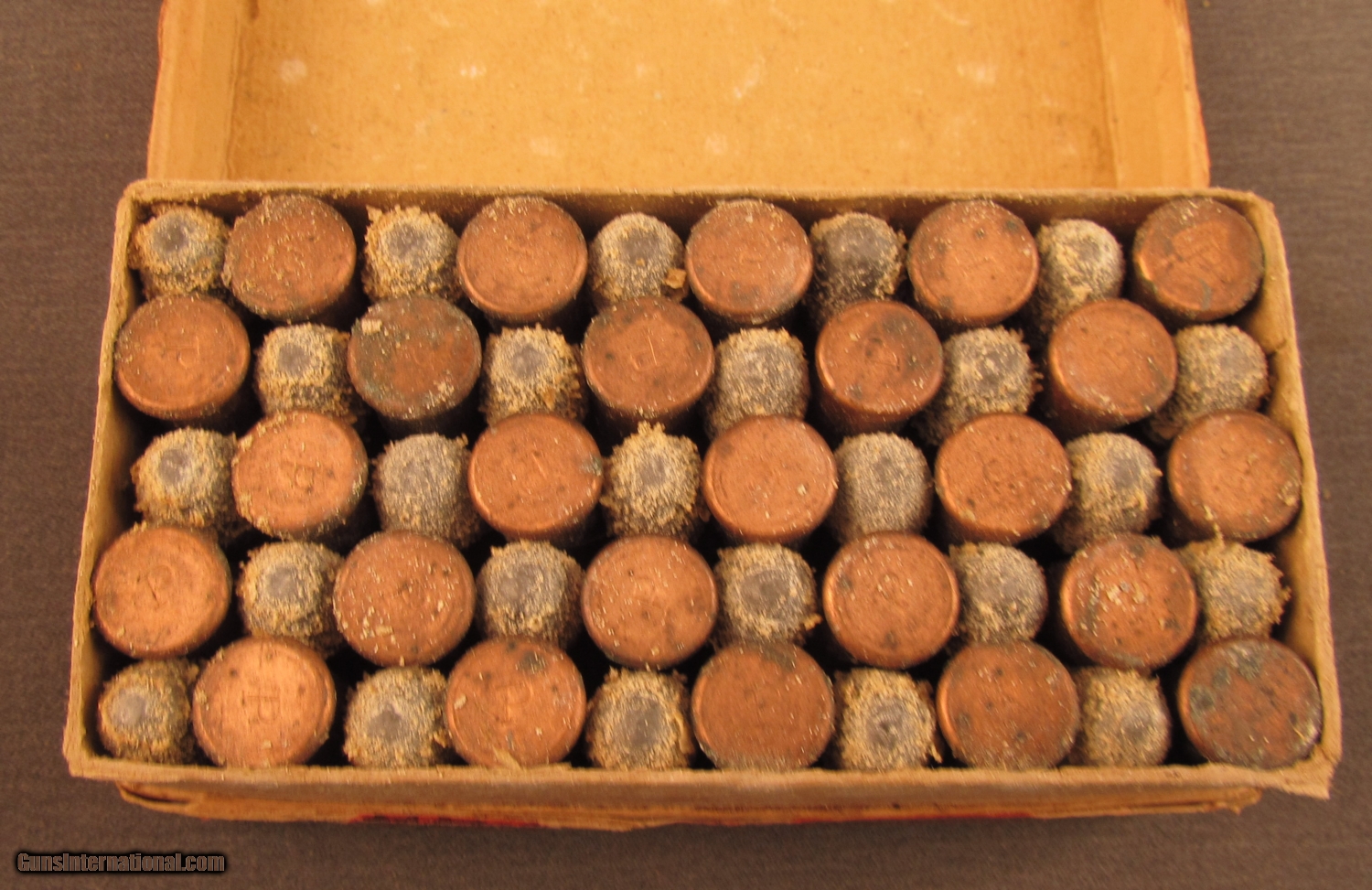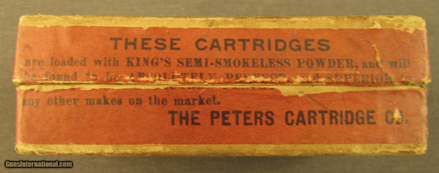 Description: This partial (49 correct rounds with one filler) two piece half split box is from the late 1890's. Features include arched logo on top label and King's semi-smokeless callout on side sealing label. Box shows light soiling and minor shelf wear with a few chips in the edges of top lablel. Side label is 95% present and remains fully legible. SOLD Manufacturer: Peters Model: Ammo Caliber Info: .38RF Gauge Info: .38RF |