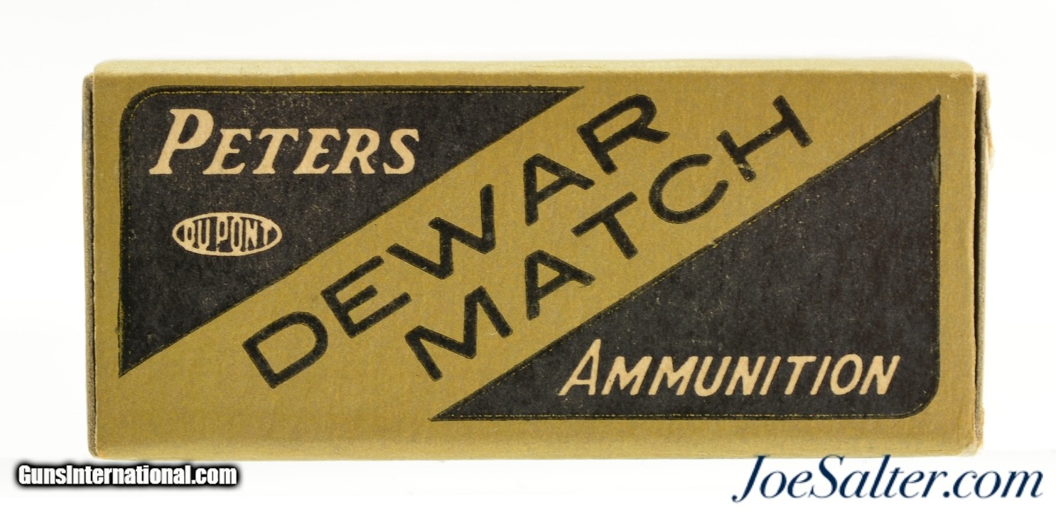 Description: This is a full box, 50 original rounds, of .22 LR ammunition manufactured by Peters as part of the Dewar Match issues that began in 1934 and lasted into the early 1950's. The box is in excellent condition with sharp corners and edges and crisp graphics. The cartridges are in excellent condition. Identified as PCC-53B LR-2C in Roger Huegel's online .22 Rim Fire Box ID Reference based on the original Dunn classification system. SOLD |