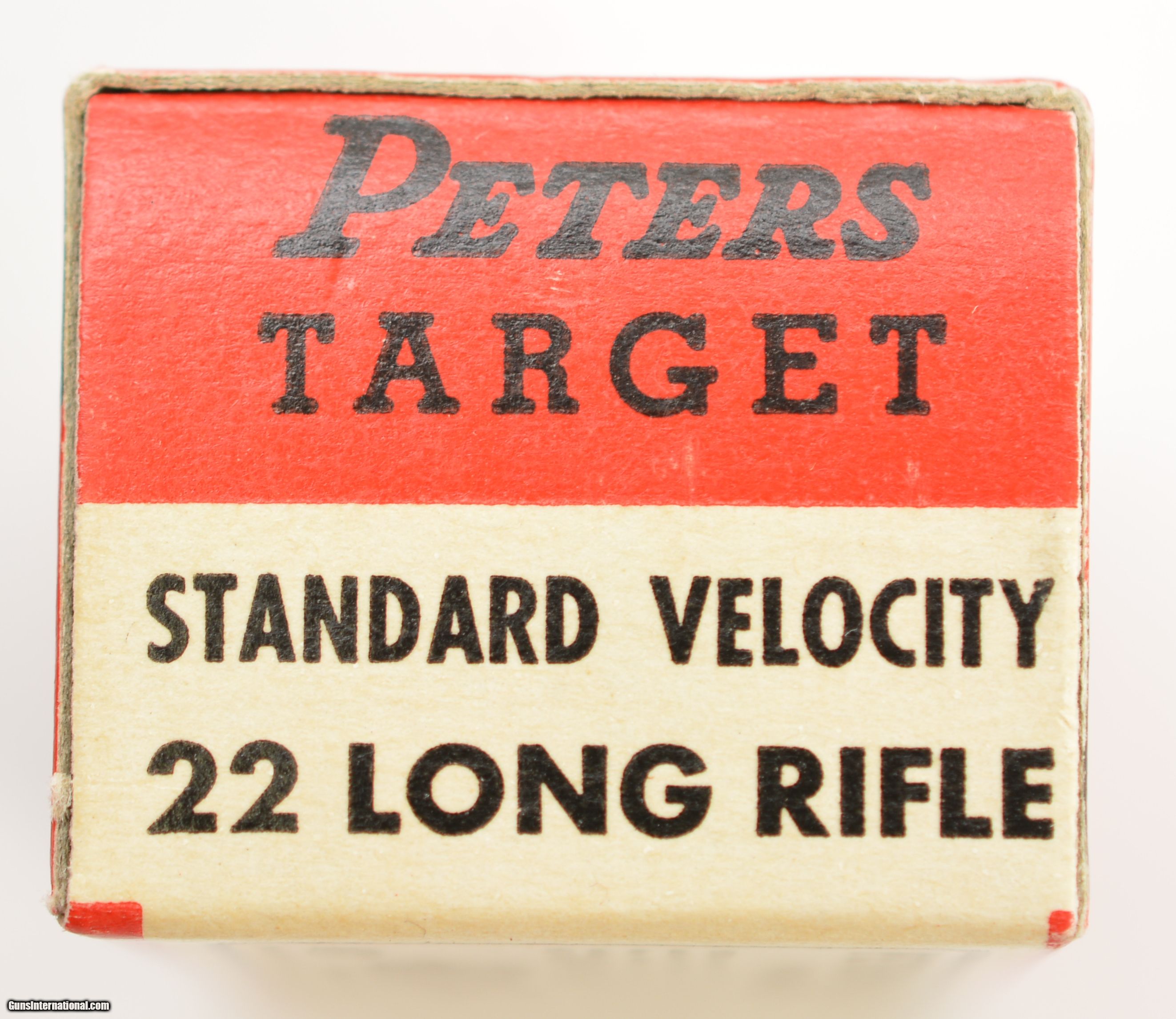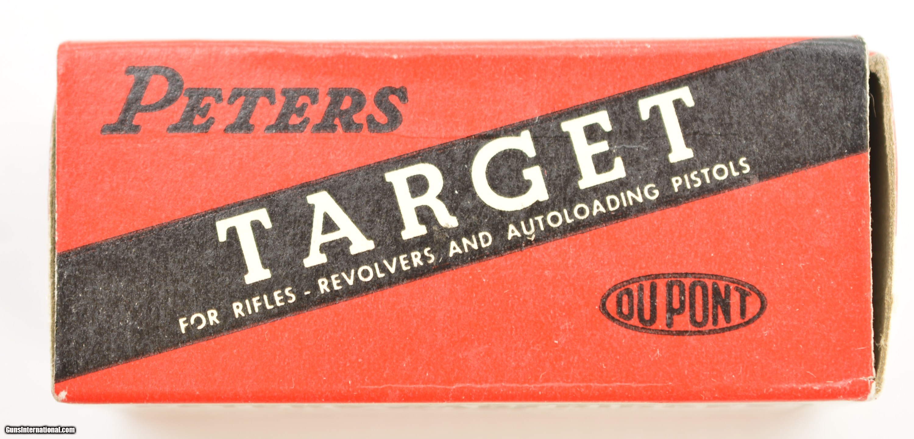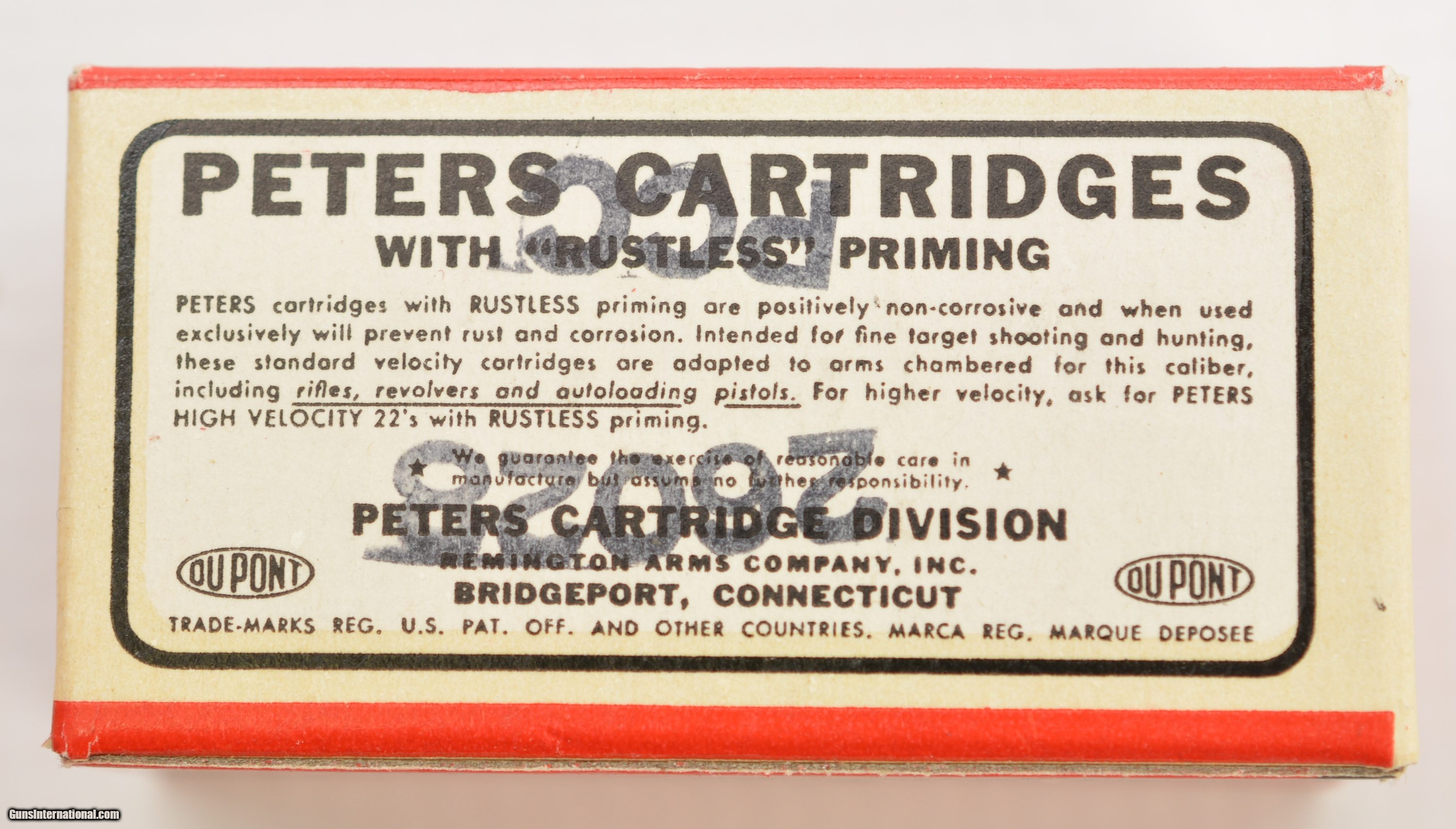 Description: This full 50 round box has the black stripe side and standard velocity callout. This series of boxes was used from 1948 to 1963. Listed in Dunn Upgrades as PCC-54-LR-2.2-A. SOLD Manufacturer: Peters Model: Ammo Caliber Info: .22 Gauge Info: .22 |