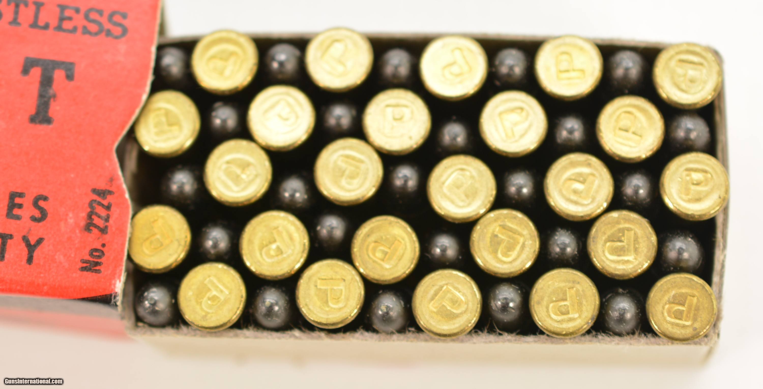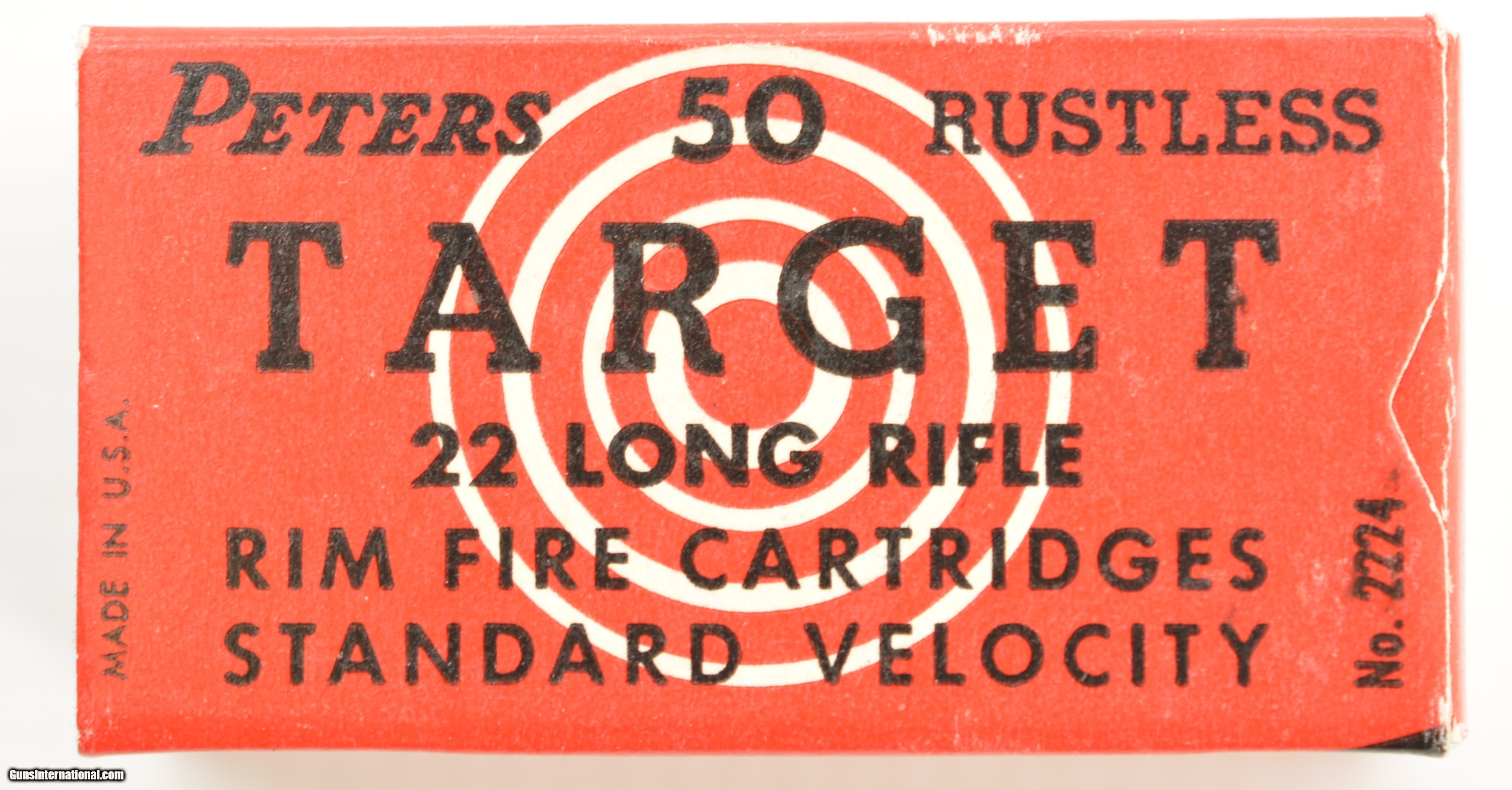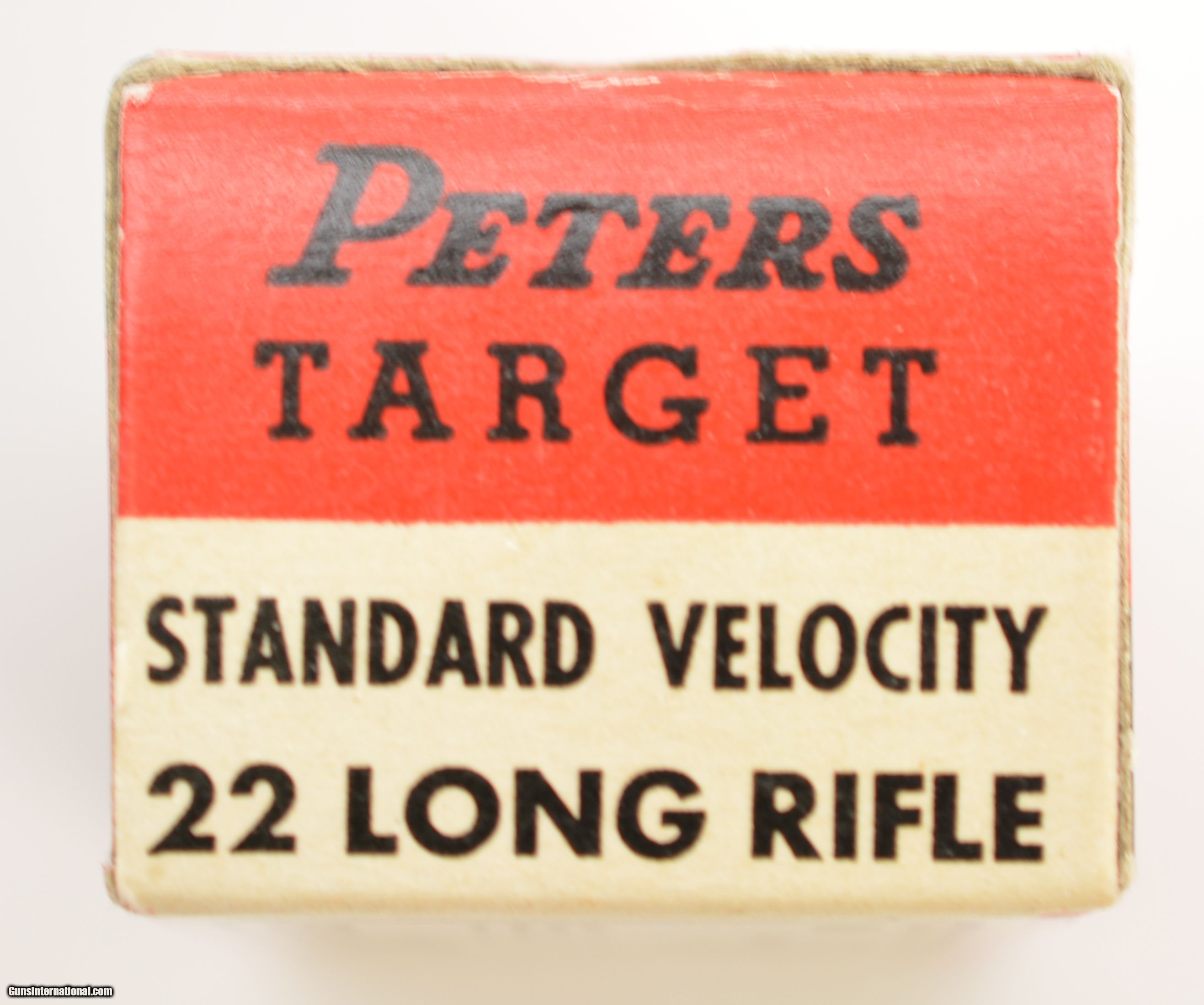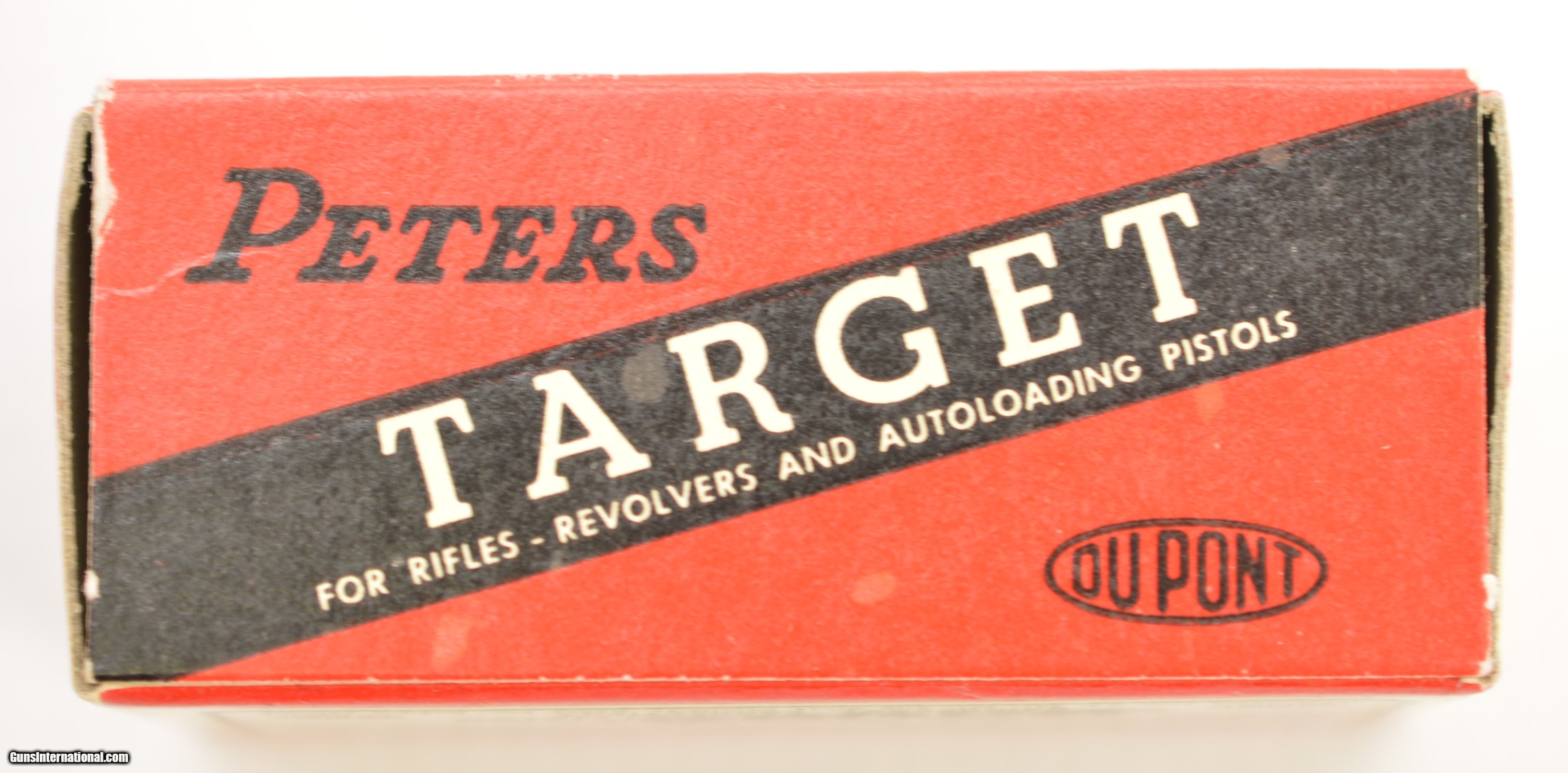 Description: This full 50 round box has the black stripe side and standard velocity callout. This series of boxes was used from 1948 to 1963. Listed in Dunn Upgrades as PCC-54-LR-2.2-A. SOLD Manufacturer: Peters Model: Ammo Caliber Info: .22 Gauge Info: .22 |
