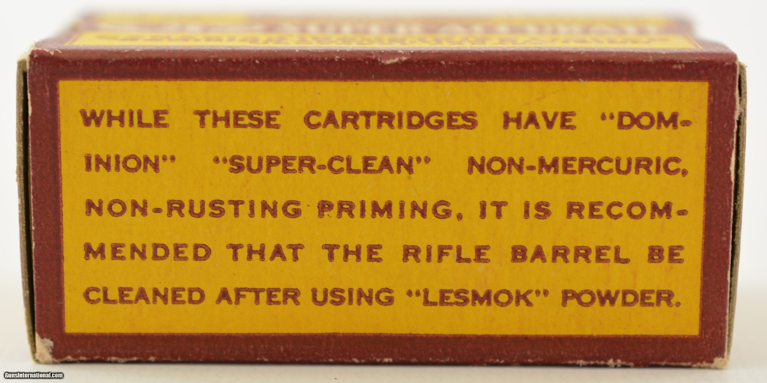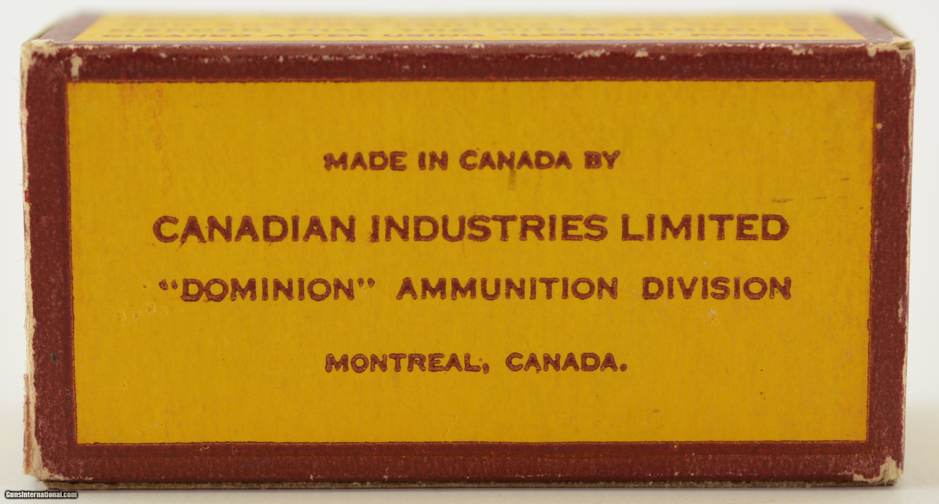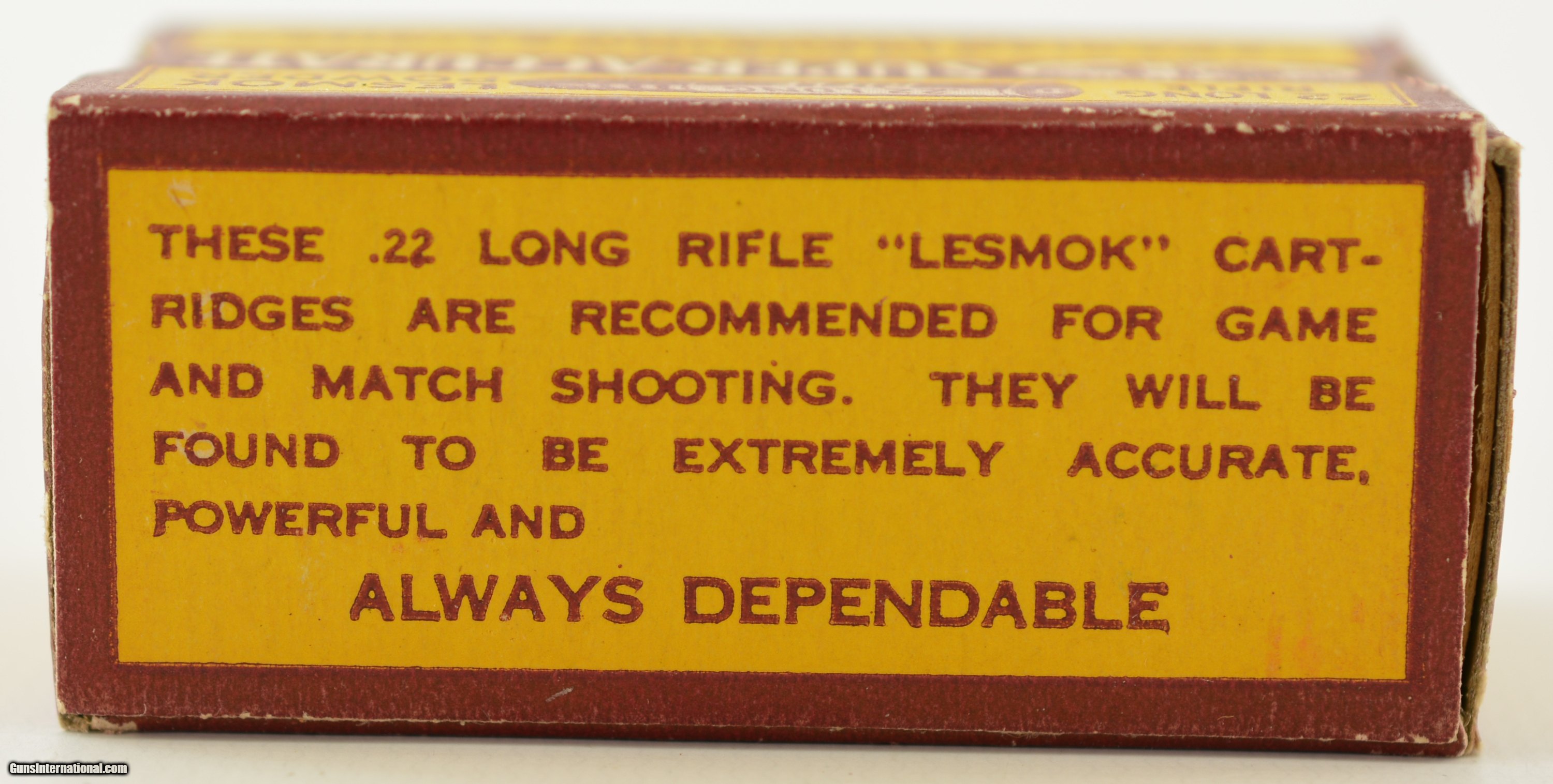 Description: This full 50 round one piece box is the third in the Super-Accurate series issued from 1932 to 1939. Box remains in excellent condition with light wear and bright colors. Box contains lead round nose bullets loaded in copper cases with "D" headstamp. This is one of the last "Lesmok" boxes offered by this maker. Listed in Blyth +Dunn as CIL-4-LR-7. SOLD Manufacturer: CIL Model: Ammo Caliber Info: .22LR Gauge Info: .22LR |