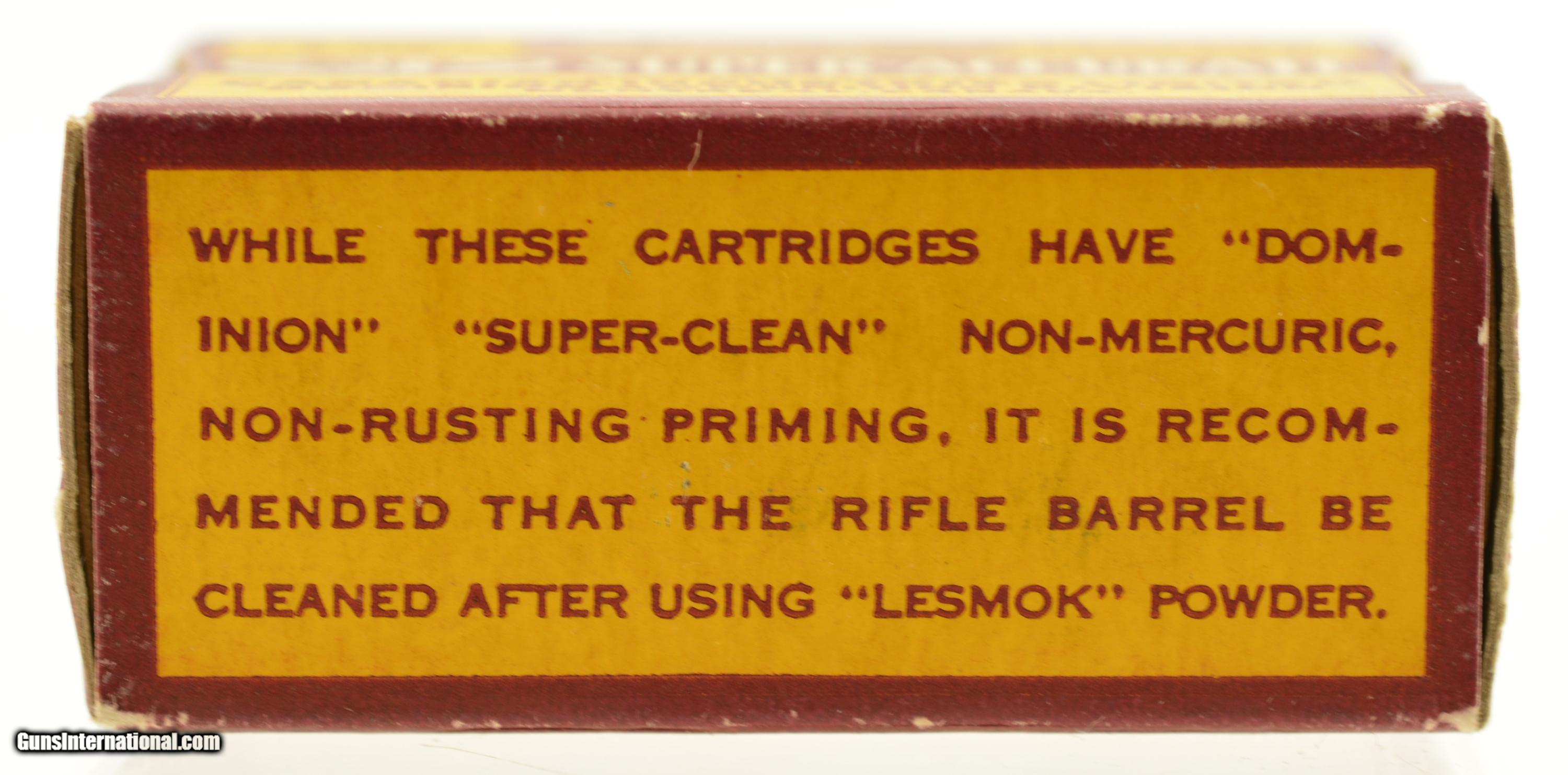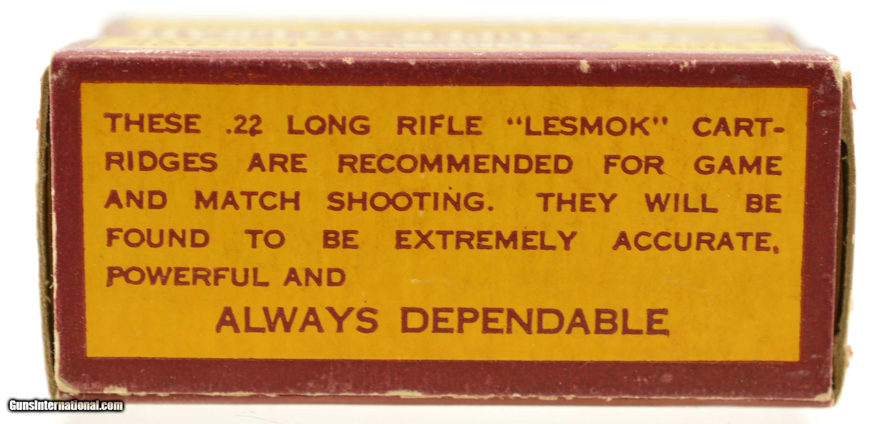Description: This full 50 round one piece box is the third in the Super-Accurate series issued from 1932 to 1939. Box remains in excellent condition with light wear and bright colors. Box contains lead round nose bullets loaded in copper cases with "D" headstamp. This is one of the last "Lesmok" boxes offered by this maker. Listed in Blyth +Dunn as CIL-4-LR-7. SOLD Manufacturer: CIL Model: Ammo Caliber Info: .22 Gauge Info: .22 |
