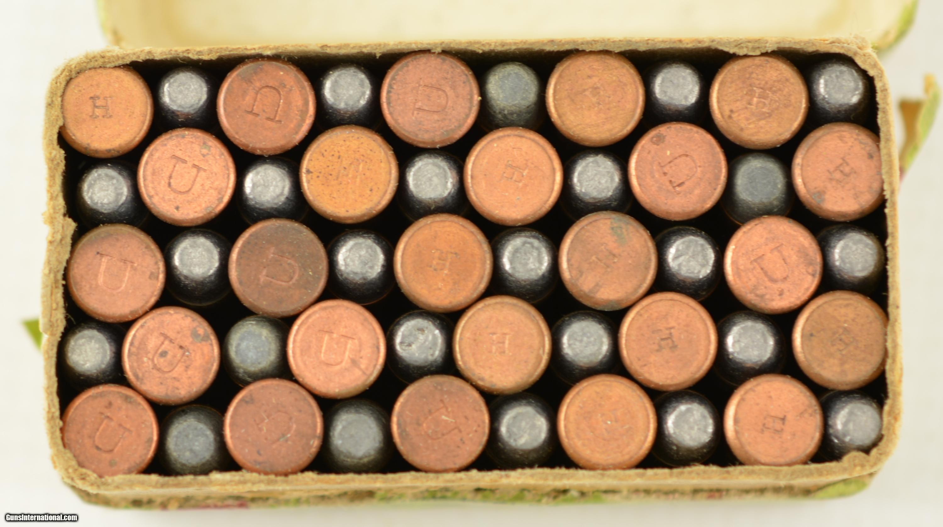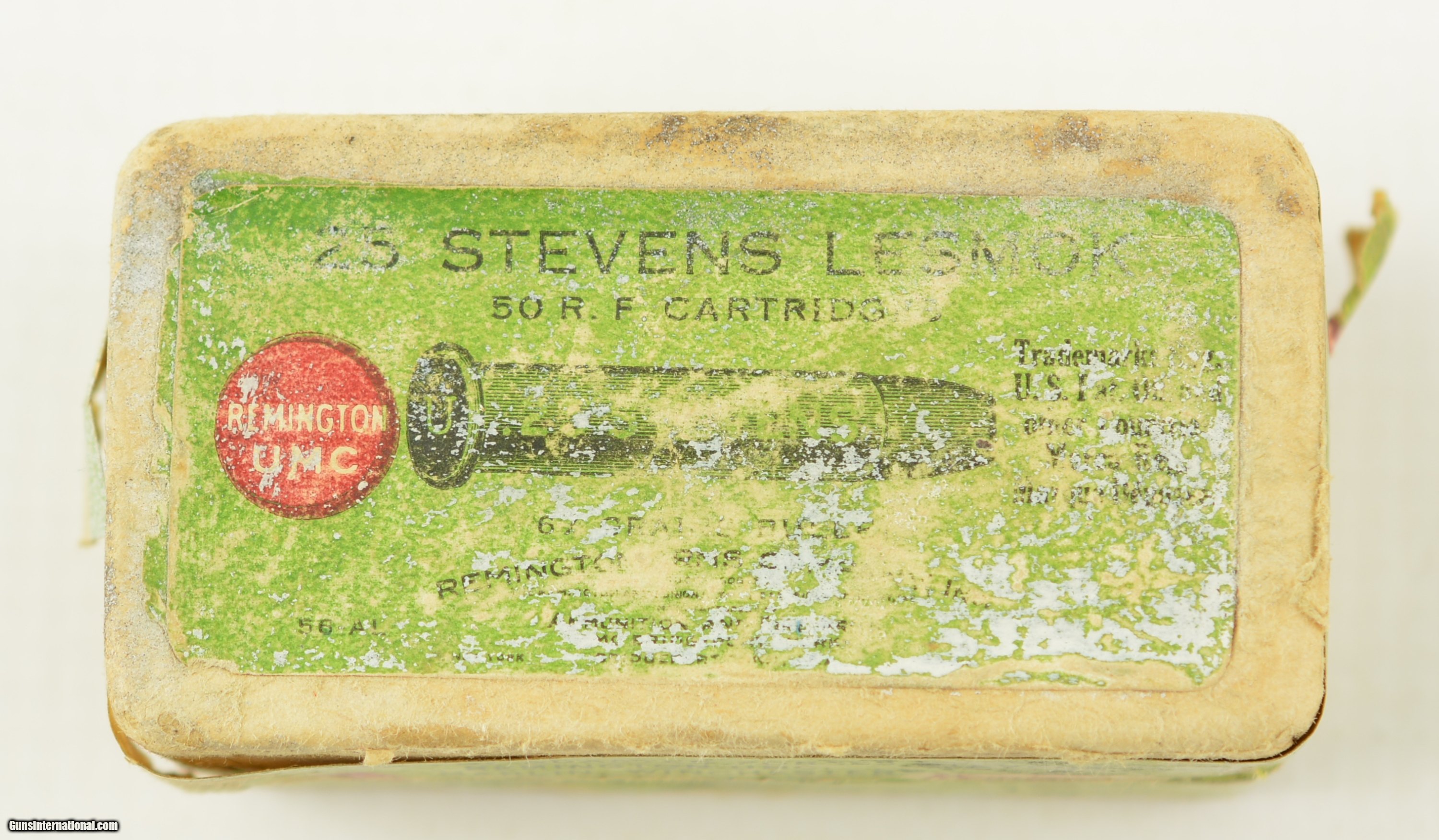 Description: 1 Full Box of Remington/UMC 25 Stevens long. This 2 piece box shows all original rounds. The box cover shows the cartridge but is washed out. Approx 1/2 of the side labels remain in place. Excellent cartridges/rough box. SOLD Manufacturer: Rem/UMC Model: Ammo Caliber Info: .25 Stevens Gauge Info: .25 Stevens |
