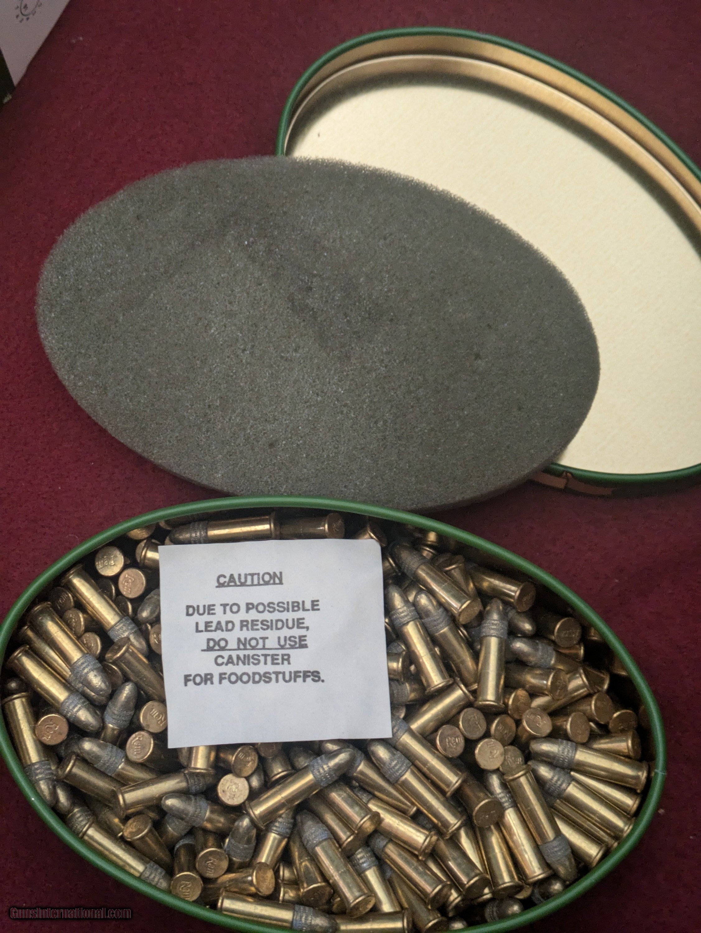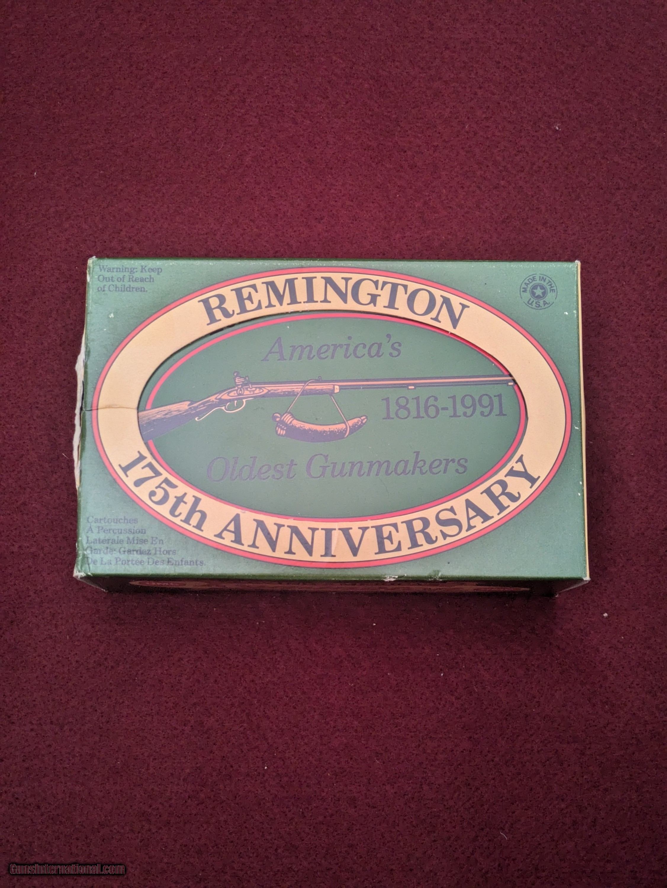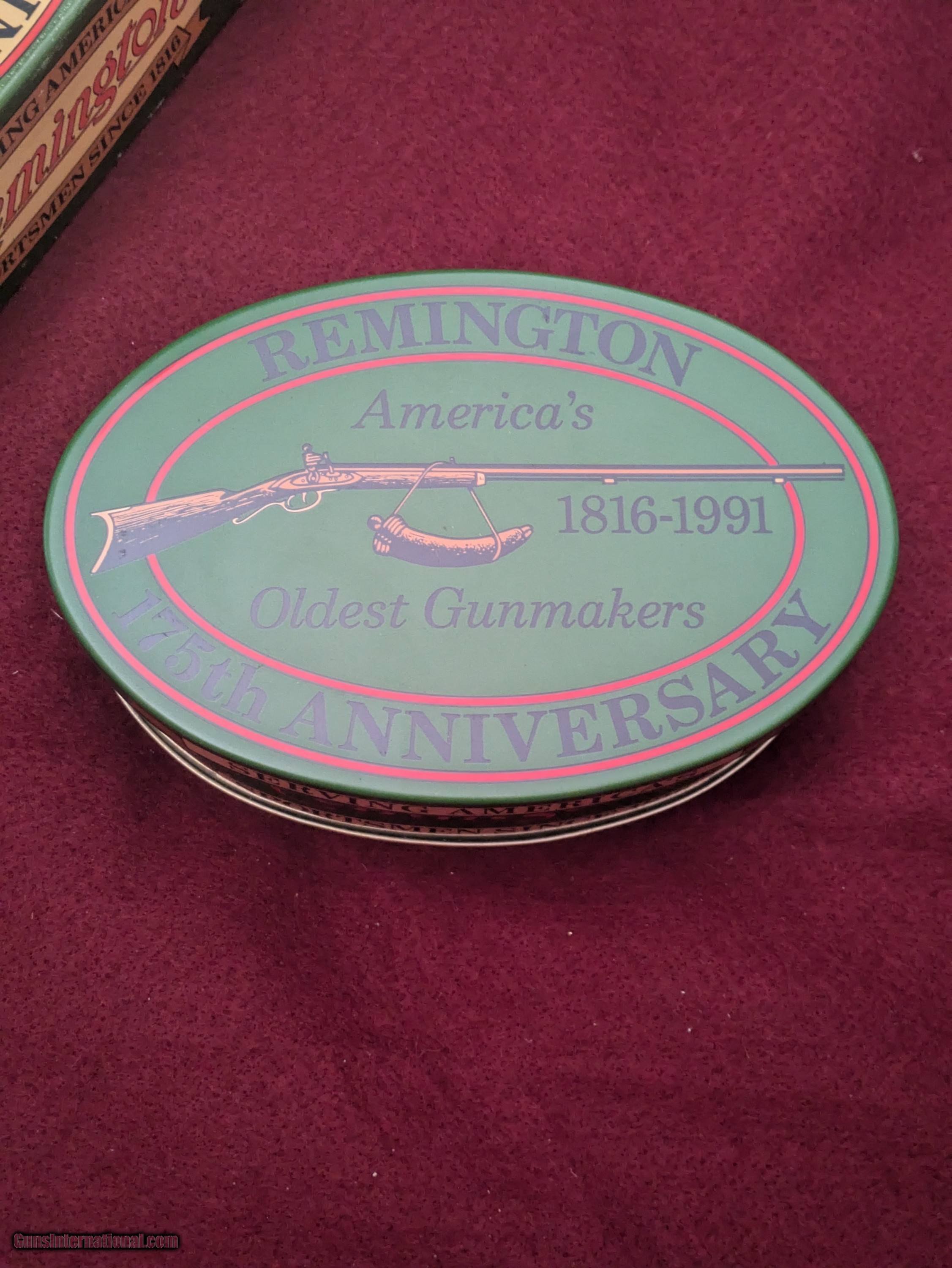 Description: Remington 175th anniversary tin. 1816-1991. Full tin contains 325 rounds..I combine shipping and also accept visa and MasterCard for payment but it adds 4 percent to total. 65.00 plus shipping SOLD |