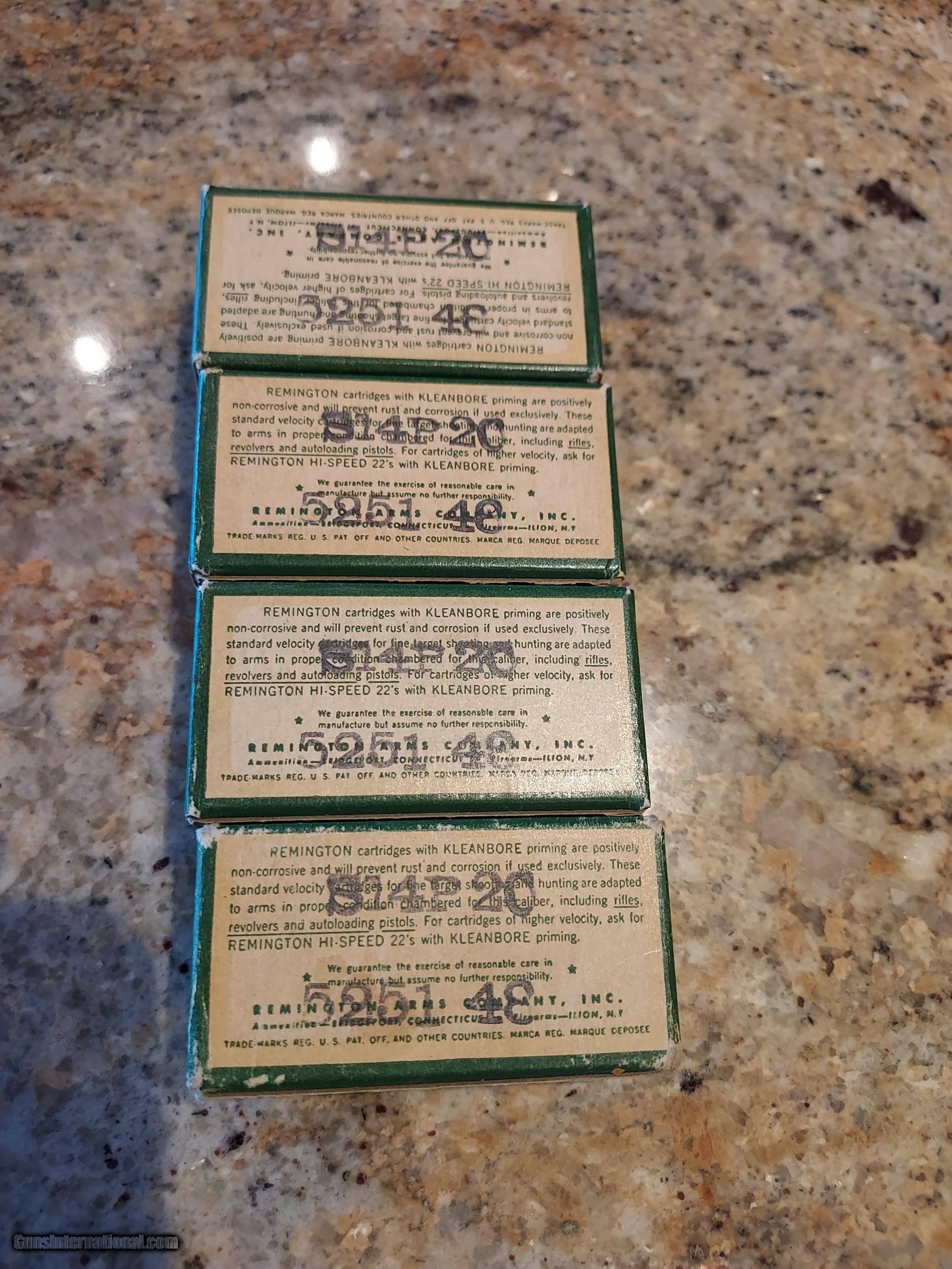 Description: These four boxes of long rifle Kleanbore are in fantastic condition. All of the boxes are full and the boxes have no tears. They alll bear the same lot number. Sold at one lot price for $50 plus shipping of $15. SOLD |