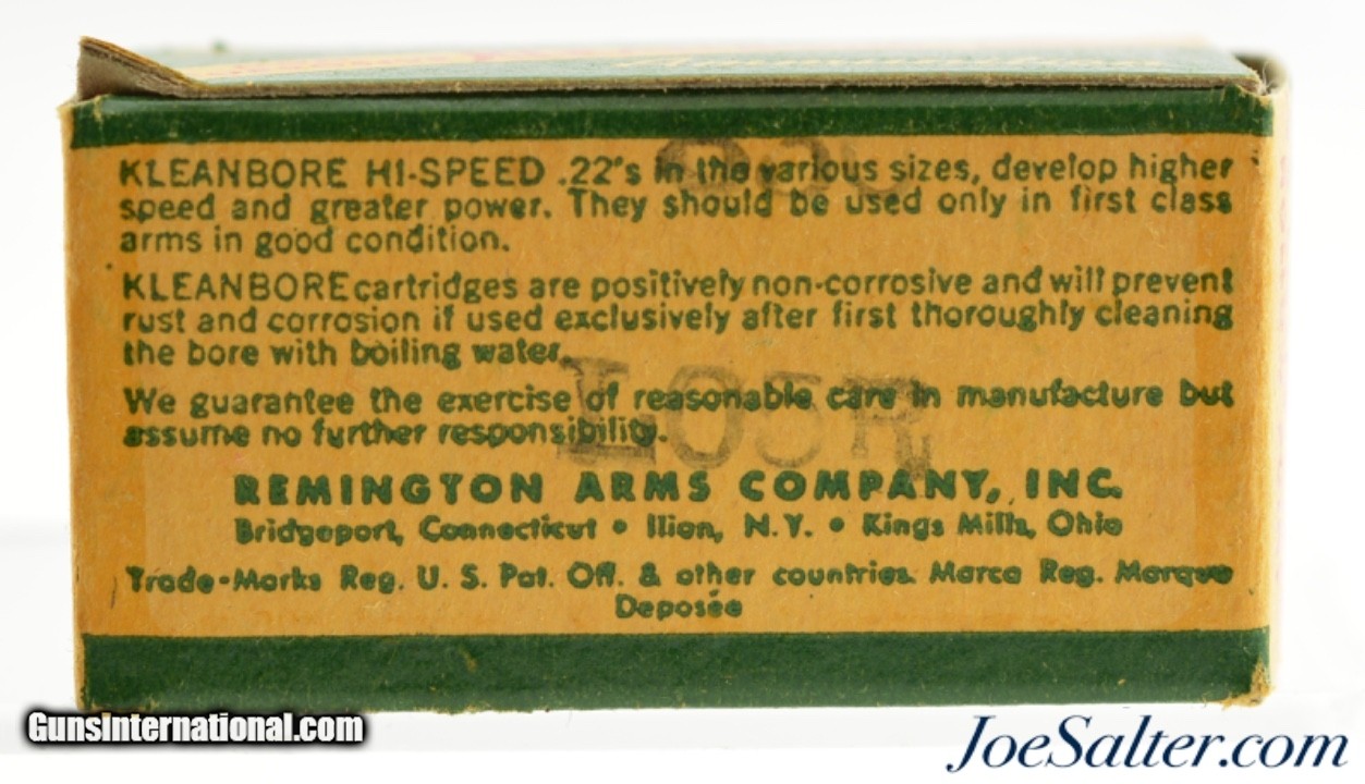 Description: This is a full box, 50 original rounds, of .22 LR ammunition manufactured by Remington with Hollow Point bullets. The one piece, thumb cut with slide out tray box is a 1939 "Kleanbore Hi-Speed" issue identified as REM-10 R23(a) with "Be Careful" warning in Roger Huegel's online .22 Rim Fire Box ID Reference. The box is brick fresh with excellent graphics with bright colors, crisp edges and corners showing only minor contact blemishes and having excellent "U" stamped cartridges. An excellent box for the collector.; SOLD |