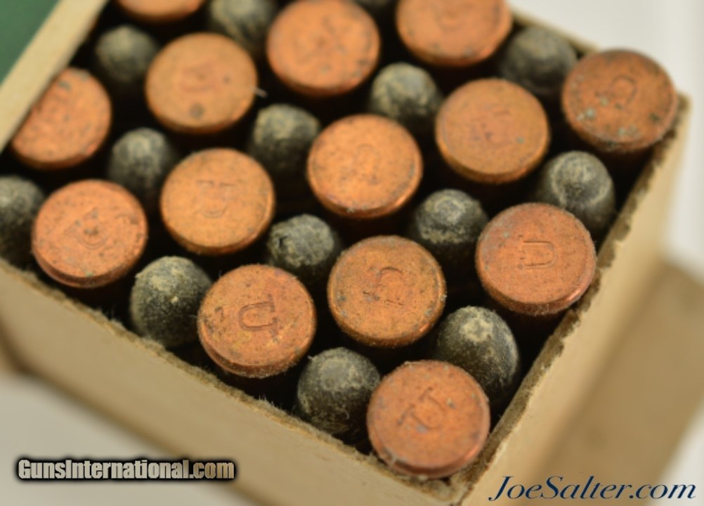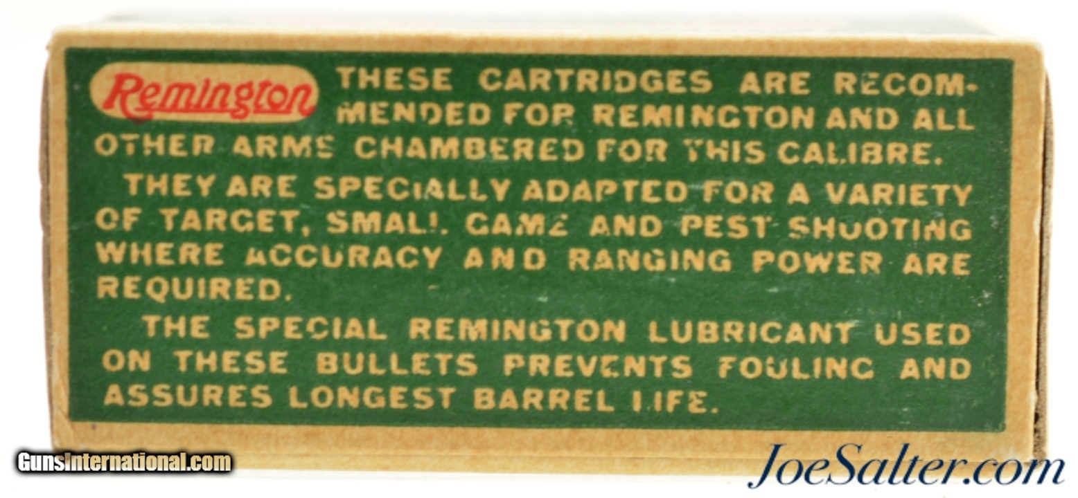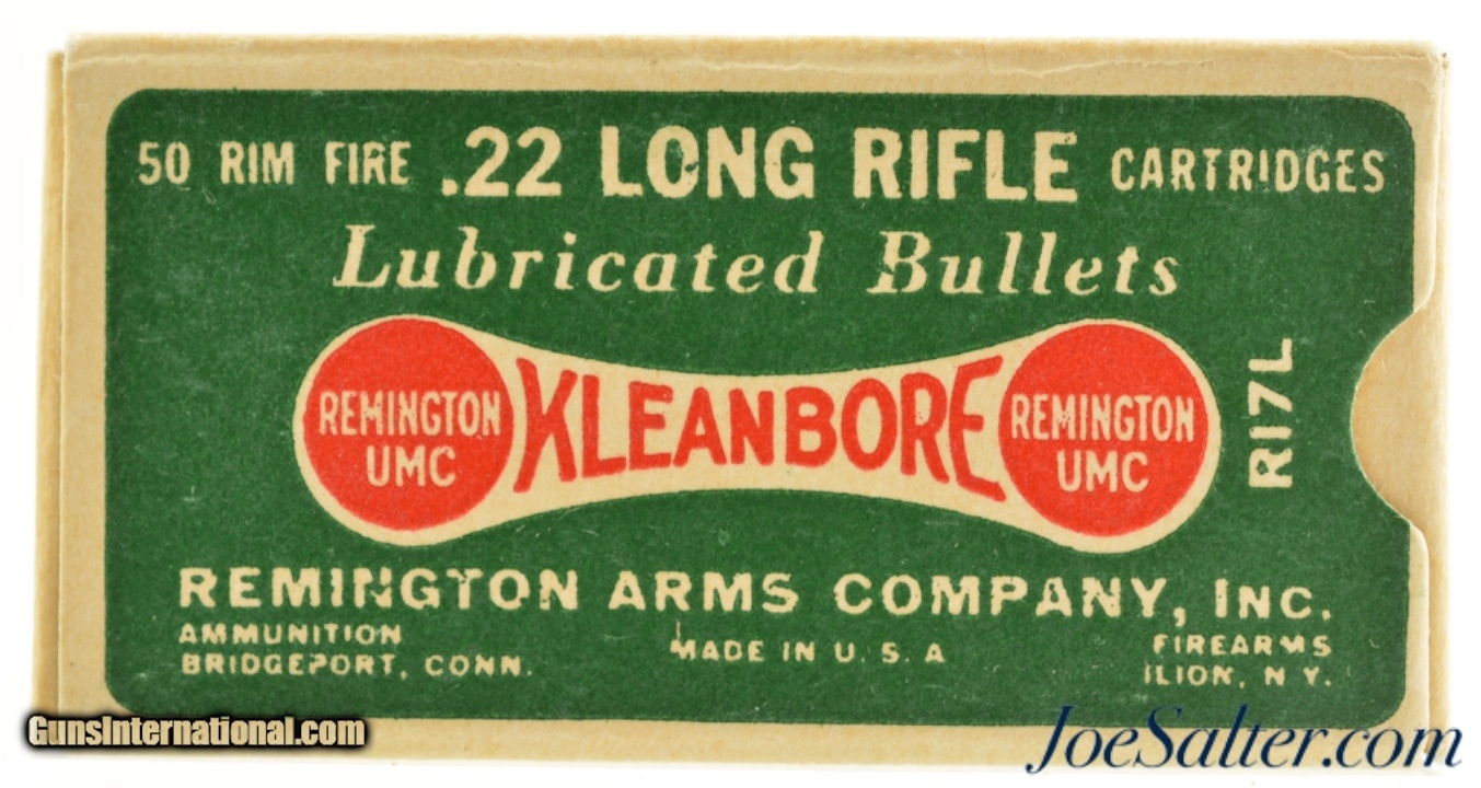 Description: This is a full box, 50 original rounds, of .22 LR ammunition manufactured by Remington with Kleanbore Lubricated bullets. The one piece, 1930s style box has the R17L code on the right with thumb cut and copper case, inside flap reads "DANGEROUS / WITHIN 1 MILE" identified RHWeb (Roger Hugel 22 ID online) REM 7.2 LR-1 (e). The box is in excellent condition with bright colors and crisp graphics with excellent cartridges.; SOLD |