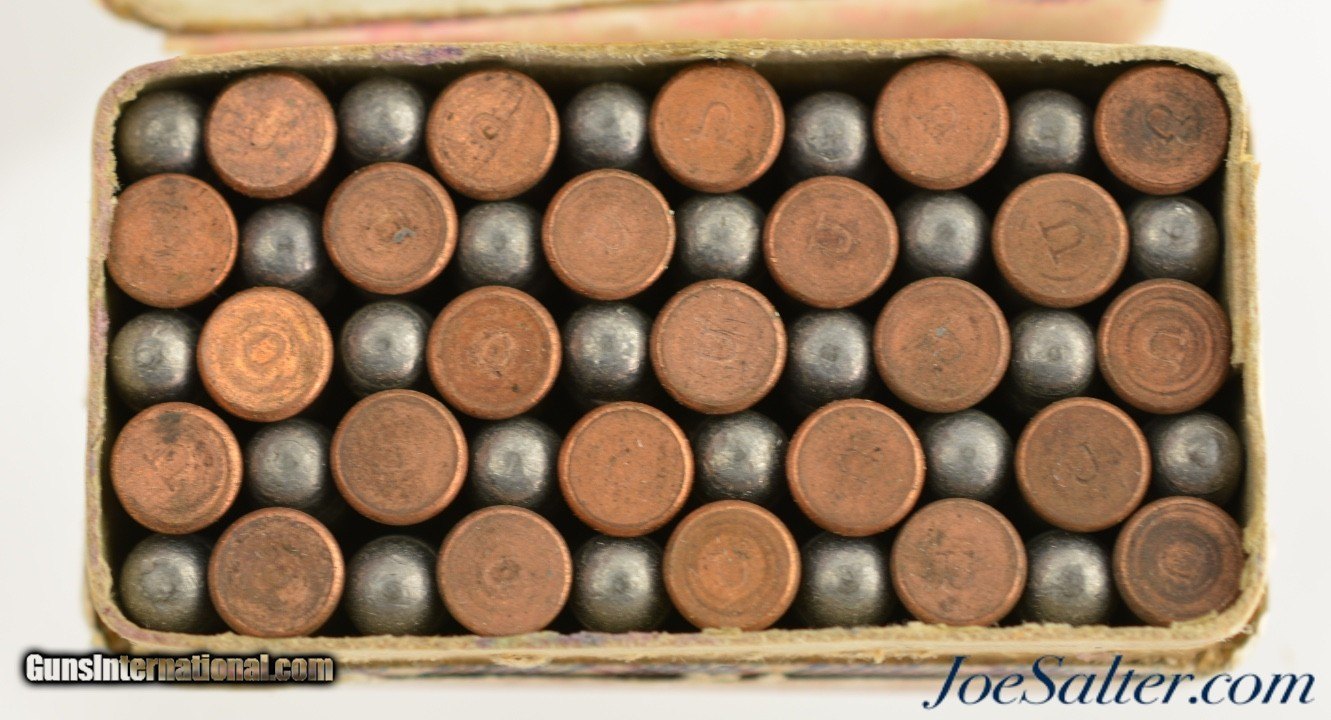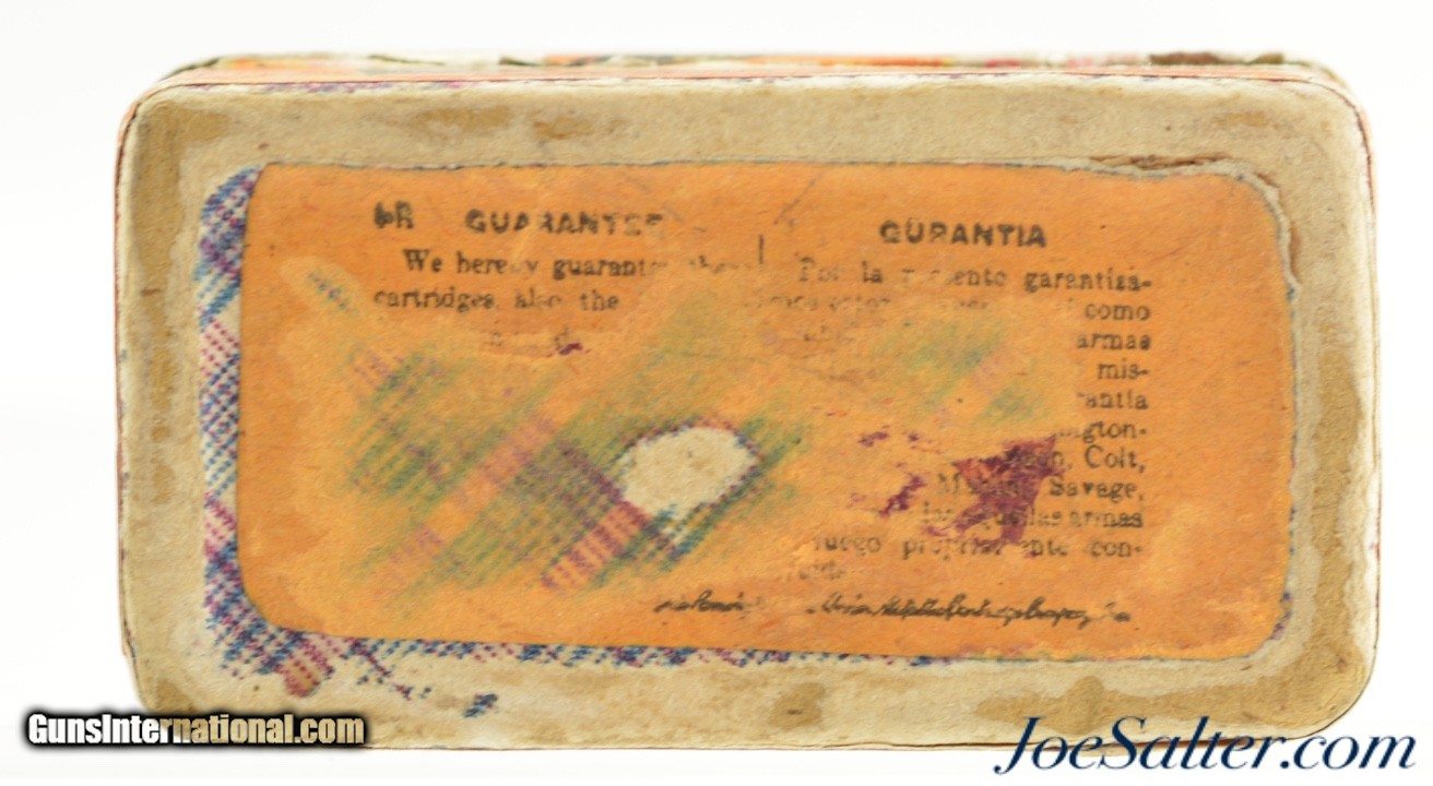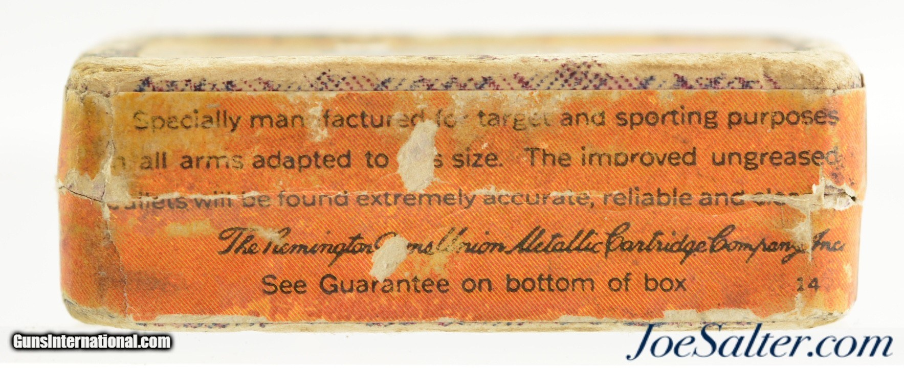 Description: This is a full box, 50 rounds, of .22 short ammunition manufactured by Remington UMC as part of the second combined logo Remington UMC issues with incorporated under the logo. The two piece fabric box shows edge and corner rub wear with very nice graphics and an excellent cartridge cut. The cartridges are in excellent condition. Identified as REM-3 S-4(a) in Roger Huegel's online .22 Rim Fire Box ID Reference. SOLD |