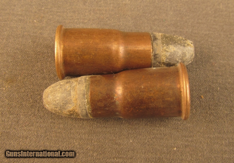 Description: Two round of 56-46 Spencer Ammo in very good condition with no headstamp and band around bullet in front of case mouth. Cases show a light cleaning, bullets still have wax lubricant, now turning yellow. This ammo was produced from 1866 to 1919 by several companies. SOLD Manufacturer: Dominion Model: Ammo Caliber Info: .56-46 Spencer Gauge Info: .56-46 Spencer |