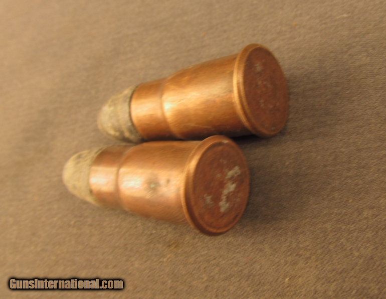 Description: Two round of 56-46 Spencer Ammo in very good condition with no headstamp and band around bullet in front of case mouth. Cases show a light cleaning, bullets still have wax lubricant, now turning yellow. This ammo was produced from 1866 to 1919 by several companies. SOLD Manufacturer: Dominion Model: Ammo Caliber Info: .56-46 Gauge Info: .56-46 |