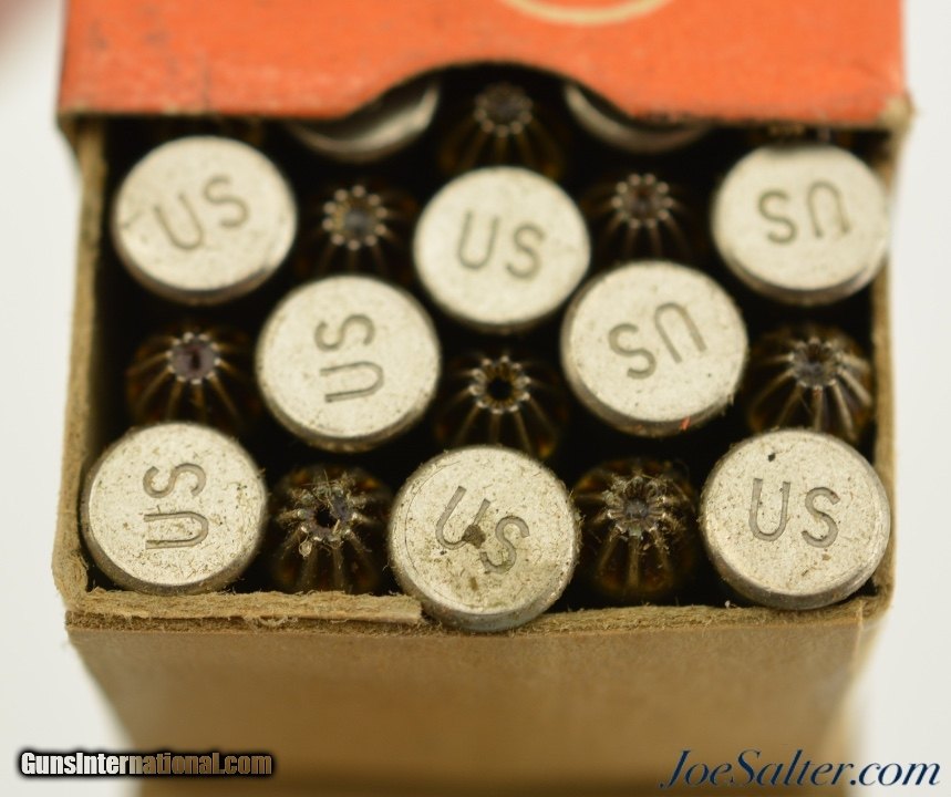 Description: This is a full box, 50 original rounds, of .22 LR ammunition manufactured by the US Cartridge Co. in New York, NY in 1931 as part of the Speedster Copperhead issues. The box is in excellent condition with bright colors and crisp graphics very nice edges and corners. The cartridges are in excellent condition. A great box! Identified as US-13 LR-5 in Roger Huegel's online .22 Rim Fire Box ID Reference. Price: $95.00 Contact Seller |