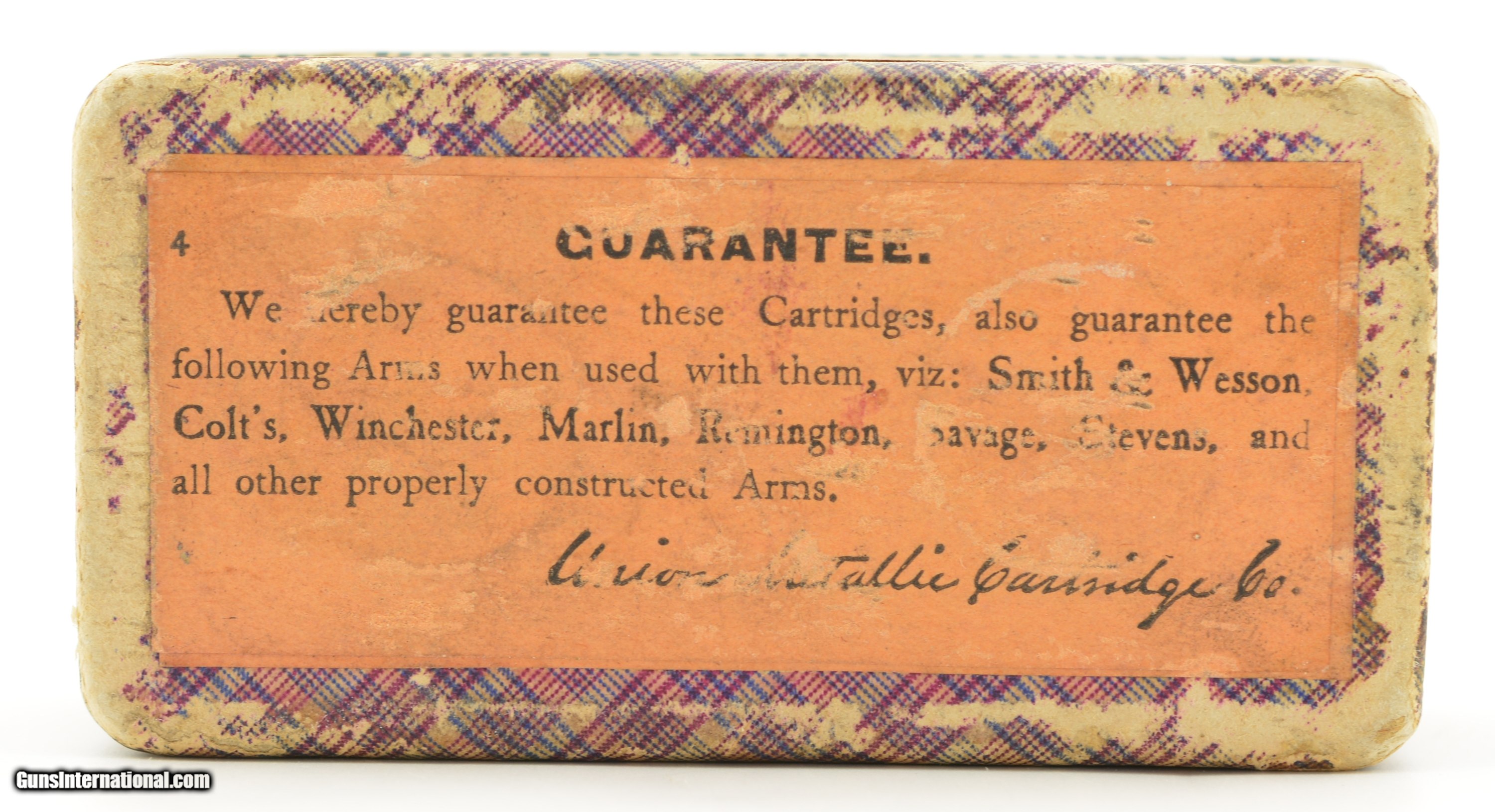 Description: This is a seldom-seen sealed box of scarce .38 Short Rim Fire ammunition with swaged bullets manufactured by UMC. The two piece fabric pattern box is solid with liget edge wear and age soiling with intact labels and excellent graphics. A fantastic box that will add to any collection and display well. SOLD Manufacturer: UMC Caliber Info: .38 Short Rim F Gauge Info: .38 Short Rim F |