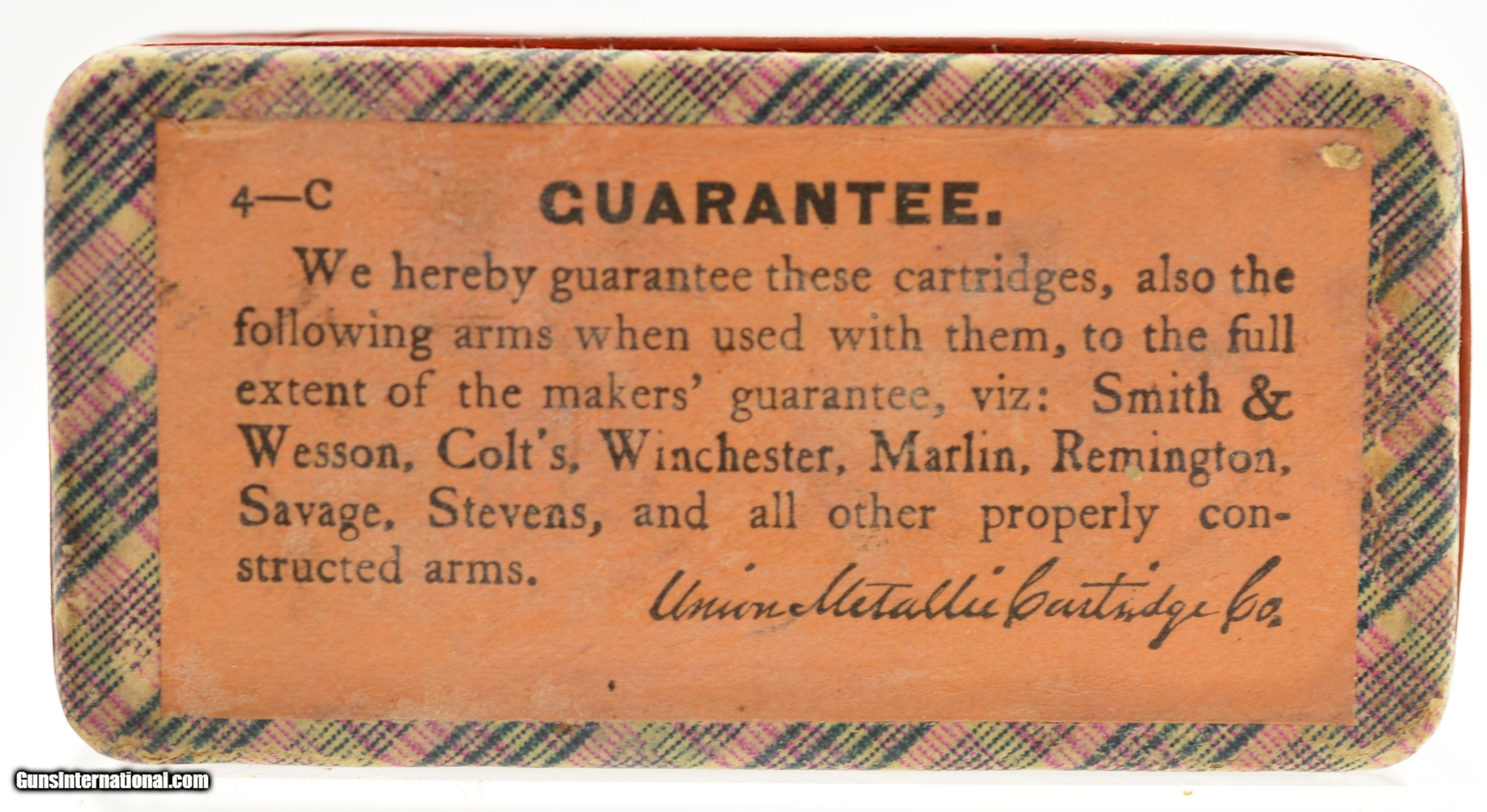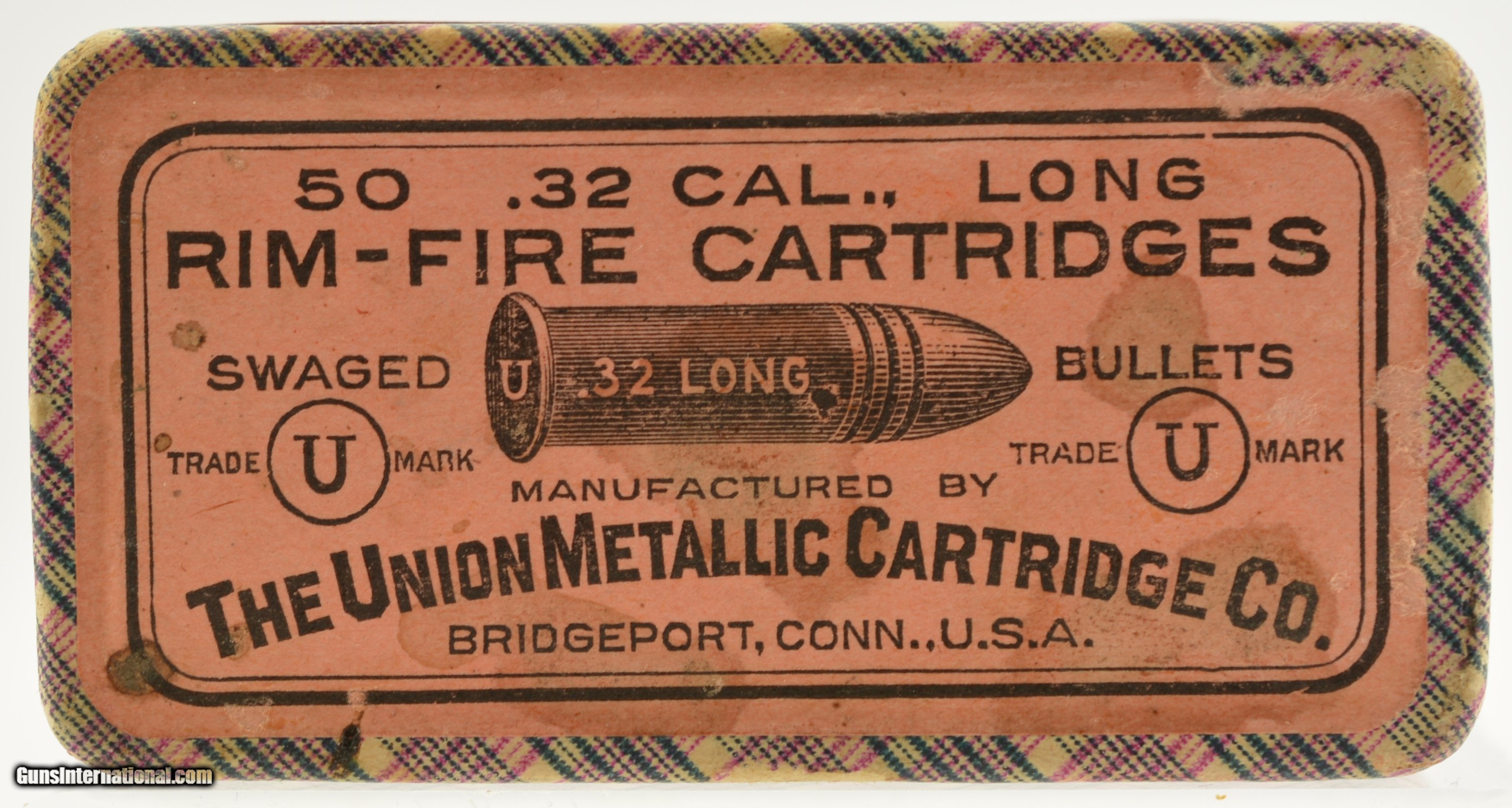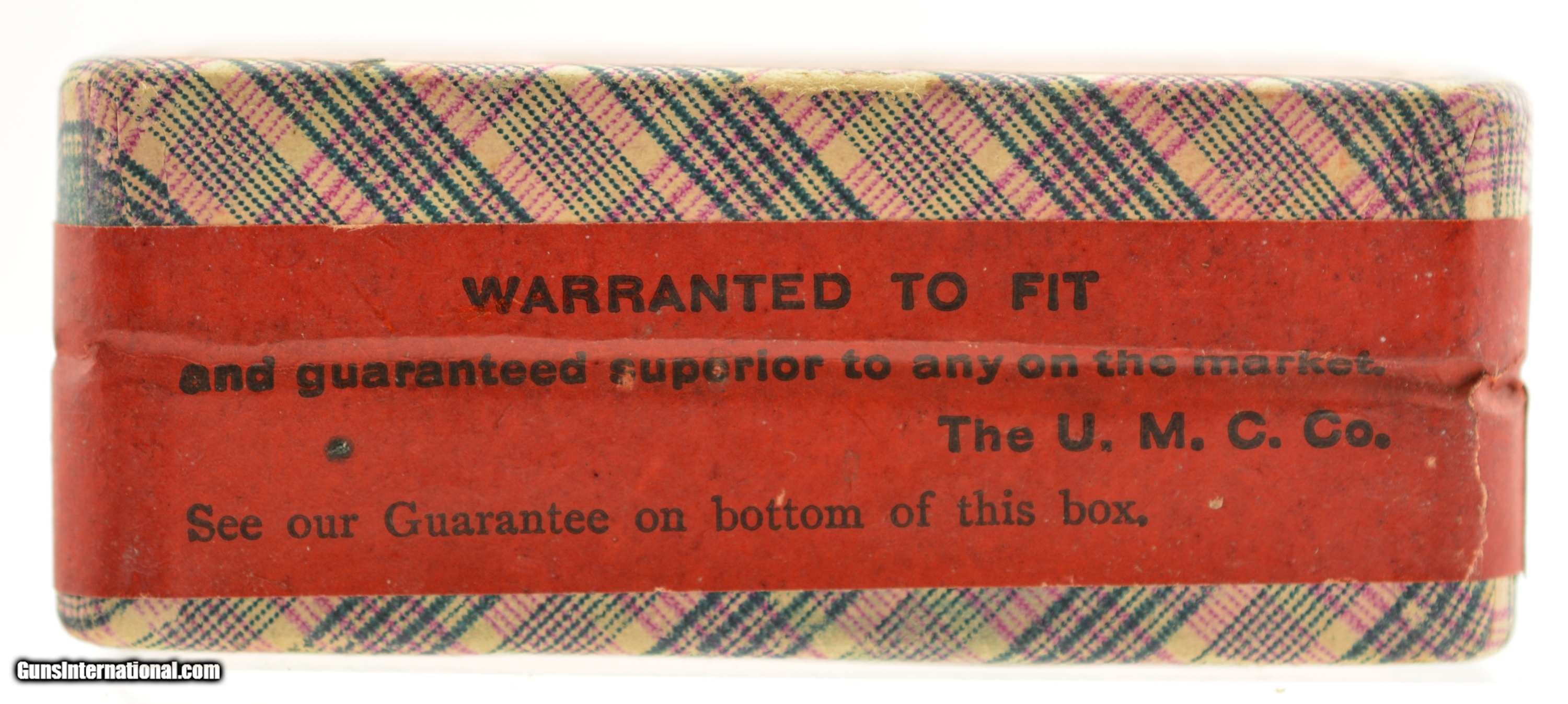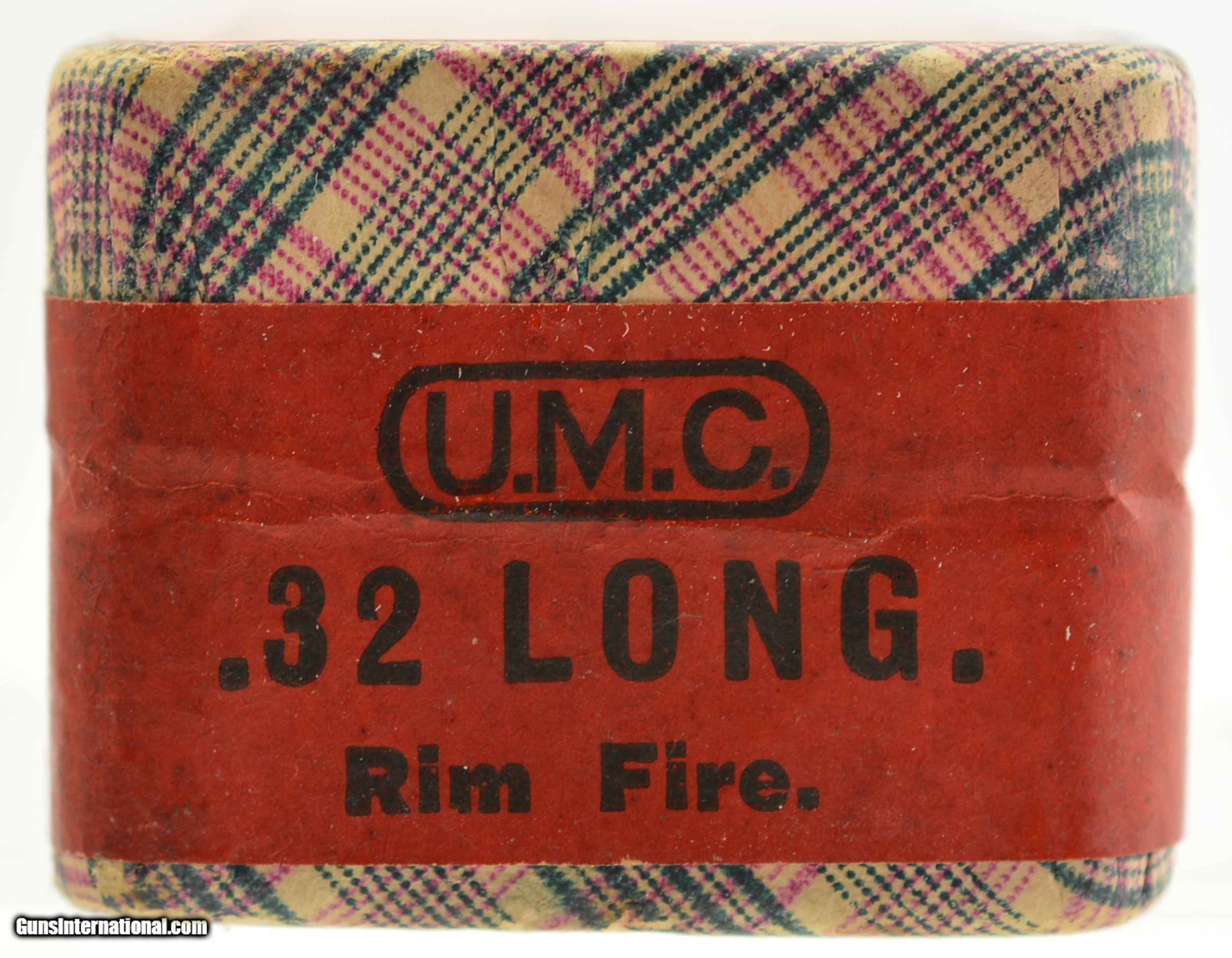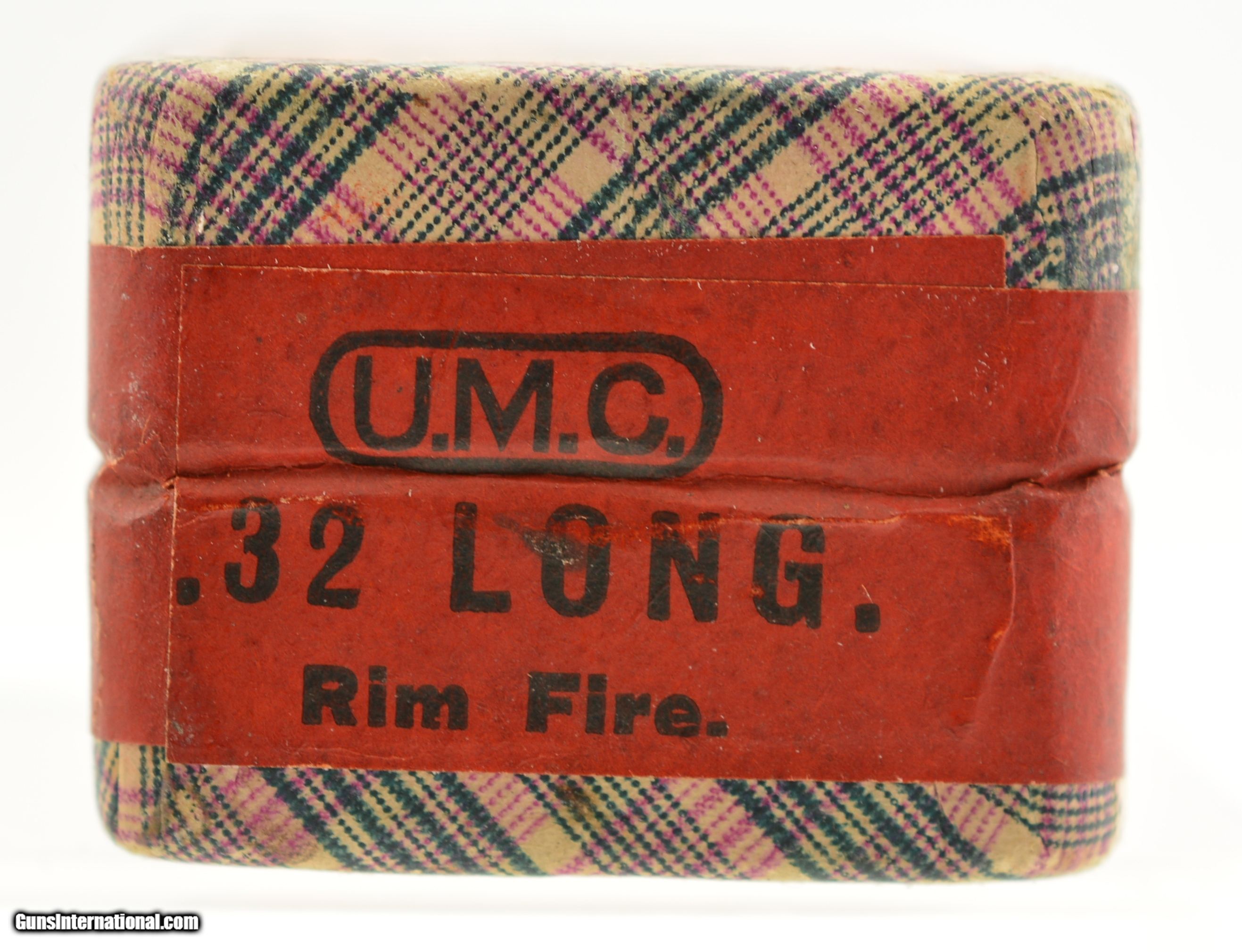 Description: This is a full, sealed box, 50 original rounds, of .32 Long Rim Fire black powder ammunition manufactured by UMC with Swaged Bullets. The one piece blue, white and pink “Fabric" box with round corners is in excellent condition, with a fully intact top primary and side seals with some very small edge rubs and staining. An excellent box for any collection. SOLD Manufacturer: UMC Model: Ammo Caliber Info: .32 RF Gauge Info: .32 RF |