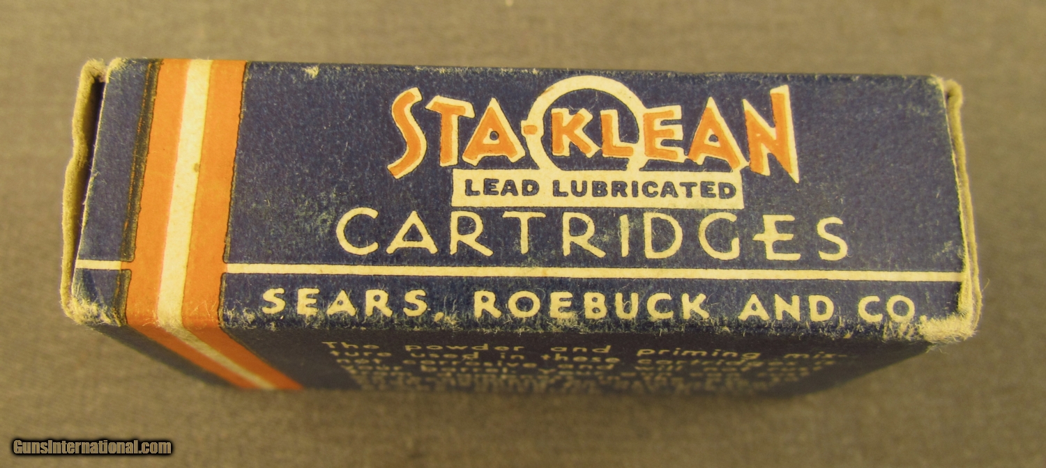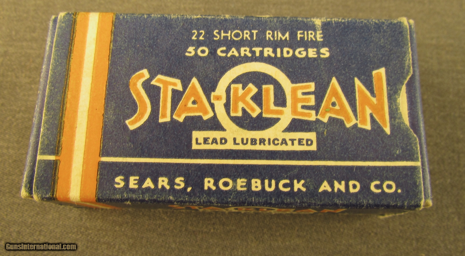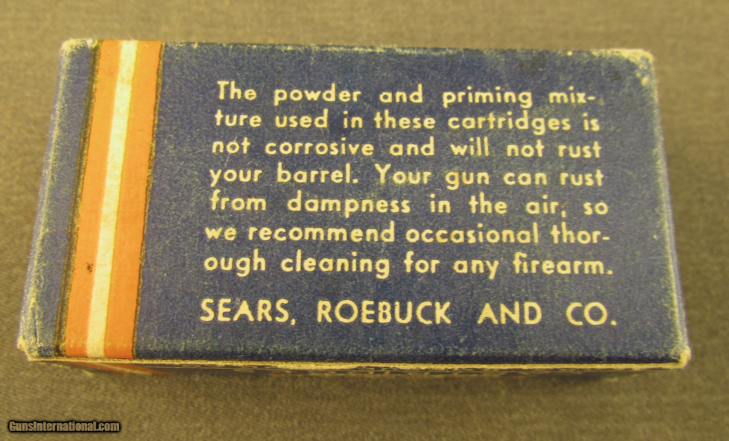 Description: This full one piece box remains in excellent condition with light shelf wear on corners and bright clean labels. Box contains lead round nosed bullets in brass cases with no headstamp. This is listed in Tony Dunn's upgrades as Sears-5-5-1-B. SOLD Manufacturer: Sears Model: Ammo Caliber Info: .22 Short Gauge Info: .22 Short |