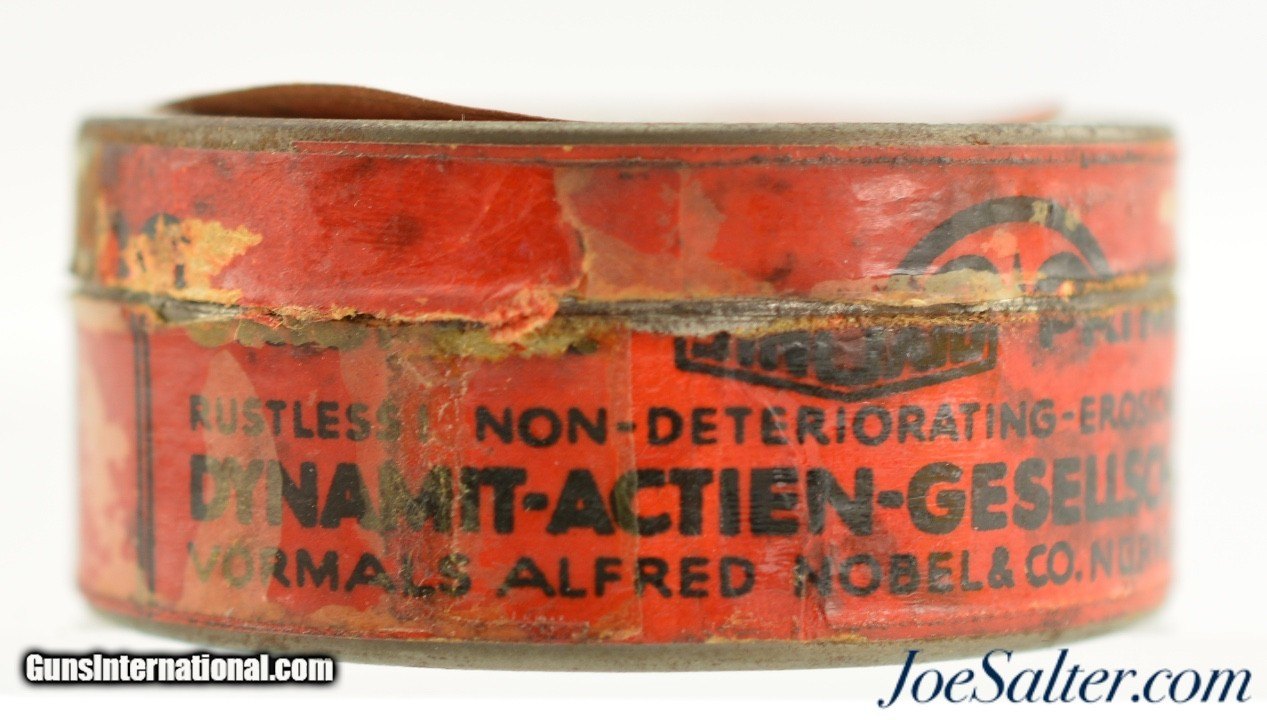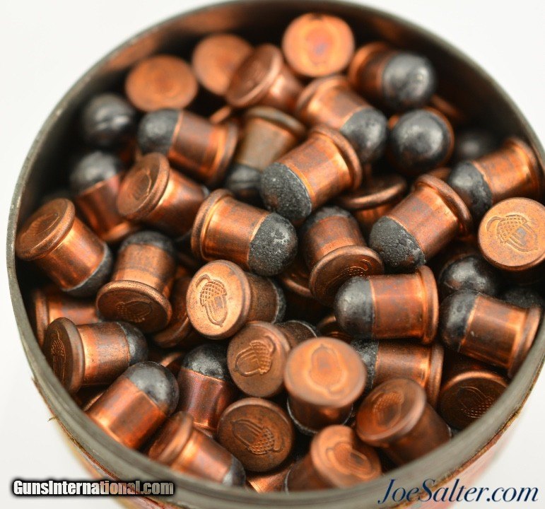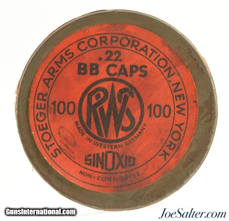 Description: This is a partially full tin, 99 rounds, of .22 BB Cap ammunition manufactured by RWS in Germany and sold under the Stoeger Arms Corporation brand. The tin shows age darkening and the cartridges are in excellent condition. SOLD |