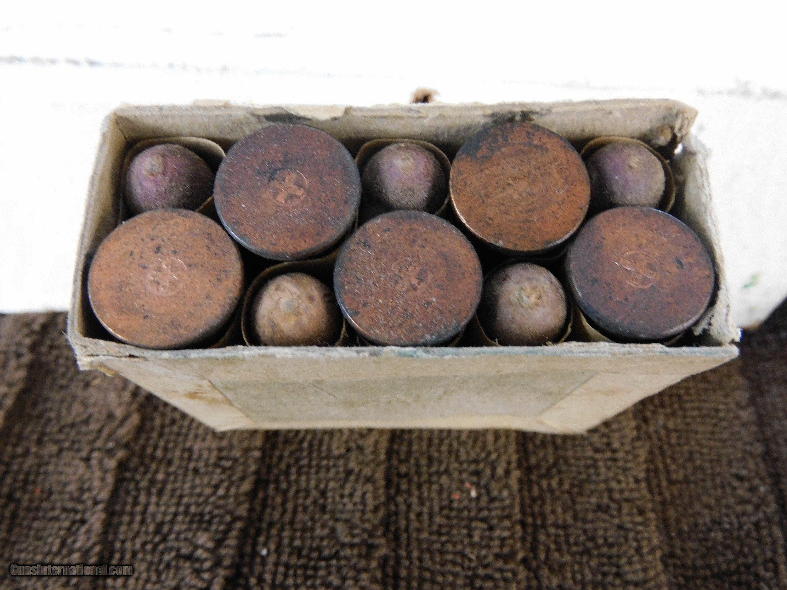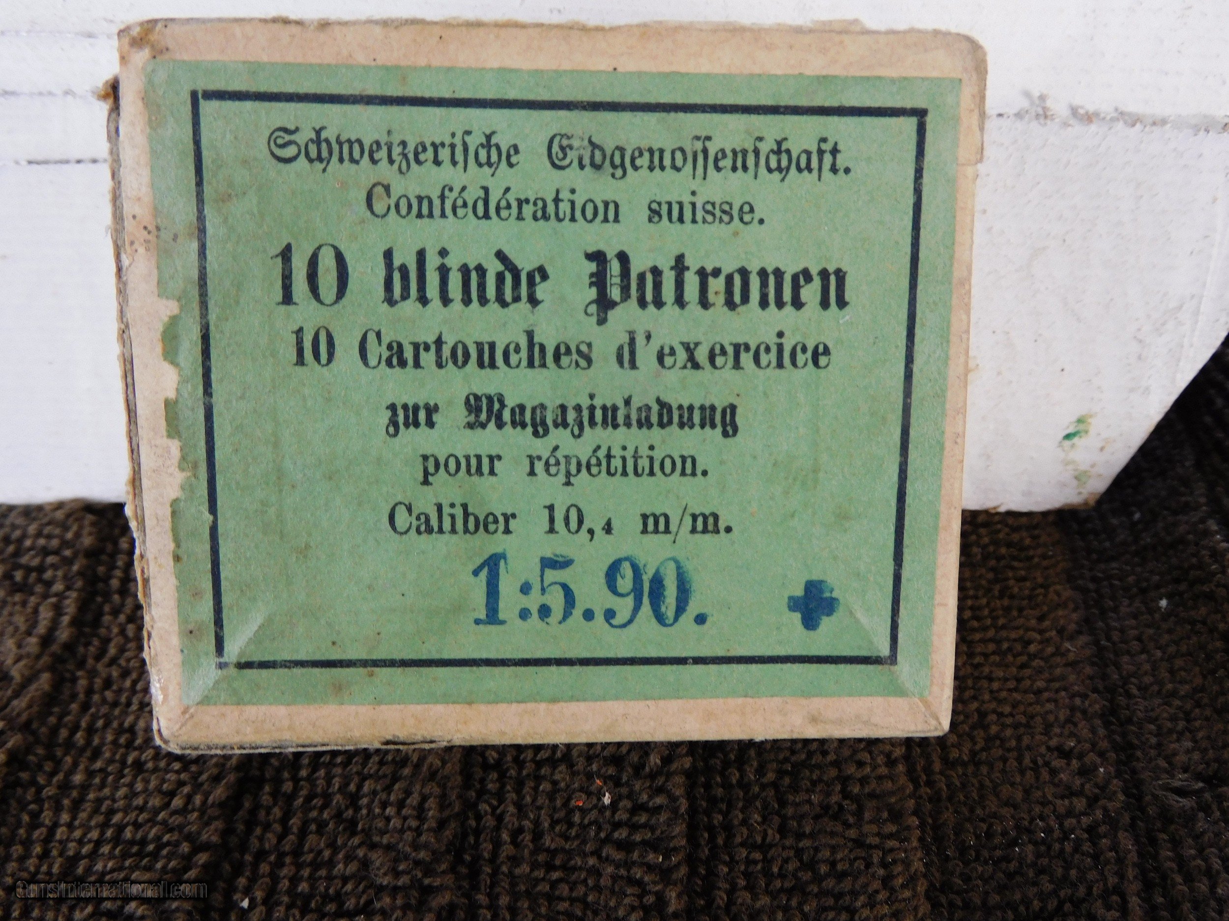 Description: #3962MA Swiss 10.4 RF with wood bullets in green label box, no cover, 10 rds., exc. label, circa about 1920. $50 SOLD |