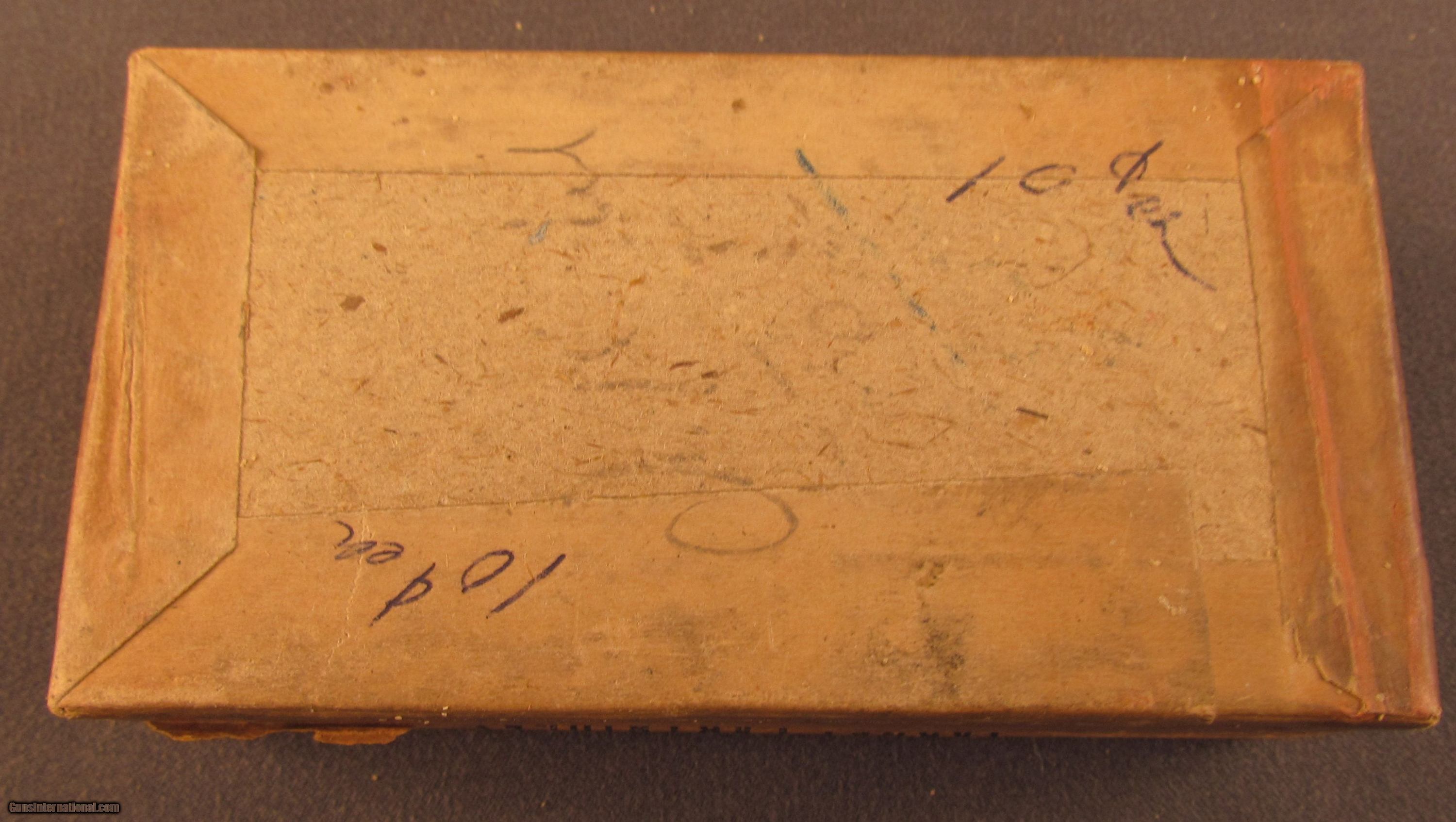 Description: Original Box with 49 original U.S. head stamped rounds. The 38 short RF target cartridges remain in very good to excellent condition. The lead bullets show overall even oxidizing and old factory grease. The shell cases show bright copper. The 2 piece box cover show spotting but clear graphics. The band is marked target cartridges and the 38 short marking on both ends . A very good rim fire box. SOLD Manufacturer: U.S. Cart. Co. Model: Ammo Caliber Info: .38RF Gauge Info: .38RF |