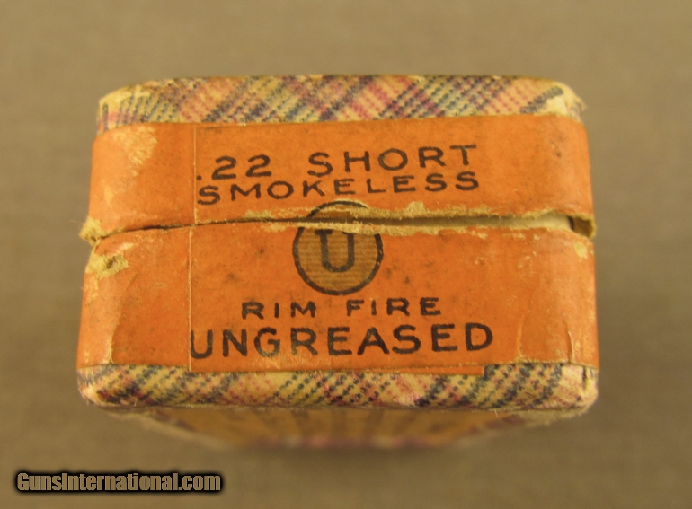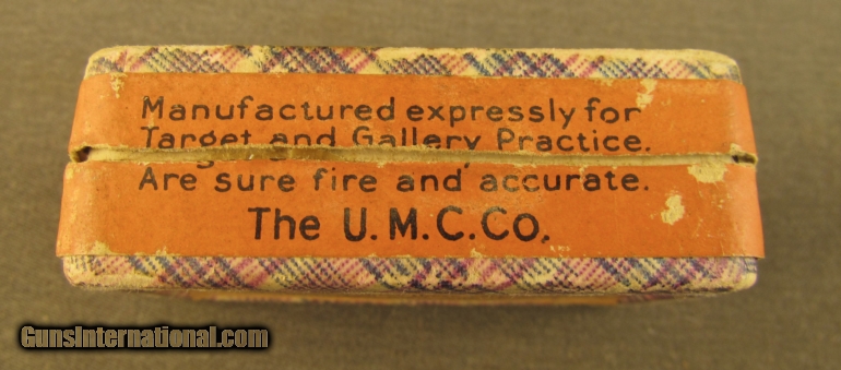 Description: This full opened 50 round two piece half split box is from the desirable "4 U" series issued between 1900 and 1910. Box shows light soiling with scuffing on corners. Side label was cut and remains fully legible. Ammo is bright and clean. Listed in Dunn upgrades as UMC 10-5-4. Bottom has the 4 -A guarantee listing seven makers names. A very hard to find box. SOLD Manufacturer: UMC Model: Ammo Caliber Info: .22 Short Gauge Info: .22 Short |