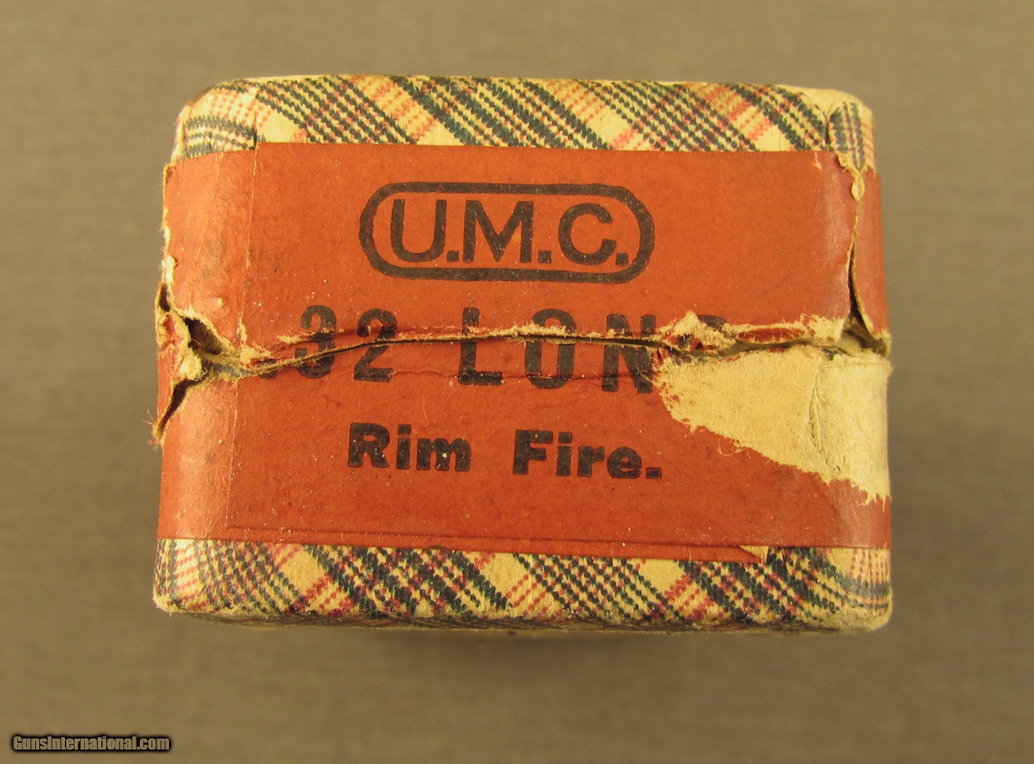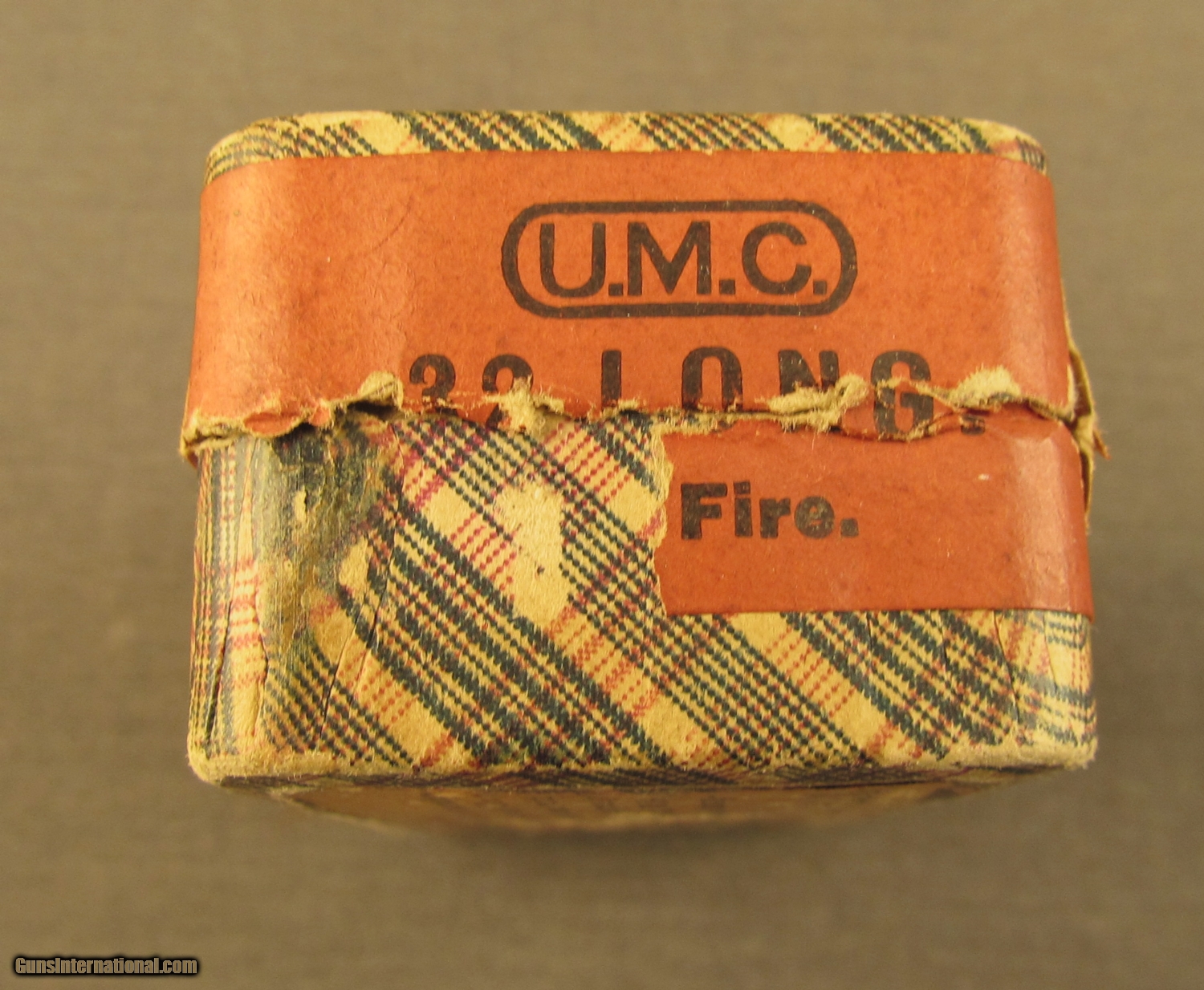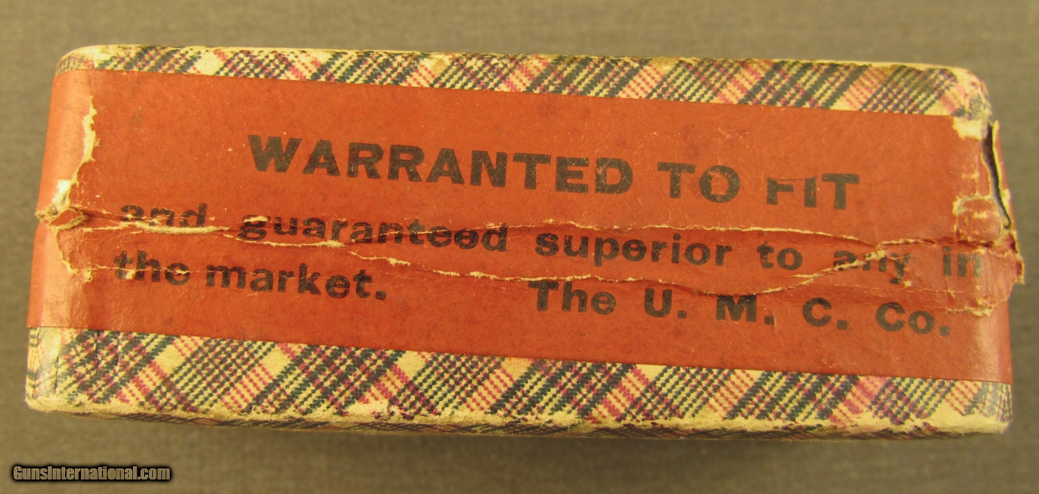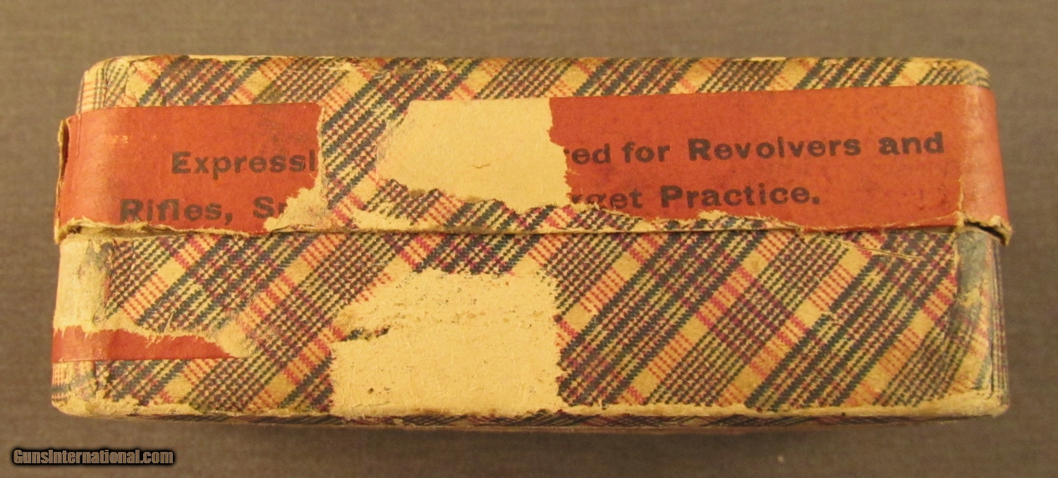 Description: This two piece half split partial (38 rounds) box remains sealed along one long side. This box dates to the 1880's and it remains in very good condition with light staining on top label. Side sealing label is 70% present and bottom guarantee is scuffed and worn. The round corner box has the blue and red plaid wallpaper design and now shows some scuffs on edges and corners. SOLD Manufacturer: UMC Model: Ammo Caliber Info: .32RF Gauge Info: .32RF |