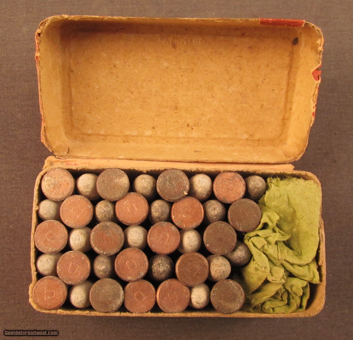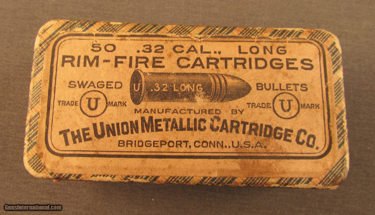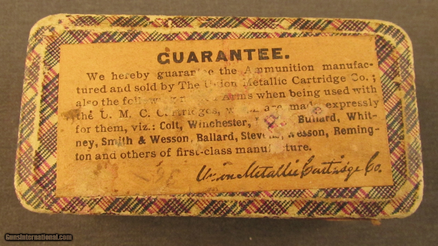 Description: This two piece half split partial (38 rounds) box remains sealed along one long side. This box dates to the 1880's and it remains in very good condition with light staining on top label. Side sealing label is 70% present and bottom guarantee is scuffed and worn. The round corner box has the blue and red plaid wallpaper design and now shows some scuffs on edges and corners. SOLD Manufacturer: UMC Model: Ammo Caliber Info: .32RF Gauge Info: .32RF |
