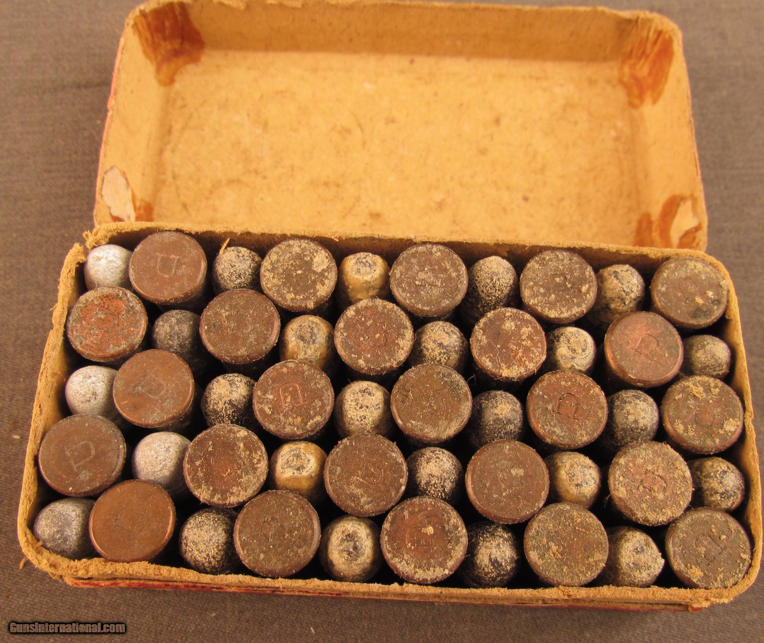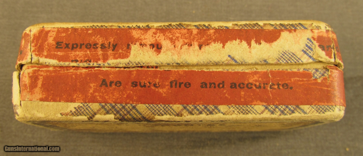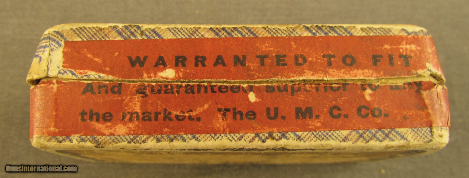Description: This full 50 round two piece half split box is from the 1880-1895 period. It remains in very good condition with worn edges and light soiling. The bottom guarantee label is scuffed and now is illegible. The side sealing label is 90% present. Several rounds are period replacements with correct U headstamps. SOLD Manufacturer: UMC Model: Ammo Caliber Info: .32RF Gauge Info: .32RF |