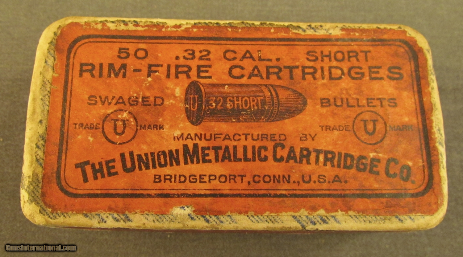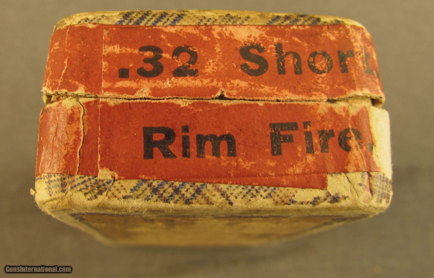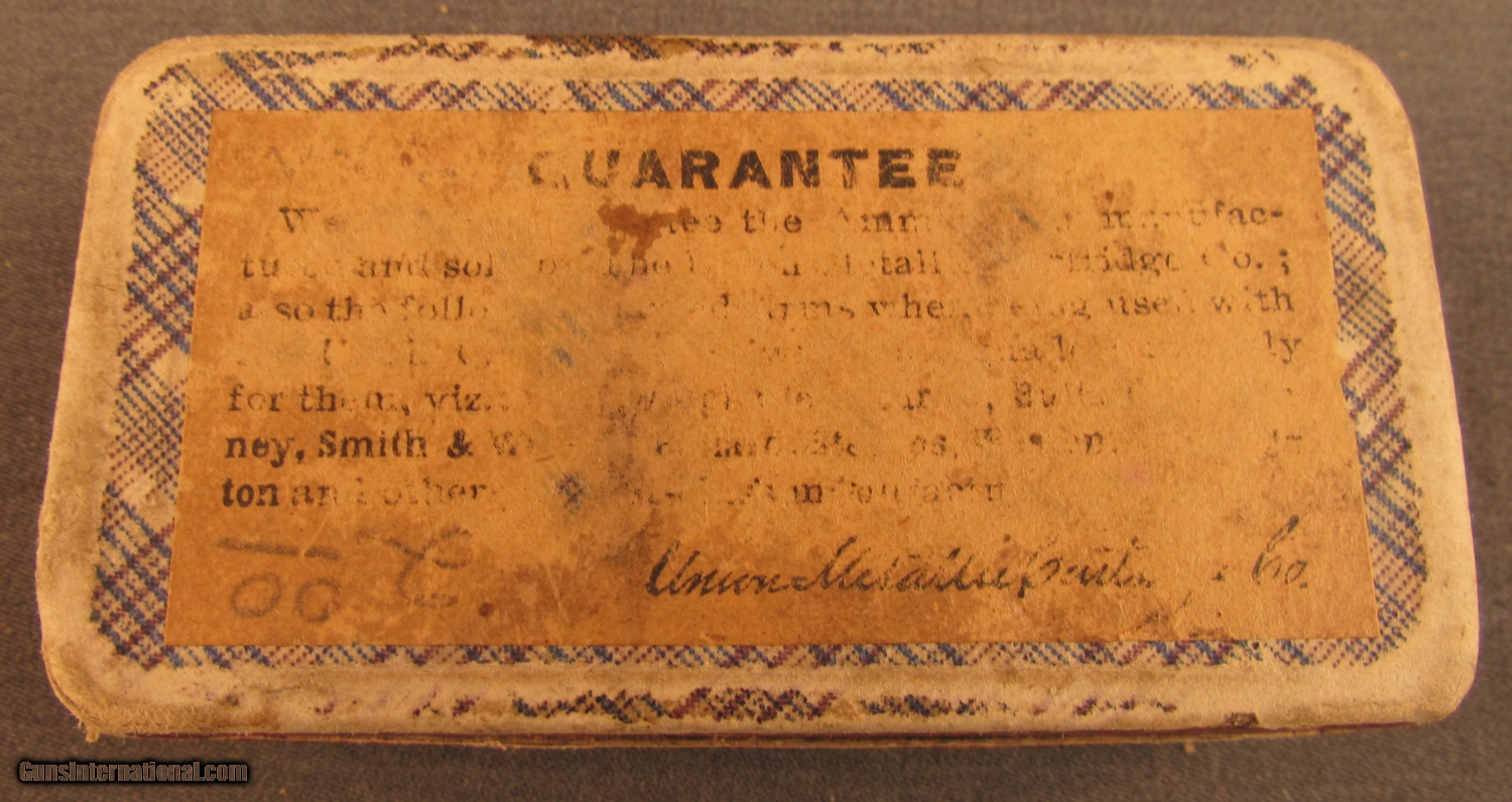 Description: This full 50 round two piece half split box is from the 1880-1895 period. It remains in very good condition with worn edges and light soiling. The bottom guarantee label is scuffed and now is illegible. The side sealing label is 90% present. Several rounds are period replacements with correct U headstamps. SOLD Manufacturer: UMC Model: Ammo Caliber Info: .32RF Gauge Info: .32RF |