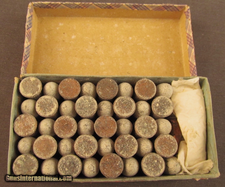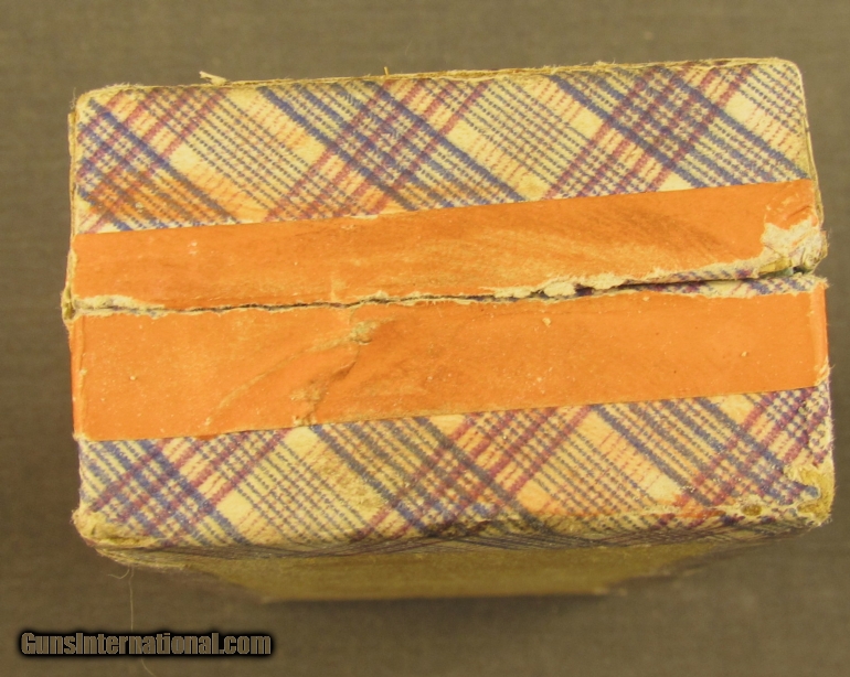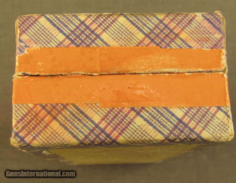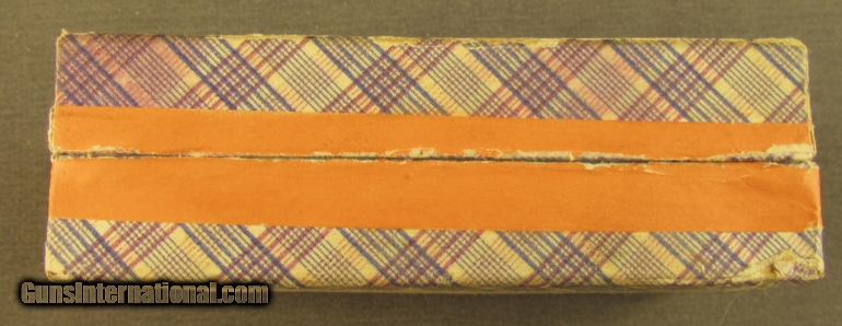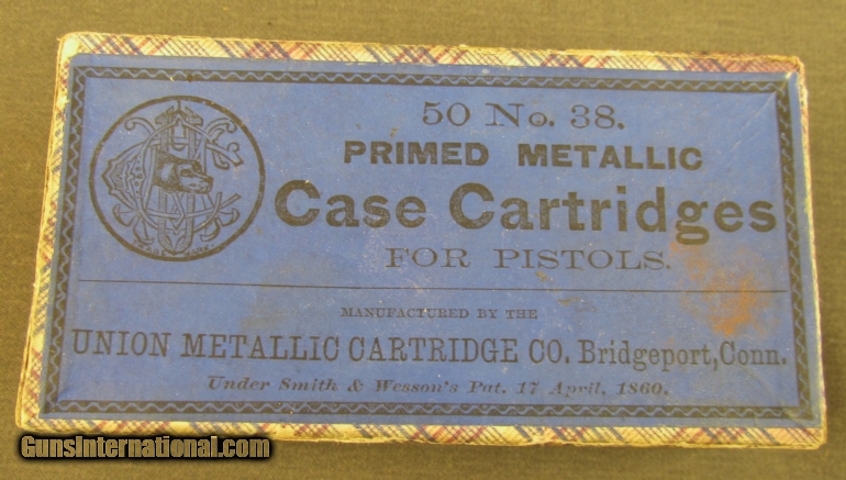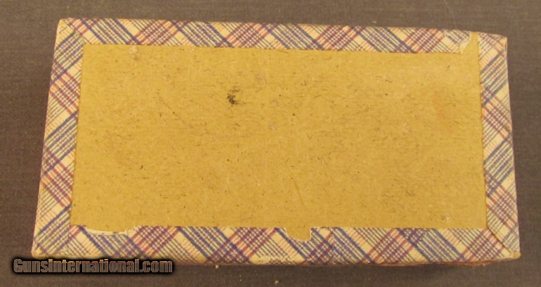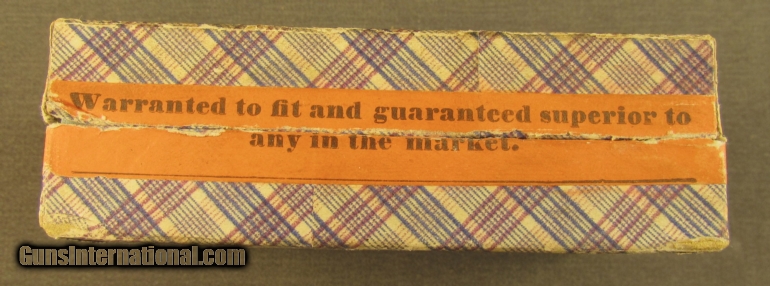 Description: This two piece half split square corner wallpaper box was built between 1867 and 1870. Box remains in excellent condition with bright labels. A light brown stain shows on top label. Side label is 98% present and fully legible on the one side with script. These early boxes with S+W patent info and early UMC logo are quite rare. SOLD Manufacturer: UMC Model: Ammo Caliber Info: .38RF Gauge Info: .38RF |