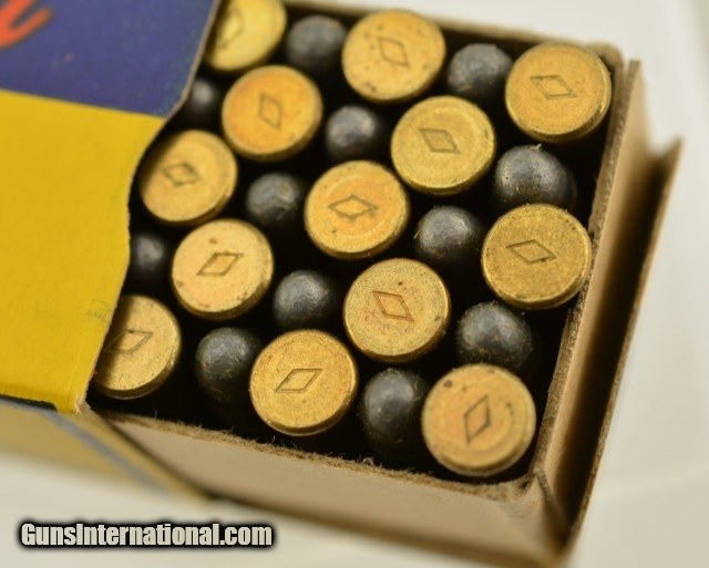 Description: This is a full box, 50 original rounds of .22 LR ammunition manufactured by Western part of the 1937-1959 issues with "K1264R" code. The yellow, blue and red box is in excellent, brick fresh condition with excellent, bright graphics and crisp edges. The cartridges are in excellent condition. Identified as WCC-52 LR-1(f) in Roger Huegel's online .22 Rim Fire Box ID reference. SOLD |