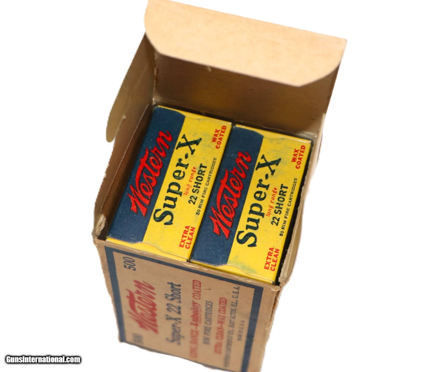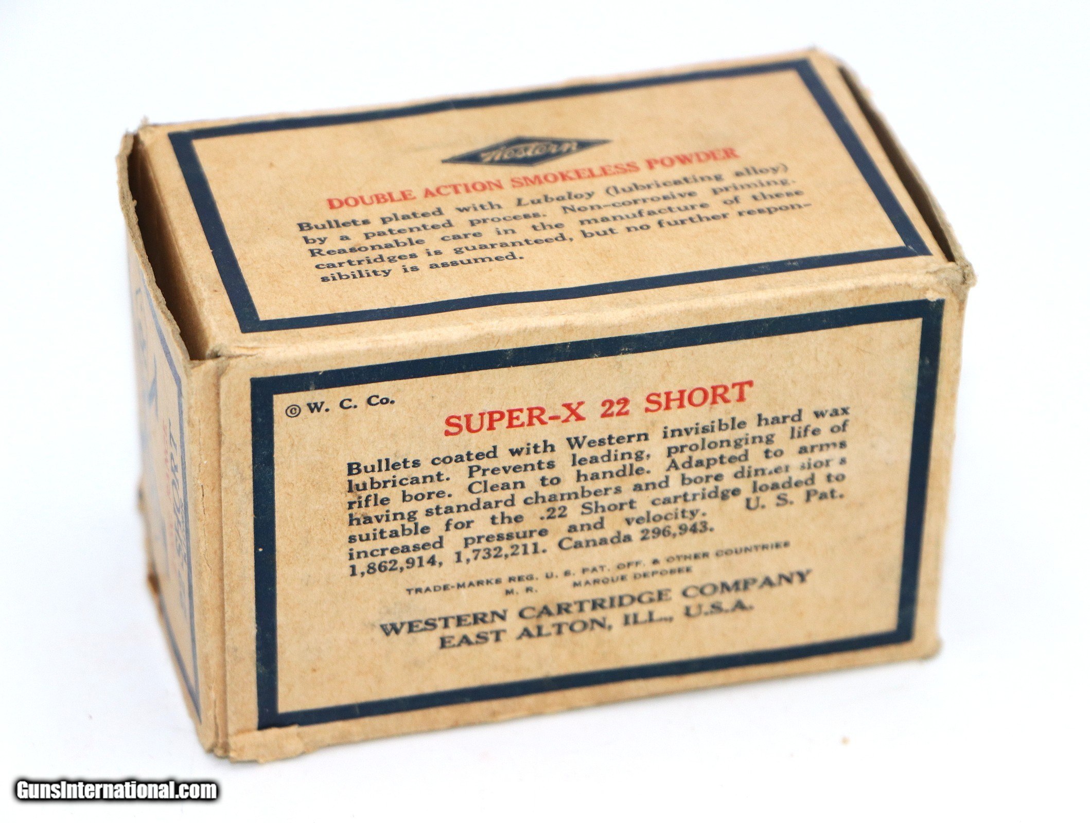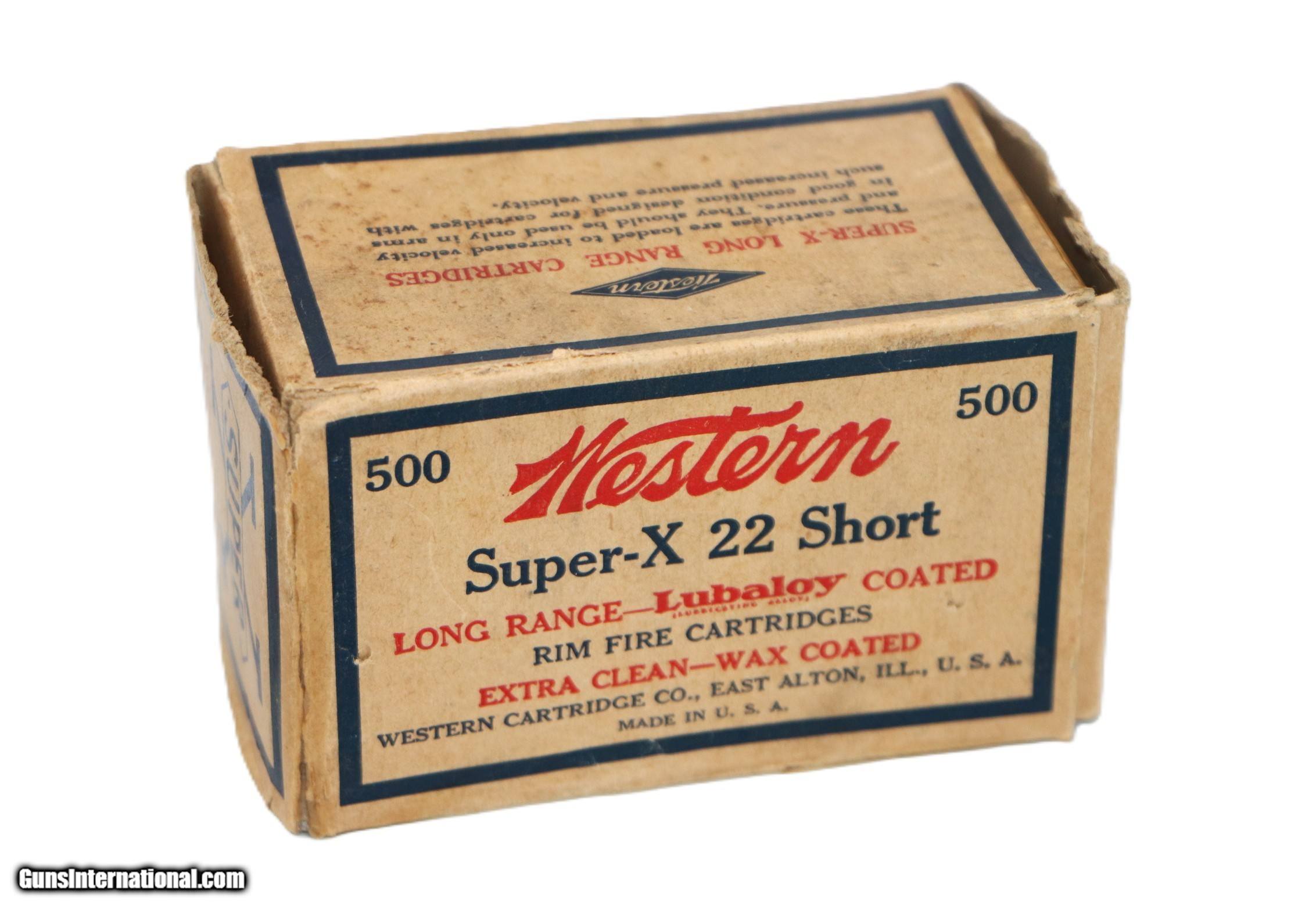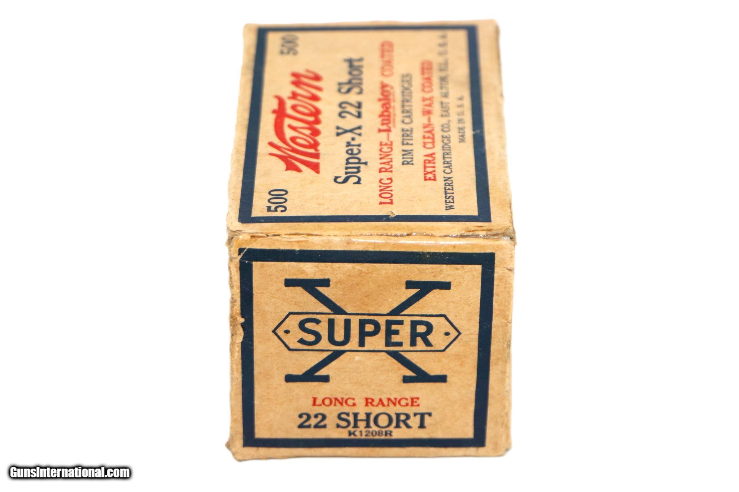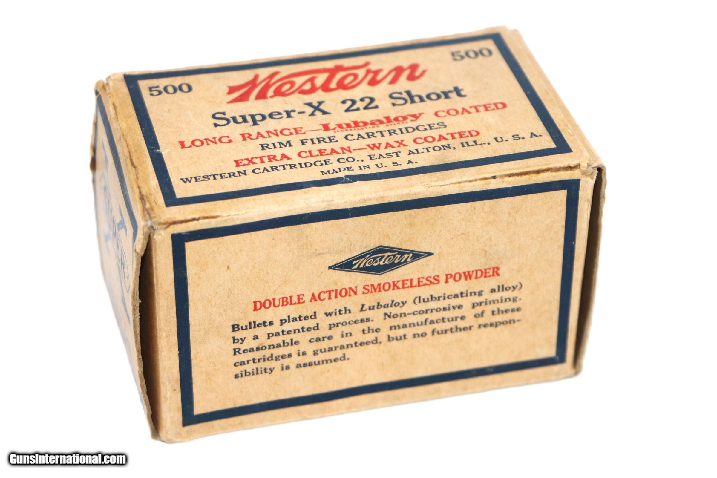 Description: Western, Super-X, .22 Short, Long Range, Lubaloy Coated, Brick - 500 Rounds. Brick box VG, flap repair, slight seam separation, inside boxes exc with exc ammo. SOLD |