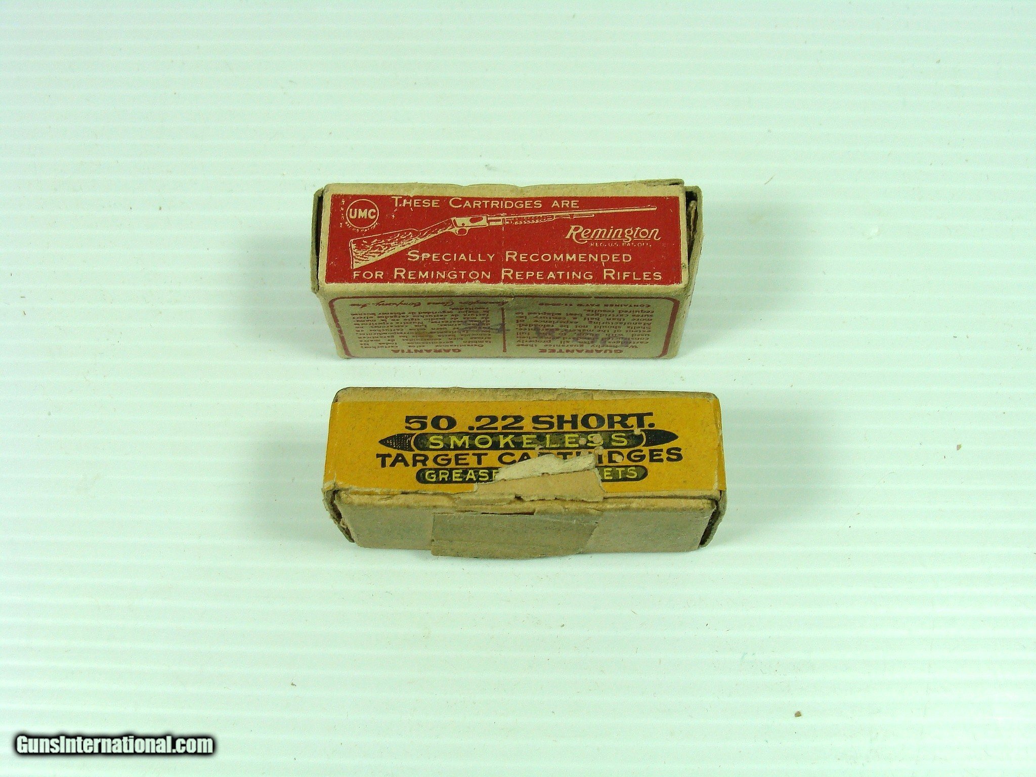 Description: Winchester Repeating Arms Co. .22 Short Smokeless & Remington Arms UMC .22 Short Lesmoke. Both are full boxes. The Winchester box has clean cartridges. The Remington UMC box cartridges have oxidation. Both boxes show wear. The Winchester box dates to early 1900's. The Remington box dates to the 1920's. ~~~~~~~~~~~~~~~~~~~~~~~~~~~~~~~~~~~~~~~~~~~~~~~~~~~~~~~~~~~~~~~~~~~~~~~~~~~~~~~~~~~~~~~~~~~~~~~~~~~~~~~~~~~~~~~~~~~~~~~~~~~~~~~~~~~~~~~~~~~~~ No guarantee or warranty is expressed or implied as to the usability of the items for its original purpose. The buyer certifies that he or she is of lawful age and is not prevented by any law from the purchase or possession of these items. The buyer is responsible for knowing, understanding and obeying all International, Federal, State and Local laws concerning the purchase and possession of these items. Please check your firearm with a competent gunsmith before firing with antique ammunition. Thanks for your interest. Offers Accepted SOLD |