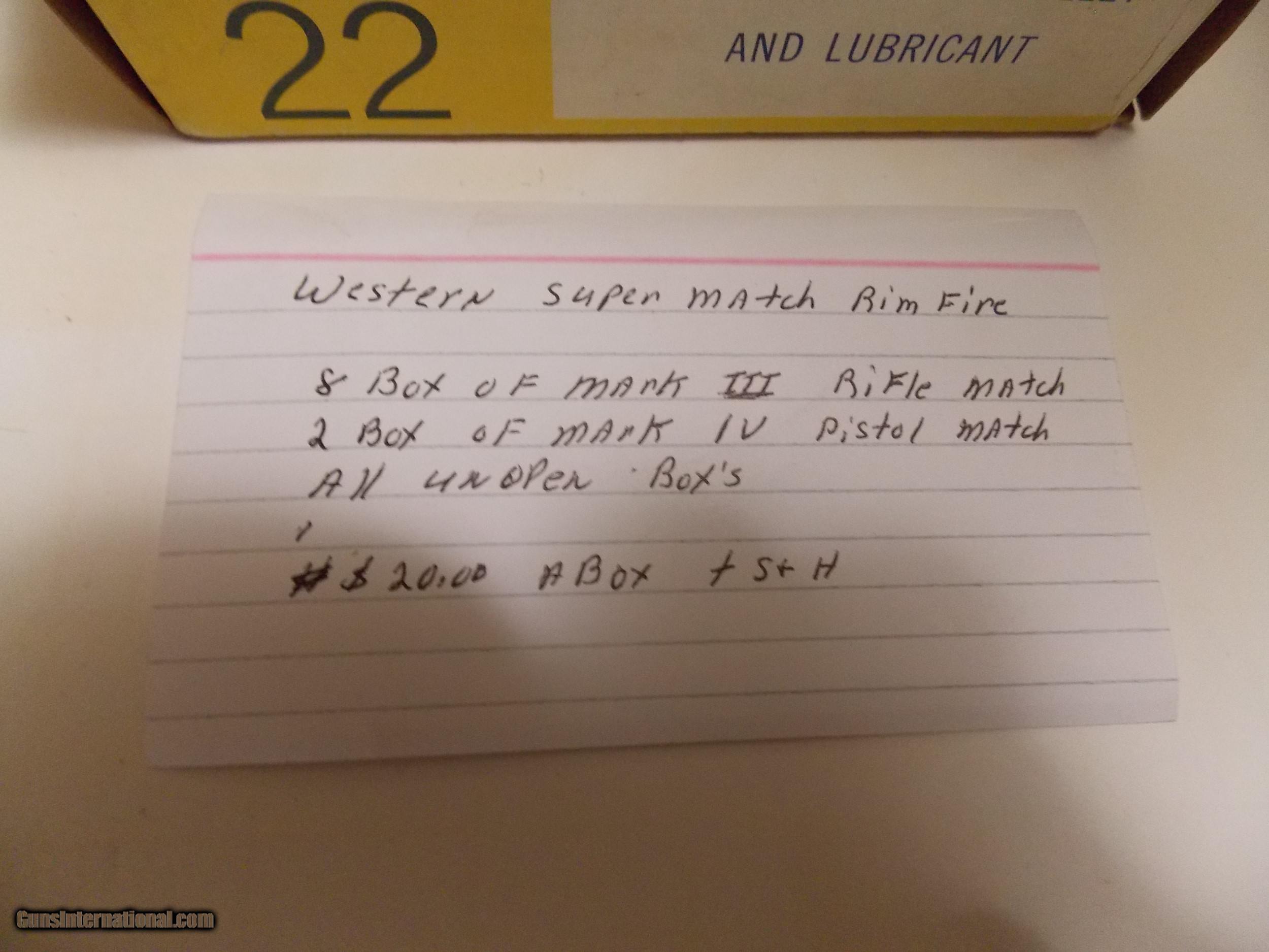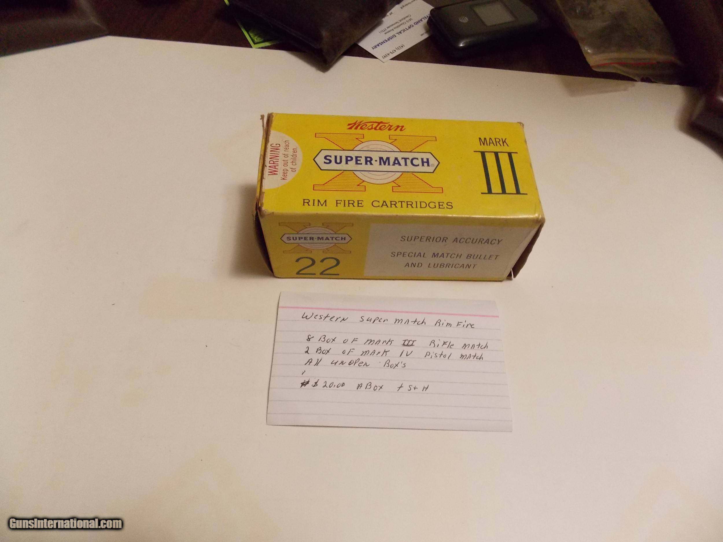 Description: american rimfire collectible 22 long rifle super match mark 111 western by winchester 8 boxes of rifle match 2 boxes of pistol match all unopend 200.00 + s&h call 423-476-2903 SOLD |