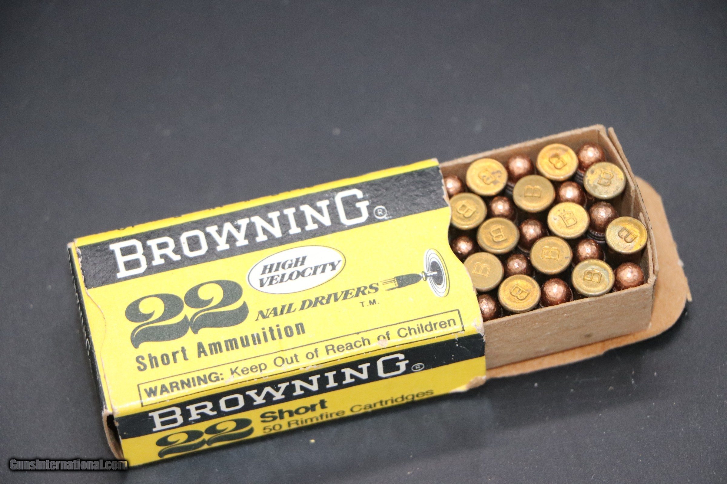 Description: Browning, 22 Short, High Velocity, Nail Drivers, 29 Grain, Solid Nose. Full 50 Rounds. Box and Ammo are excellent. Add $12.50 S+H SOLD Rifle Caliber: .22 Short |