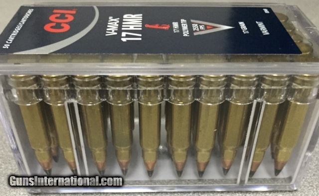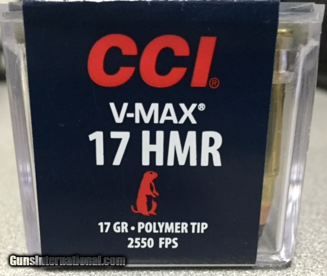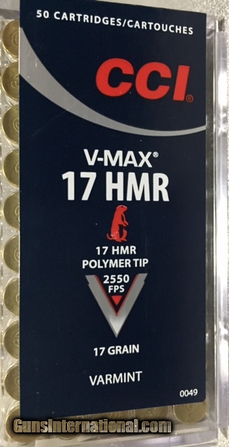 Description: CCI Ammunition 17 HMR V-MAX 17 gr Polymer Tip Muzzle Velocity; 2550 fps Box of 50 cartridges CCI Product #0049 Over 10 boxes in stock SOLD |