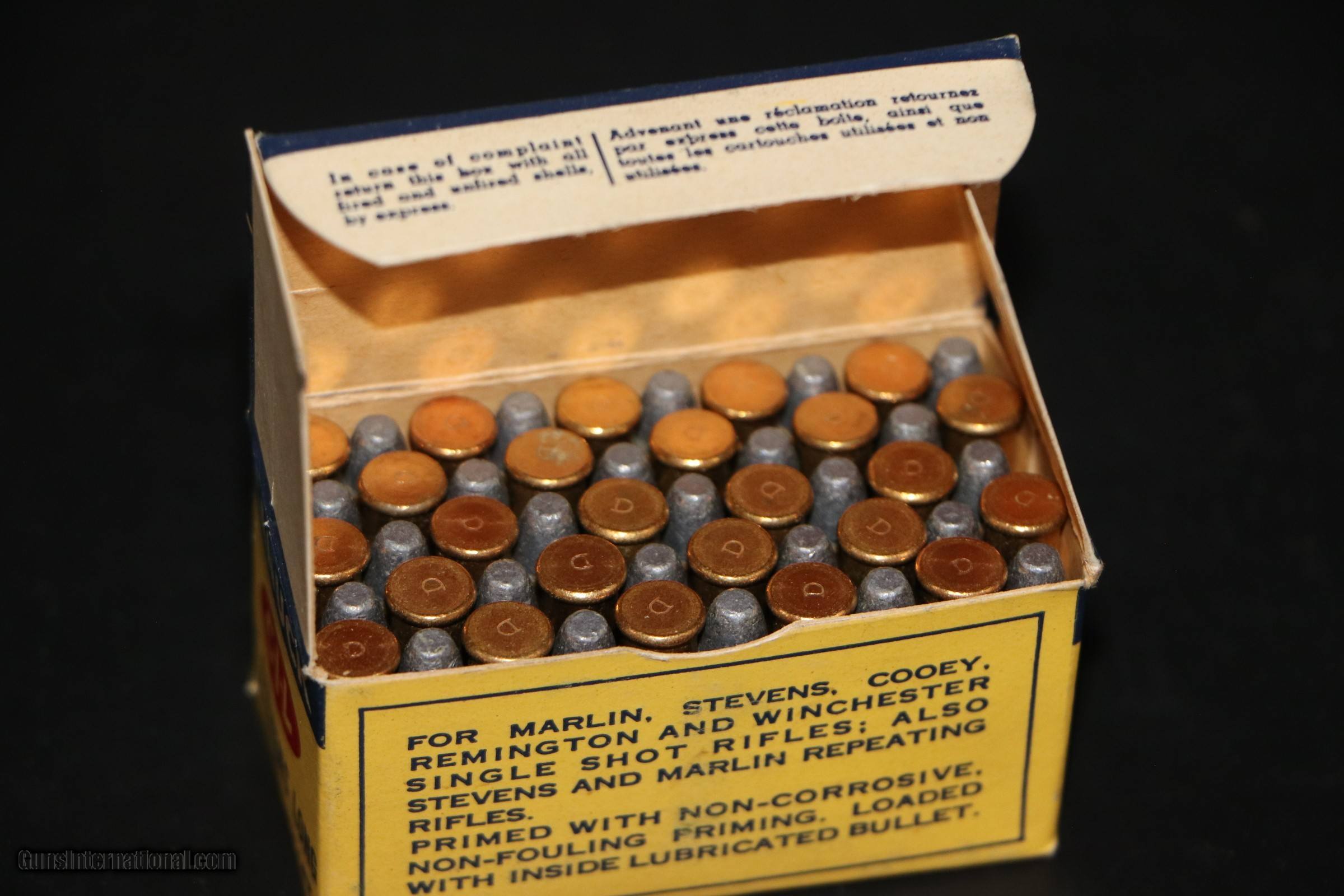 Description: C.I.L. Canuck .25 Stevens Short Rim Fire. Full yellow & blue box. Box is solid with very good color. Has some age soiling, staining, minor edge & corner wear. Top flap is solid, ammo minty. $13.50 for shipping. SOLD Rifle Caliber: .25 Stevens |