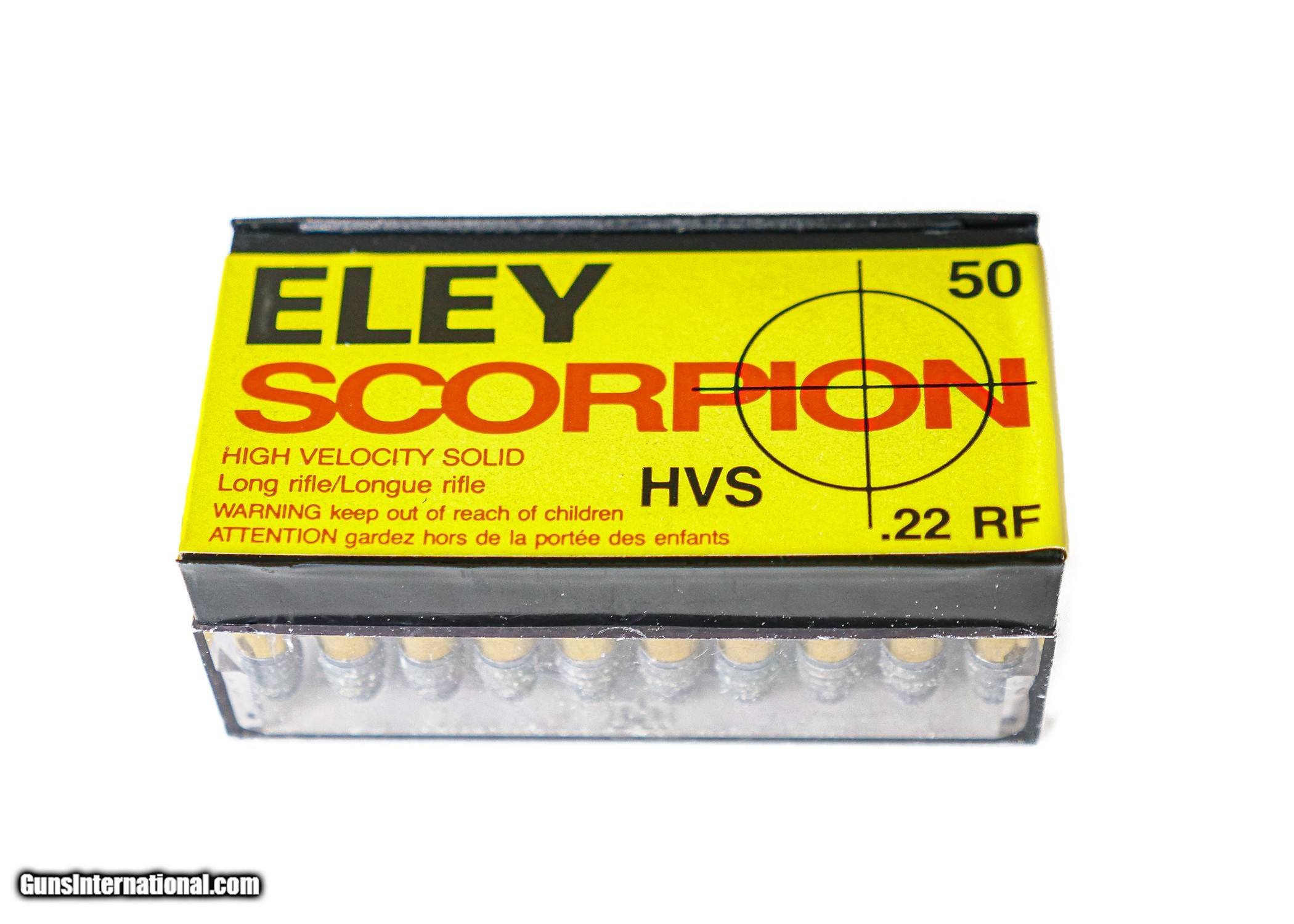 Description: A 50-pack of Eley Scorpion cartridges, high velocity solid, long rifle, .22 rimfire. SOLD |