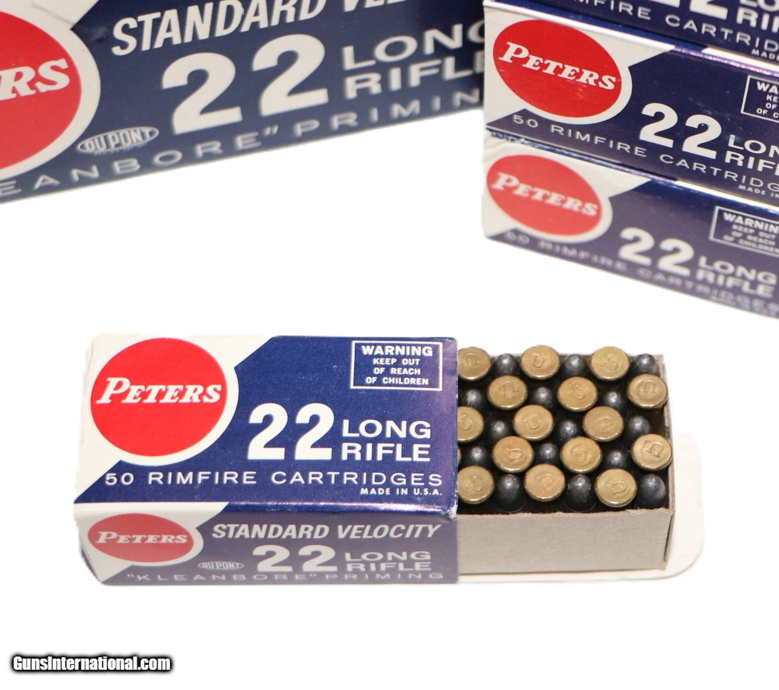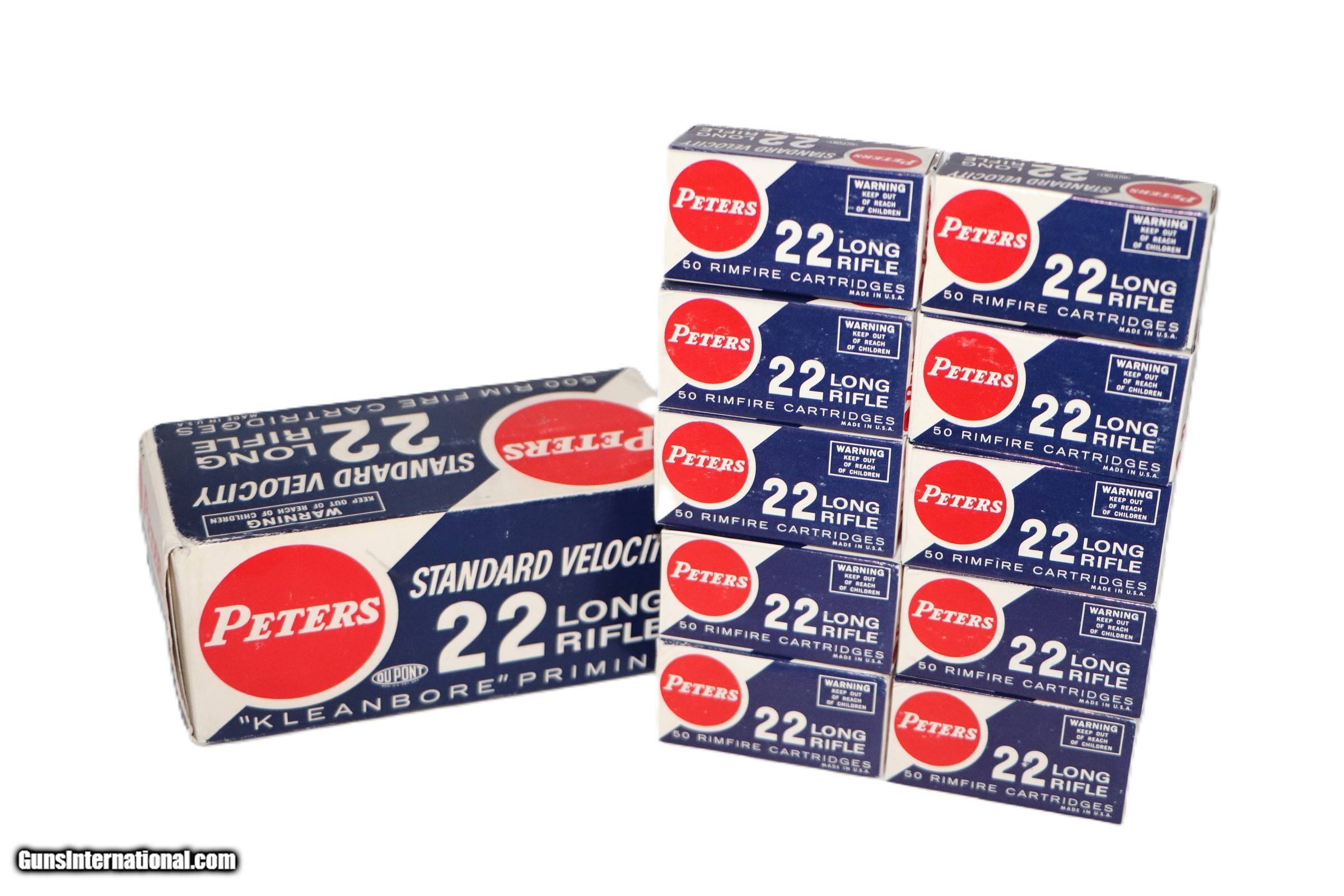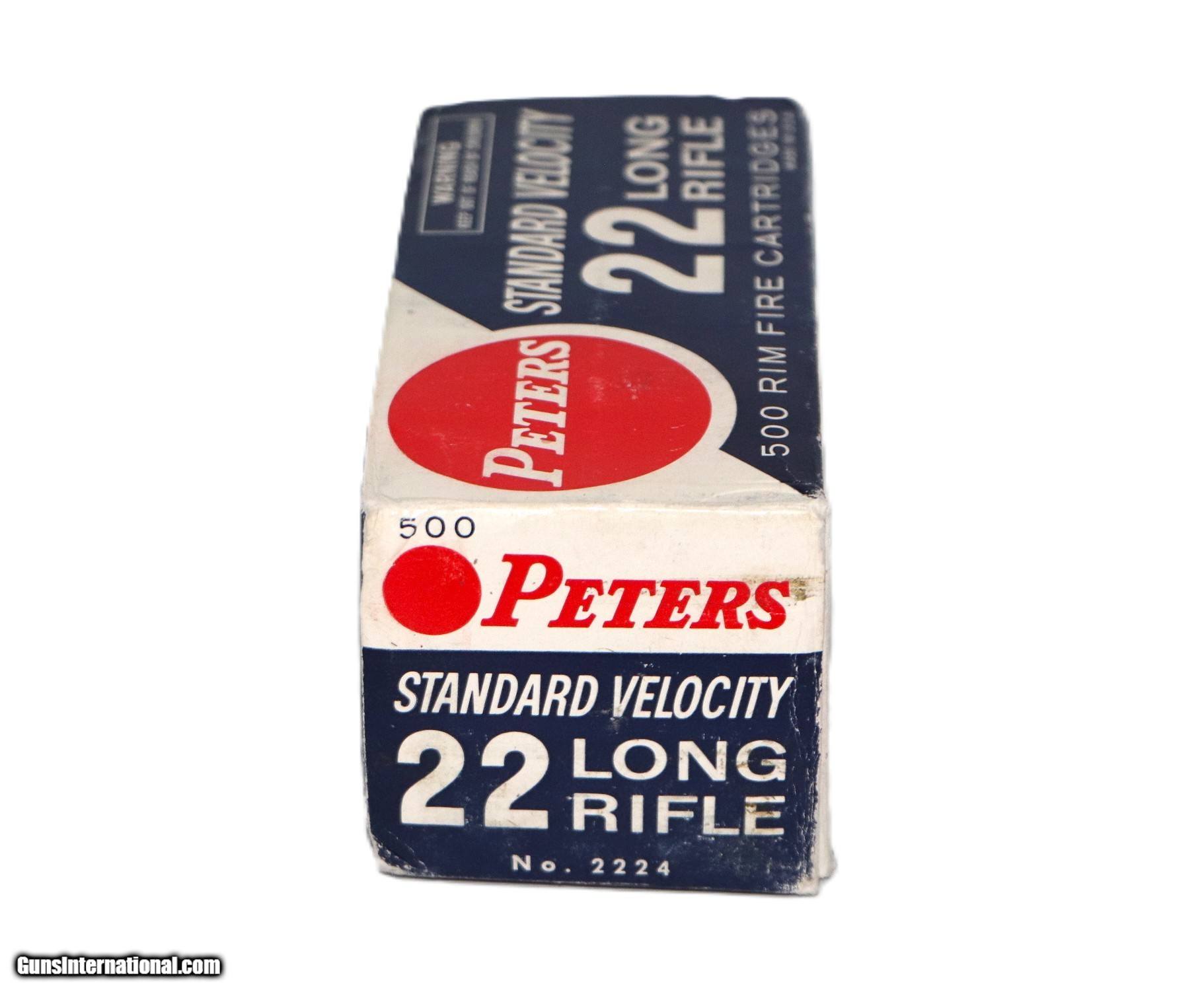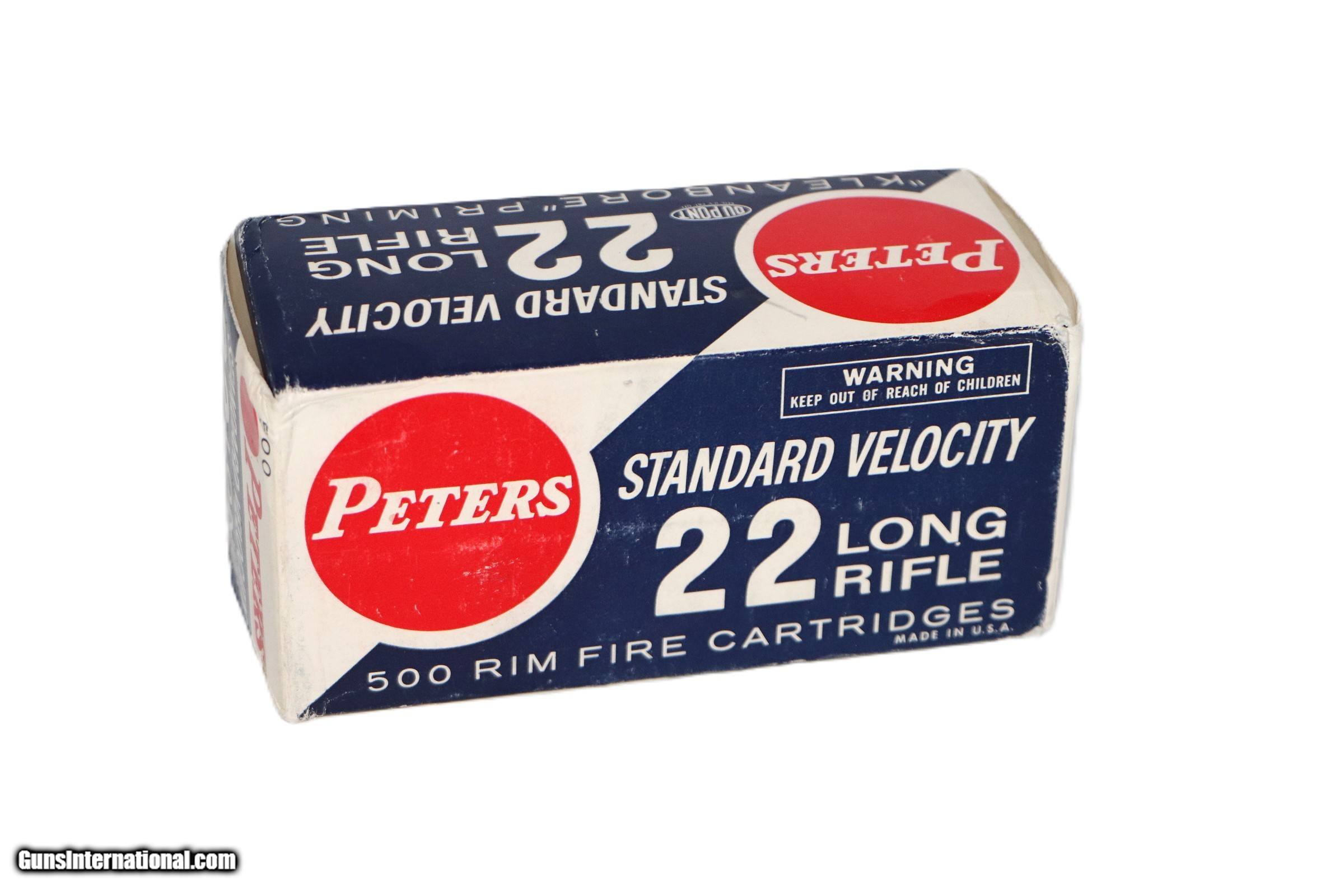 Description: Peters, Standard Velocity ''Kleanbore Priming'', .22 Long Rifle, Full, 500rds. 1pc. Red white & blue brick, brick is solid with excellent color, inside boxes are excellent. Add 18.50 S+H SOLD Rifle Caliber: .22 Long Rifle |