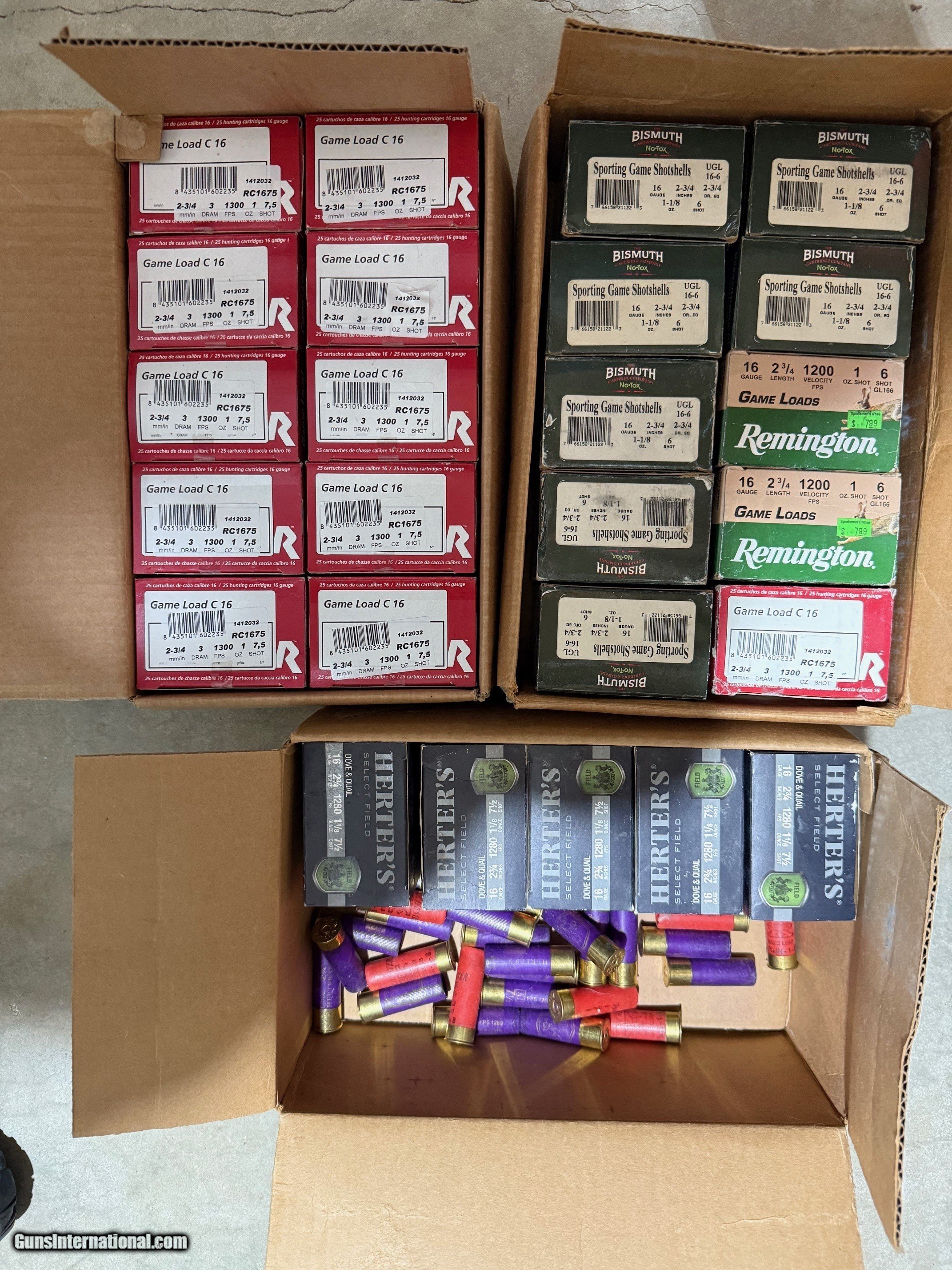 Description: REPRICED BELOW RETAIL Six full boxes (25 rounds each) of Estate Cartridge Co., #6 Bismuth non-toxic shot, 2 3/4", with six extra loose rounds. Eleven boxes of Rio #7.5 lead shot, 1 oz. 2 3/4", 1300 fps. Five full boxes Herters 1 1/8, #7.5 lead shot, 1280 fps. One bag of assorted loose 16 gauge, 2 3/4" lead dove loads. 28 rounds total. Two full boxes (25 rounds each) of Remington 16 gauge, Game Loads, 1200 fps, #6 lead shot. Buyer pays freight. Freight charges not refundable. Will provide shipping cost upon request. Shotgun Gauge: 16 Gauge Price: $575.00 Pay with