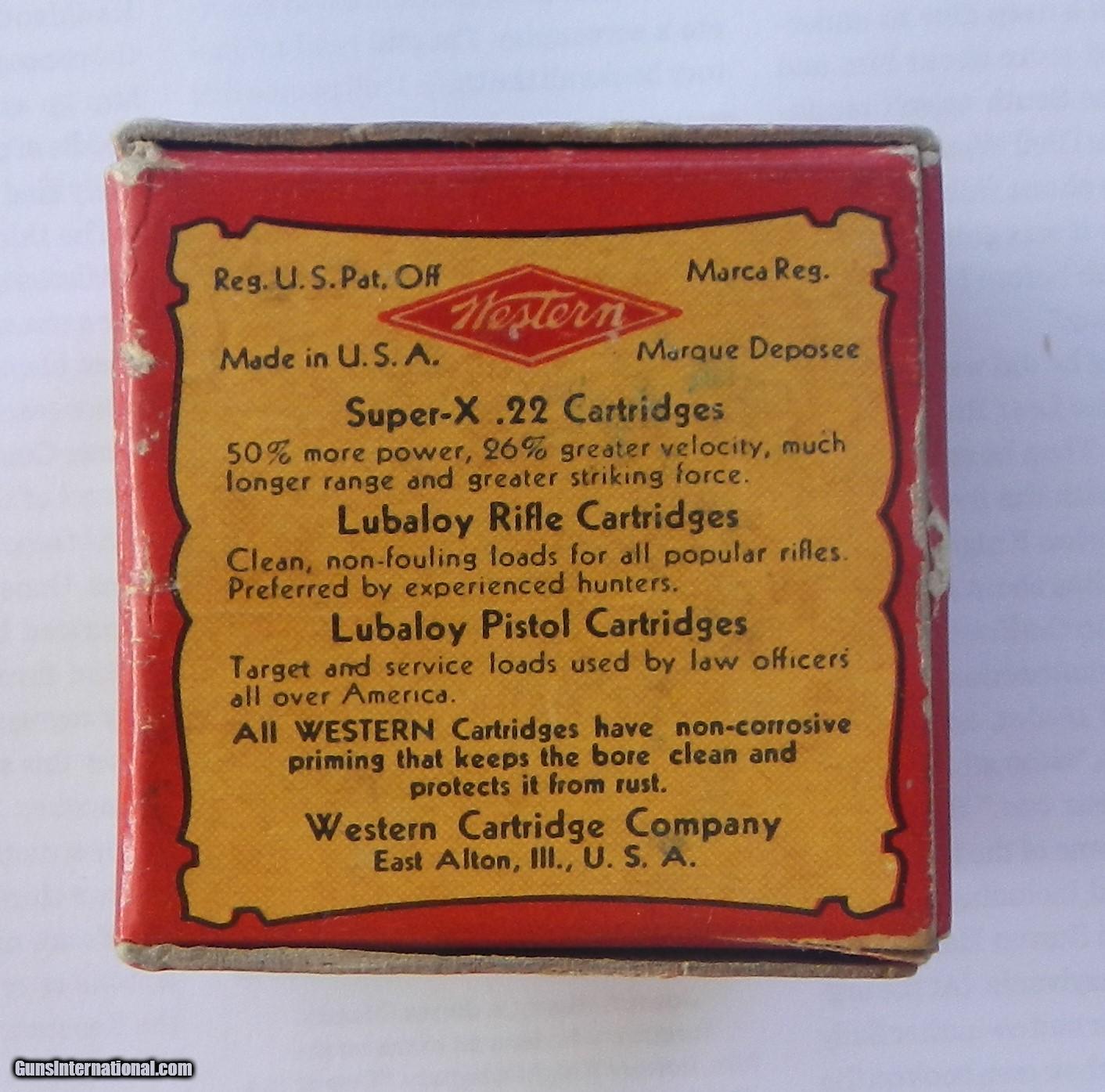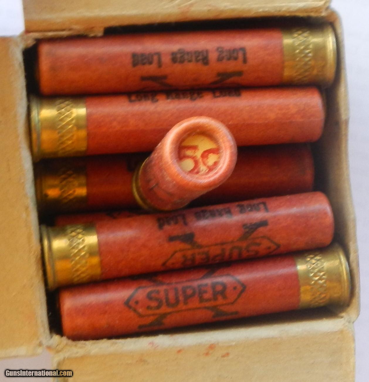 Description: Western Cartridge Co. first one piece 410 shot shell box introduced in 1933. Super X Long Range Short Shot String .410, 2 1/2 inch shells with number 5 Chilled Shot, full and correct wth rolled crimped shells. Both bottom and top inside tuck flaps are attached as are the outside flaps. All sides have been photographed for your review, ammo sold as collector ammo only. Price does not include UPS shipping. Thanks SOLD |